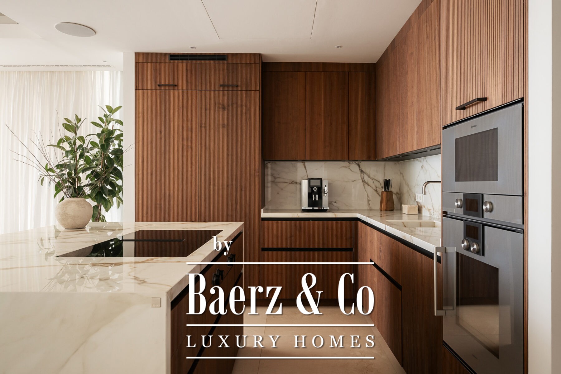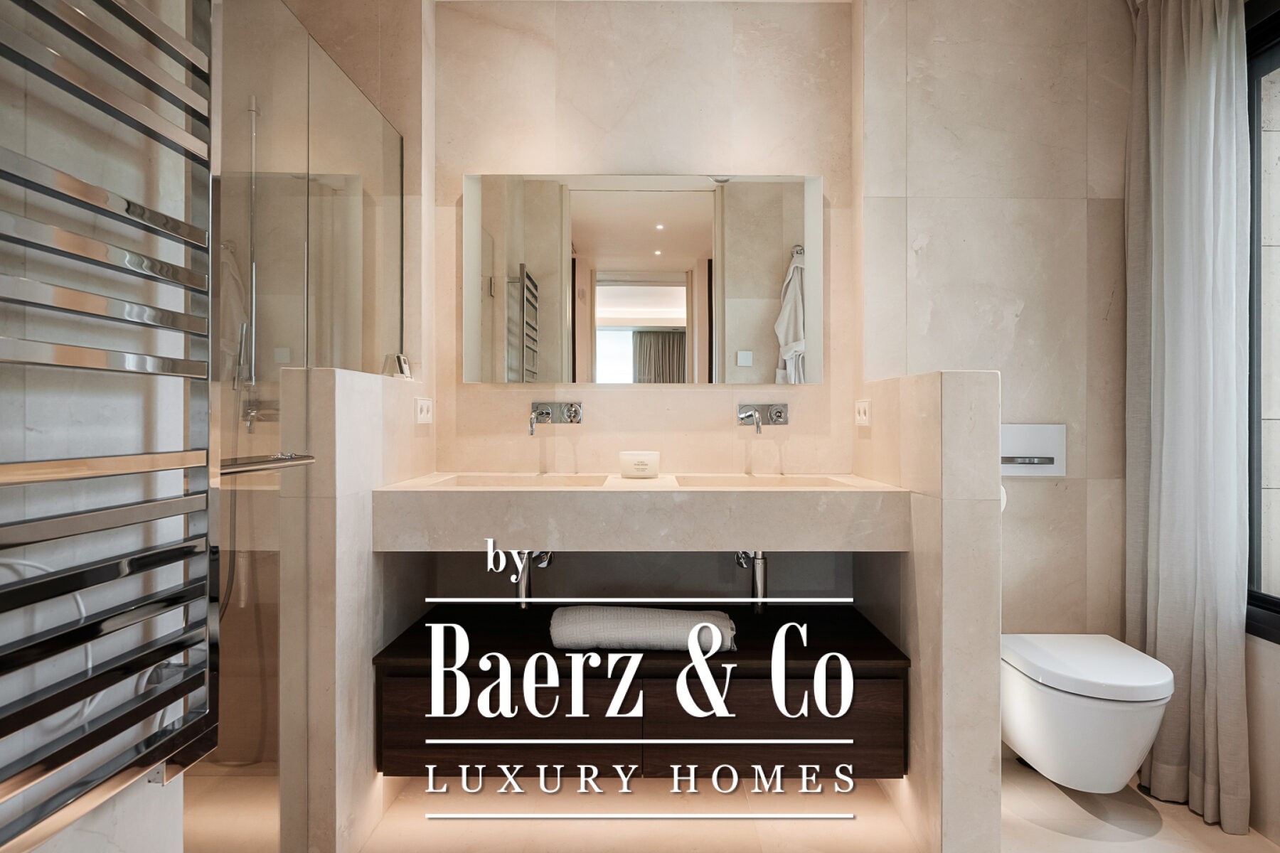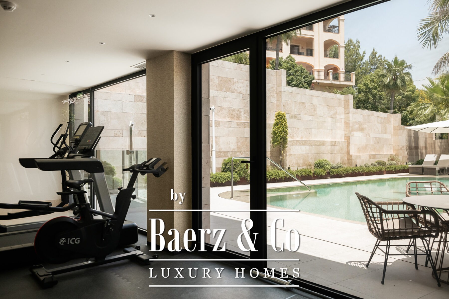 Arriving through a central hall, the apartment’s layout divides efficiently between social and private zones. The open-plan living area flows into a kitchen appointed with Gaggenau and Miele appliances, a striking floor-to-ceiling wine display, and fully automated glazing that merges indoor living with the terrace. In the private wing, the master suite features a walk-in wardrobe and full bathroom, accompanied by two further en-suite bedrooms facing the tranquil gardens. Additional amenities include a laundry room, smart home systems, premium materials throughout, and two garage spaces with a registered electric buggy and storage room.