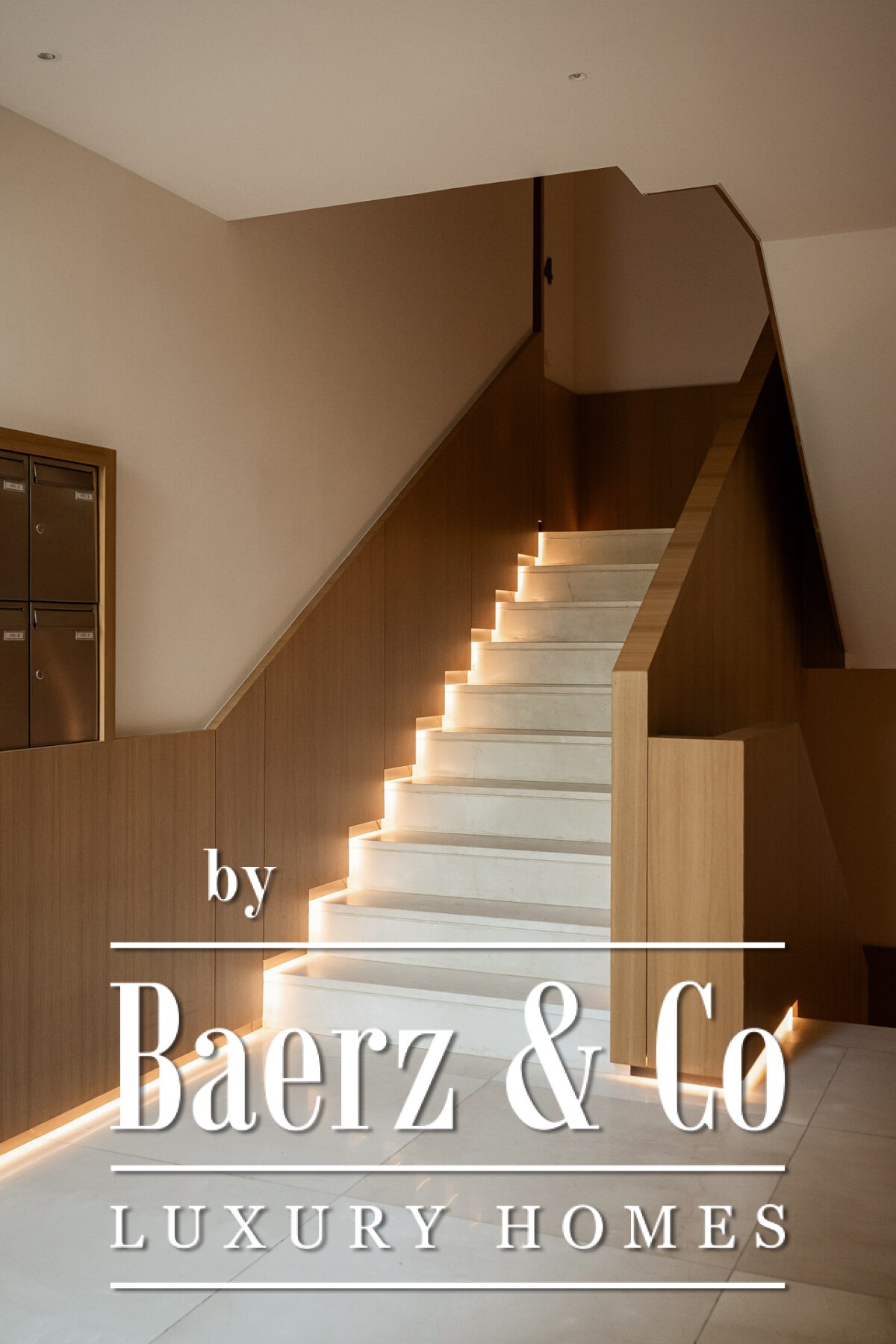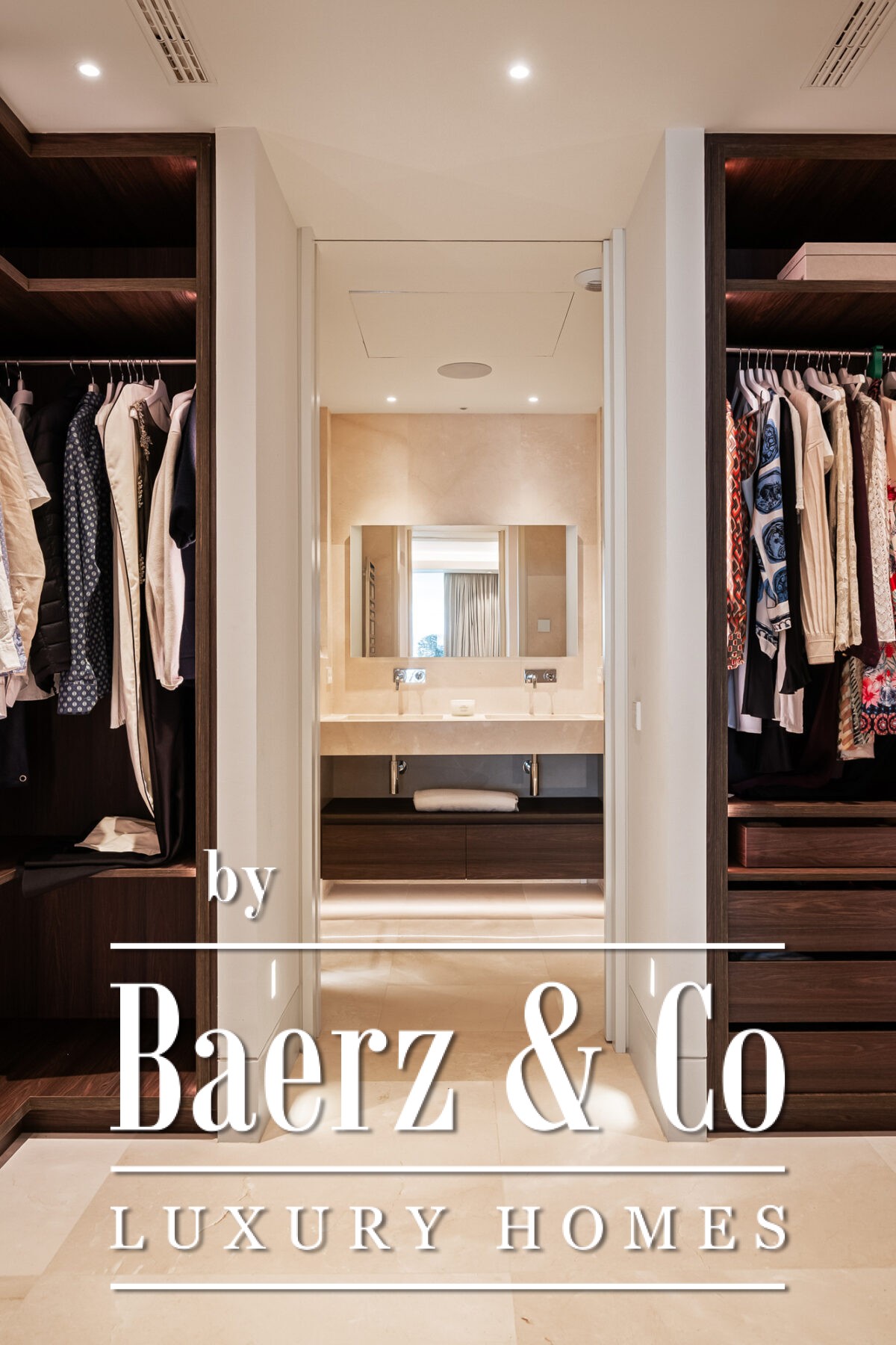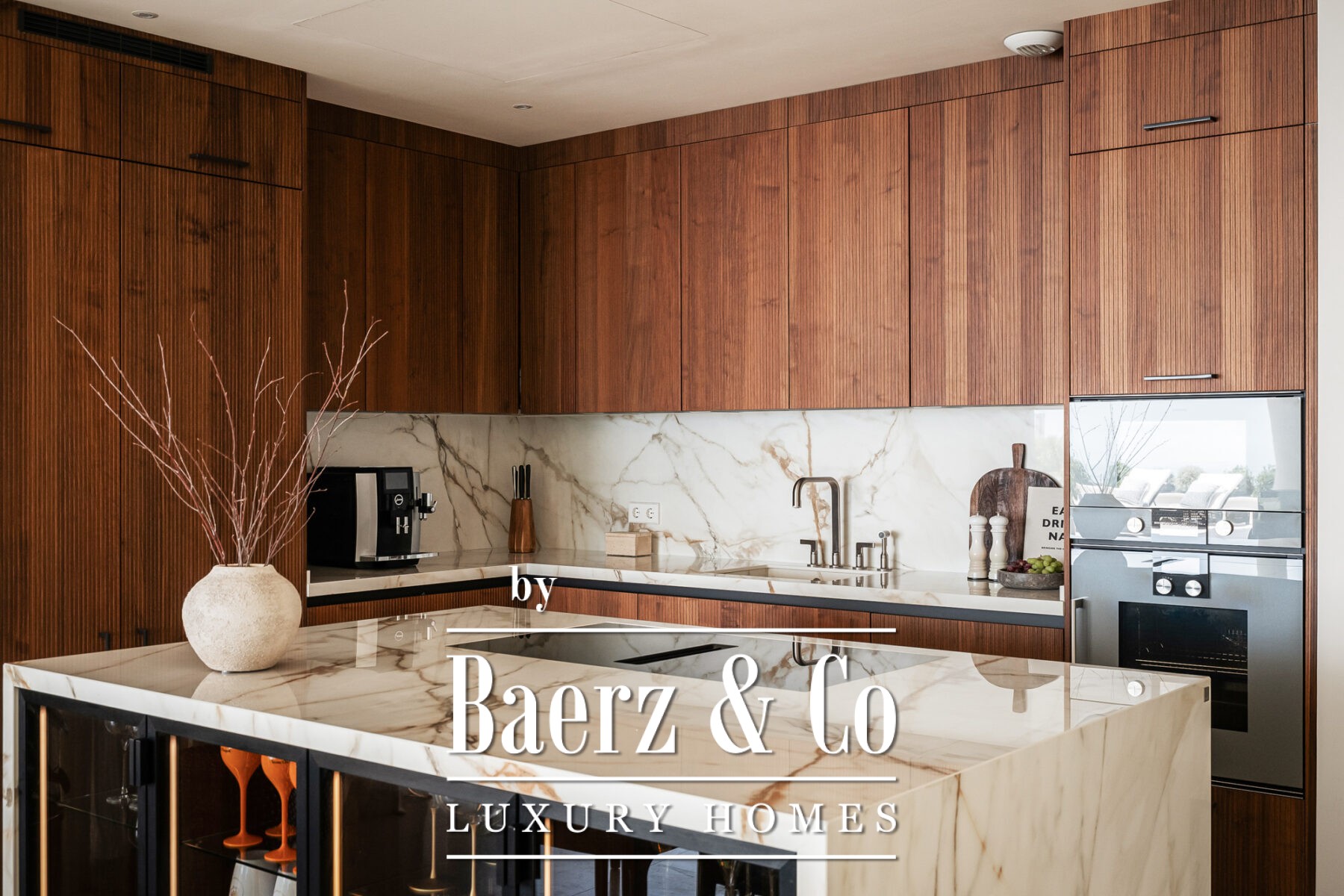 Arriving through a central hall, the apartment’s layout divides efficiently between social and private zones. The open-plan living area flows into a kitchen appointed with Gaggenau and Miele appliances, a striking floor-to-ceiling wine display, and fully automated glazing that merges indoor living with the terrace. In the private wing, the master suite features a walk-in wardrobe and full bathroom, accompanied by two further en-suite bedrooms facing the tranquil gardens. Additional amenities include a laundry room, smart home systems, premium materials throughout, and two garage spaces with a registered electric buggy and storage room.