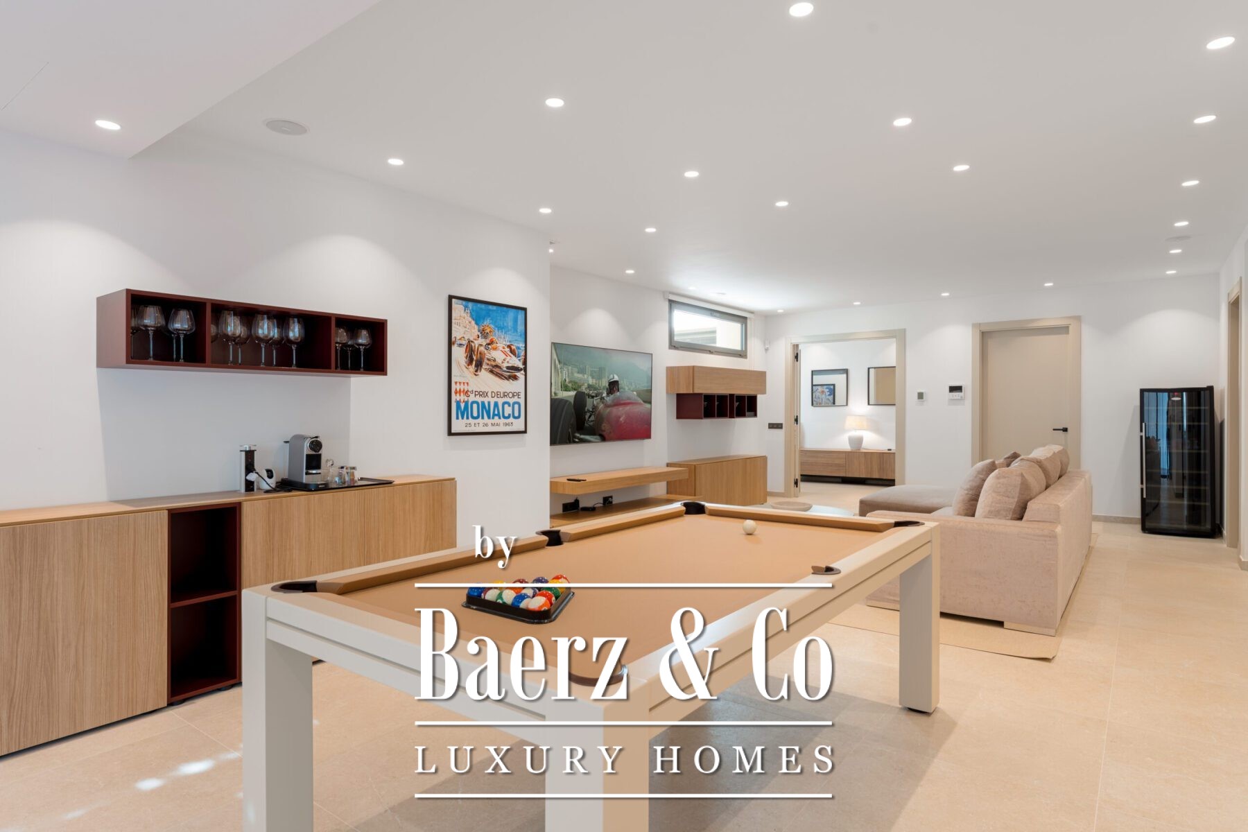 With a southwest orientation, the villa captures natural light and sunset views across the valley. Entering through a grand circular driveway that accommodates 10 cars, the sense of arrival is quietly impressive. The 453 m² interior unfolds into bright, open-plan spaces featuring soaring ceilings, wood accents, and elegant tile work that enhance a warm, inviting atmosphere. Three en-suite bedrooms on the main level have large windows opening directly onto terraces, seamlessly connecting indoors to a 1,340 m² plot with manicured gardens. The lower level offers two additional bedrooms, a games room, a lounge area, and a fully fitted laundry room, ensuring both social space and privacy.
