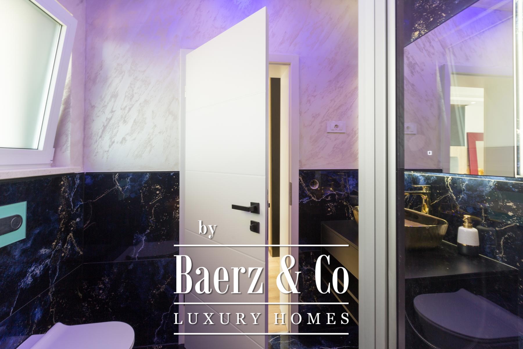 Medulin, one of the most prestigious tourist destinations on the southwestern coast of Istria, where this extraordinary, modern villa awaits, setting new standards of luxury and comfort. Situated on a 450 m2 plot, this meticulously designed new construction from 2024 spans an impressive 200 m2 of net usable area across two levels, offering a perfect blend of sophisticated design and functionality. The proximity of just 400 meters from the sea and beautiful beaches ensures easy access to the crystal-clear Adriatic, while its south orientation guarantees abundant sunlight throughout the day.Upon entering the ground floor of the villa, you will immediately be captivated by the spaciousness and open-plan concept that seamlessly connects the indoor and outdoor living areas. The contemporarily equipped kitchen, featuring the latest appliances and elegant lines, forms the heart of the home, perfect for preparing gastronomic delights. It naturally flows into the opulent living room, bathed in natural light filtering through large glass walls. These expansive glass surfaces not only provide a magnificent view of the meticulously landscaped exterior but also offer direct access to the covered terrace and the main highlight of the outdoor space - an impressive swimming pool.The outdoor area is a true oasis of peace and relaxation. The swimming pool, surrounded by a high stone wall from which a calming waterfall cascades, creates a unique ambiance. Carefully selected green foliage dominates the entire courtyard, creating the impression of a tropical garden that perfectly blends with the villa's architecture, imbuing it with warmth and natural charm. Adjacent to the pool, there is a summer kitchen and a barbecue area, ideal for gatherings and enjoying Mediterranean evenings under the stars. The entire exterior is designed with the aim of providing maximum privacy and relaxation, inviting you to carefree enjoyment in a luxurious setting.An internal staircase, a masterpiece of modern design and lighting, leads you to the upper floor of the villa. Specially designed lighting, subtly highlighted in the evenings, creates an atmosphere of warmth and elegance