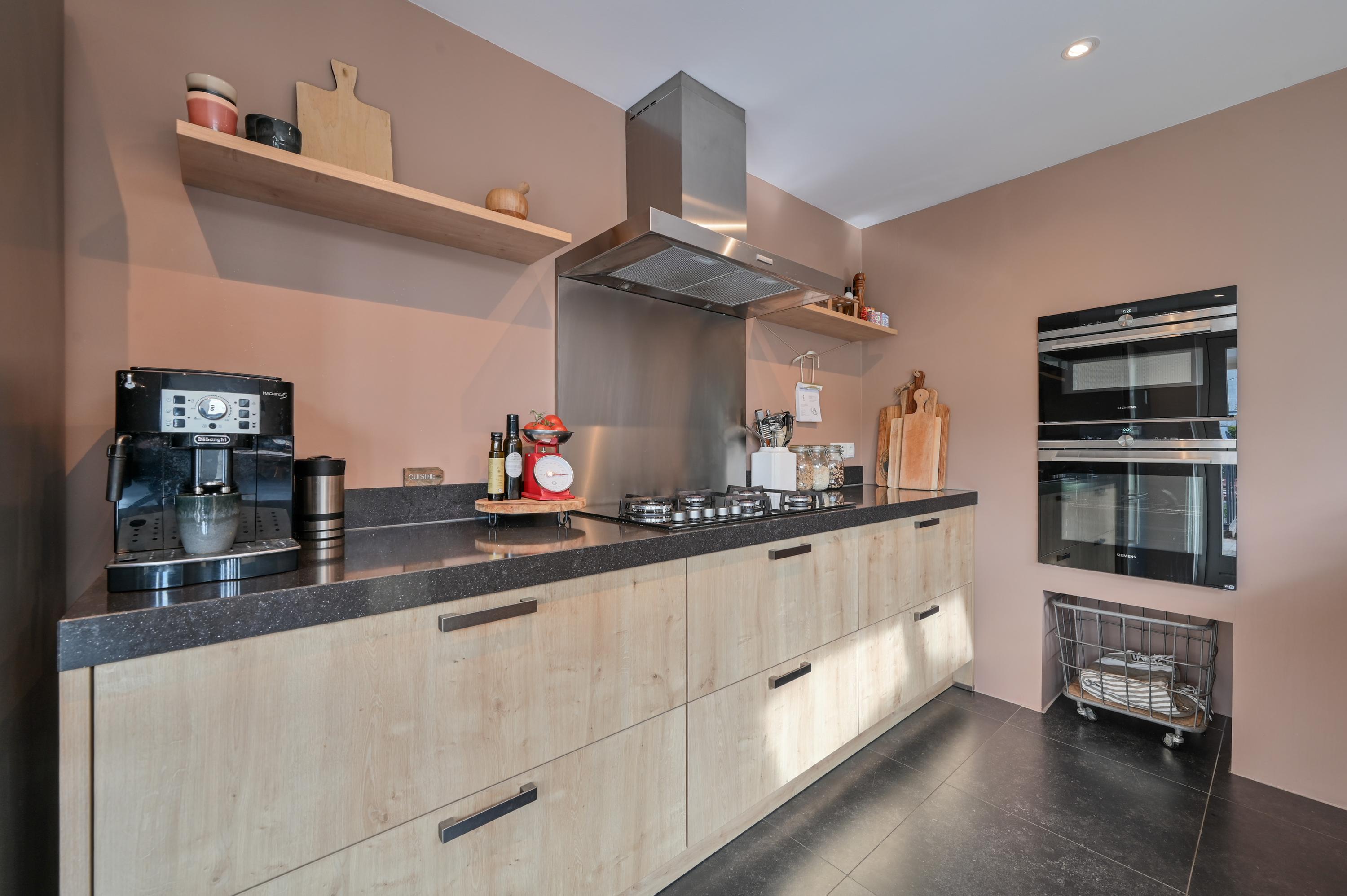 At the rear, the house has been extended to create a spacious open-plan kitchen that truly forms the centerpiece of the home. A skylight allows beautiful natural light to flood in throughout the day. The tiled floor with underfloor heating ensures comfort in every season. The kitchen is both practical and luxurious, featuring a kitchen island with sink, dishwasher, and a Grohe boiling water tap. On the opposite side, you’ll find the cooking area with a 5-burner gas stove, oven, and combination oven. The kitchen easily accommodates a large dining table, making it the perfect setting for long dinners and social gatherings. French doors and a separate door provide direct access to the garden, seamlessly connecting indoor and outdoor living.