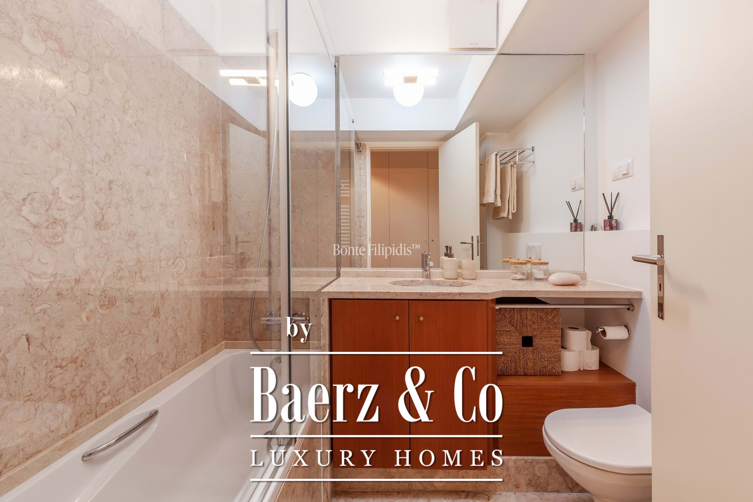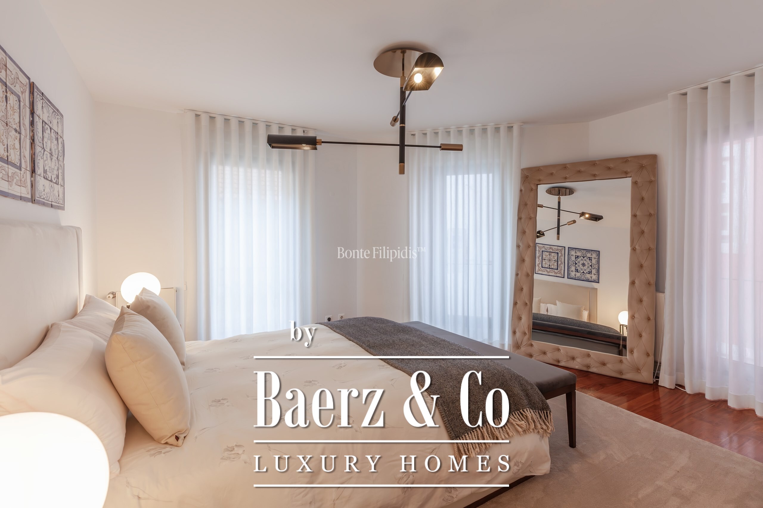 The kitchen, bathed in southwest light, is fitted with SMEG and Siemens appliances, Lioz limestone, and ample storage, serving both daily ease and extended hospitality. Afzelia hardwood flooring, contemporary bathrooms, and central heating further speak to the quiet excellence of this home. The apartment is offered mostly furnished, supporting seamless relocation.