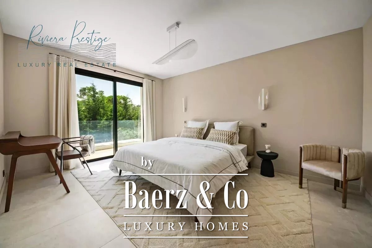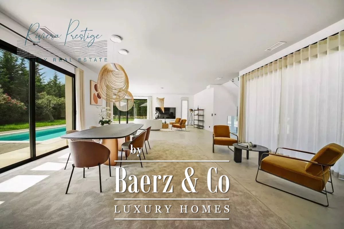 Villa Mougins stands as a contemporary sanctuary, defined by its refined architectural lines and expansive bay windows that usher abundant natural light throughout 380 m² of living space. This property welcomes you into a world where indoor elegance seamlessly transitions to outdoor serenity, with terraces that open toward a flourishing garden and swimming pool, forming a setting for tranquil repose or quietly memorable gatherings.