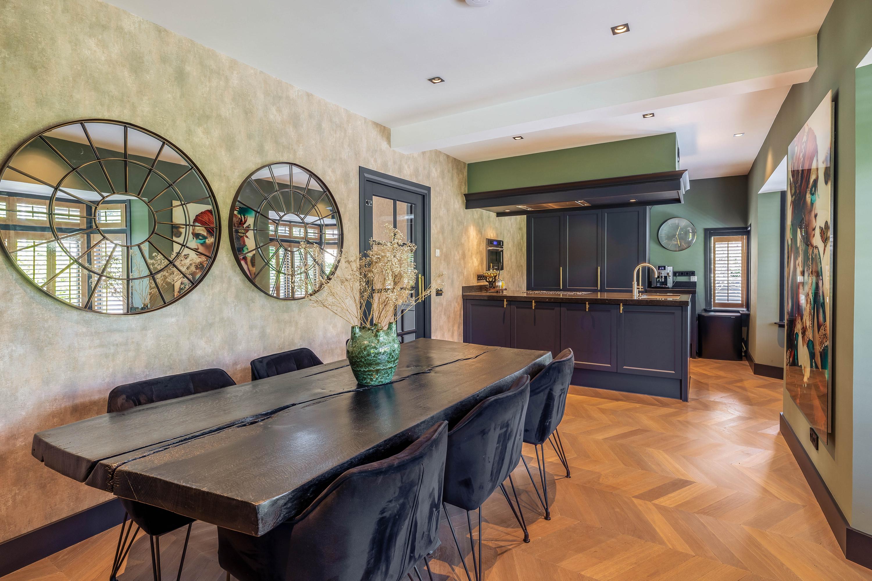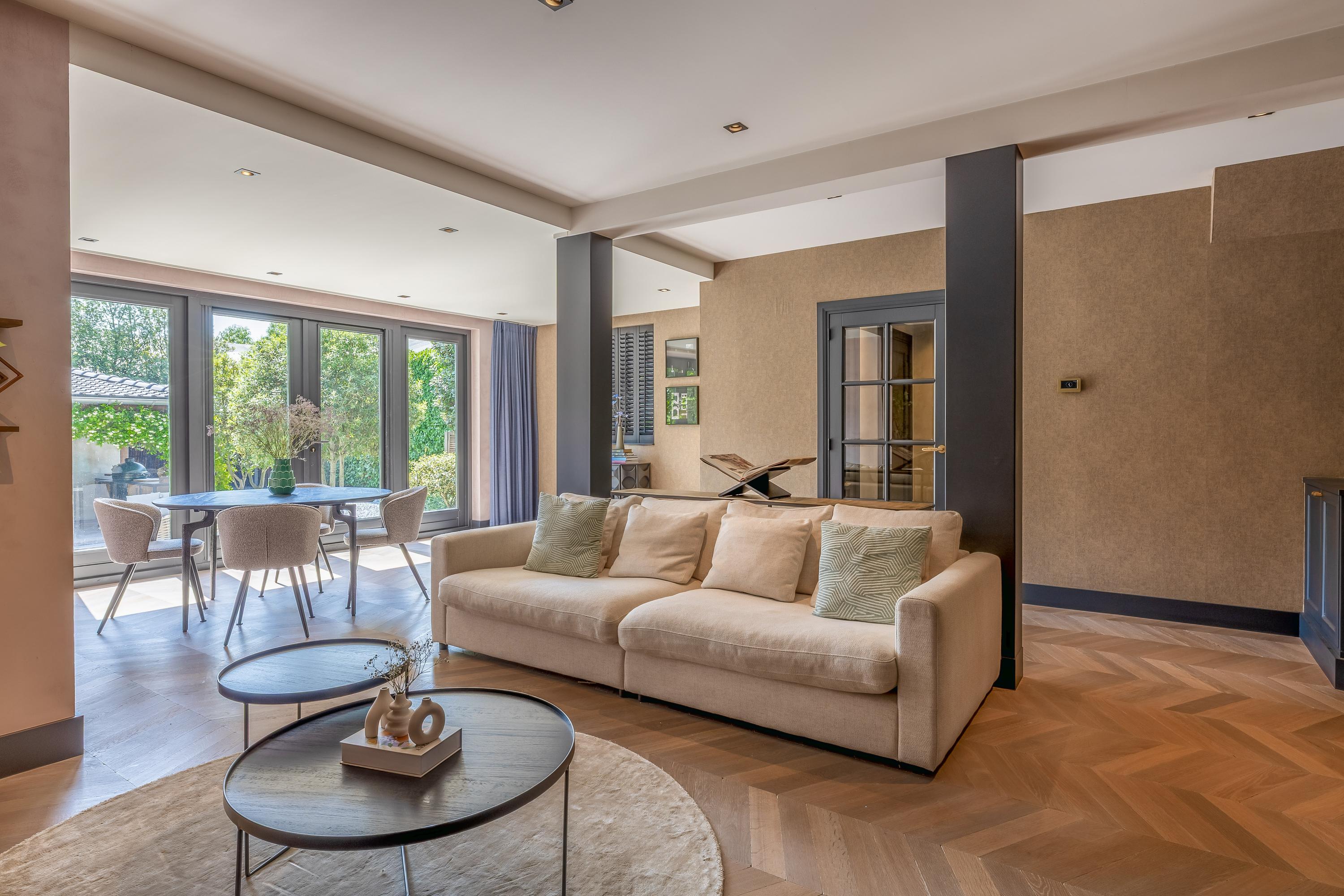 De riante woonkamer ademt rust en klasse dankzij een stijlvolle wandafwerking, een prachtige vloer in Hongaarse punt en openslaande deuren naar de tuin. De grote raampartijen zorgen voor een natuurlijke lichtinval, wat bijdraagt aan de warme, uitnodigende ambiance van het huis.