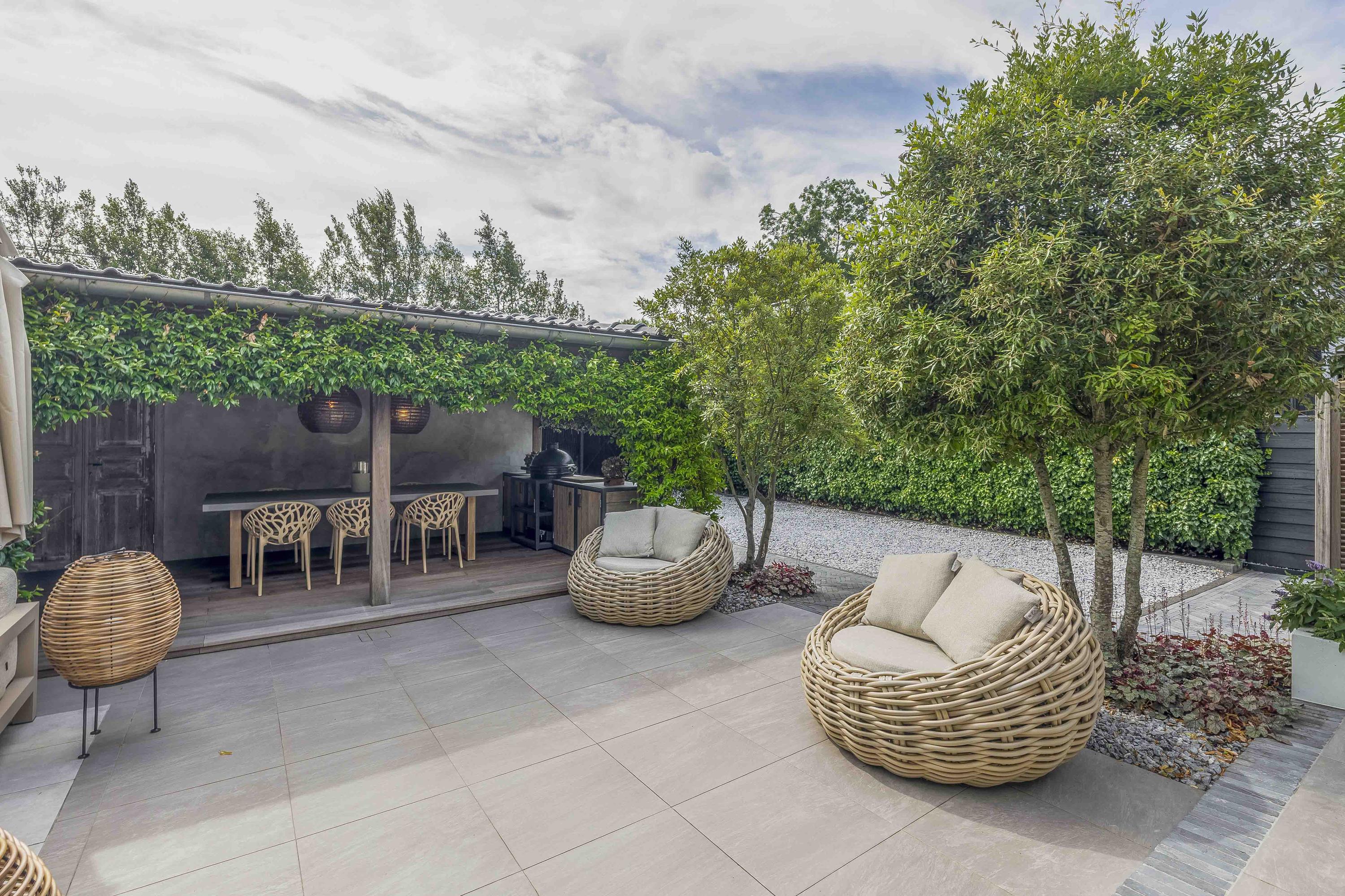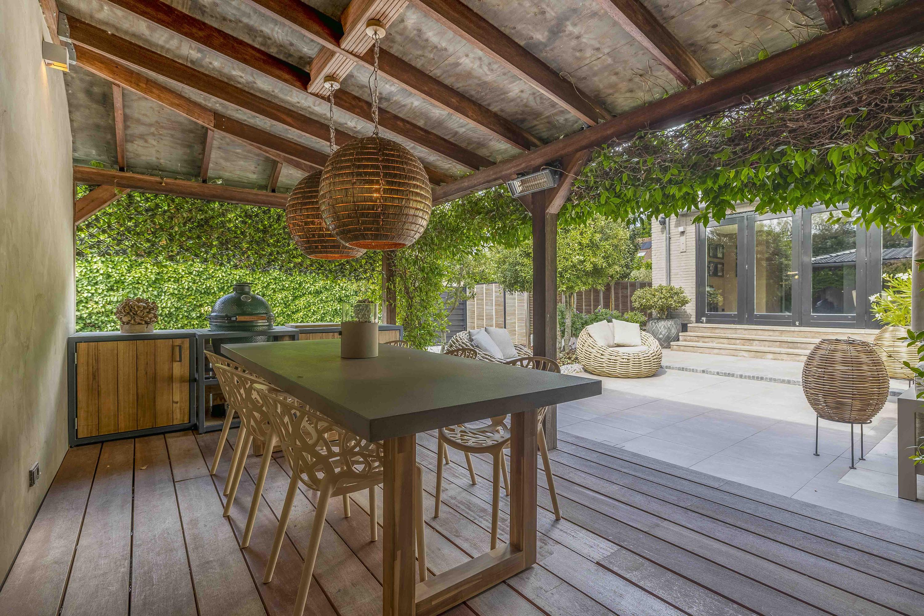Achterin de tuin bevindt zich een stijlvolle overkapping met buitenkeuken en open haard – perfect voor ontspannen zomeravonden.