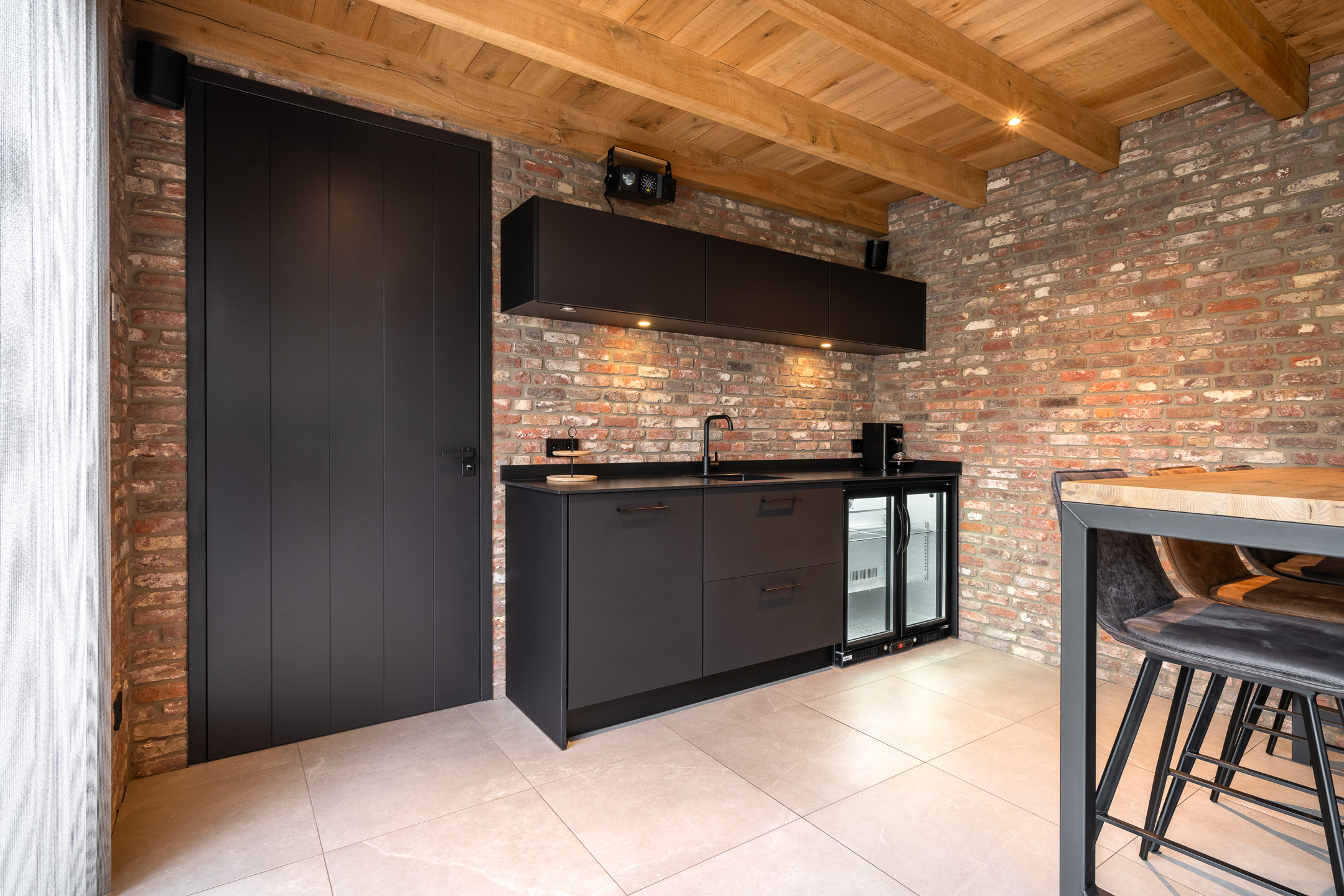 Situated in the garden is a fully insulated guesthouse, complete with a bar and restroom. This versatile space is ideal for use as guest accommodations, a home office, or a recreational area.