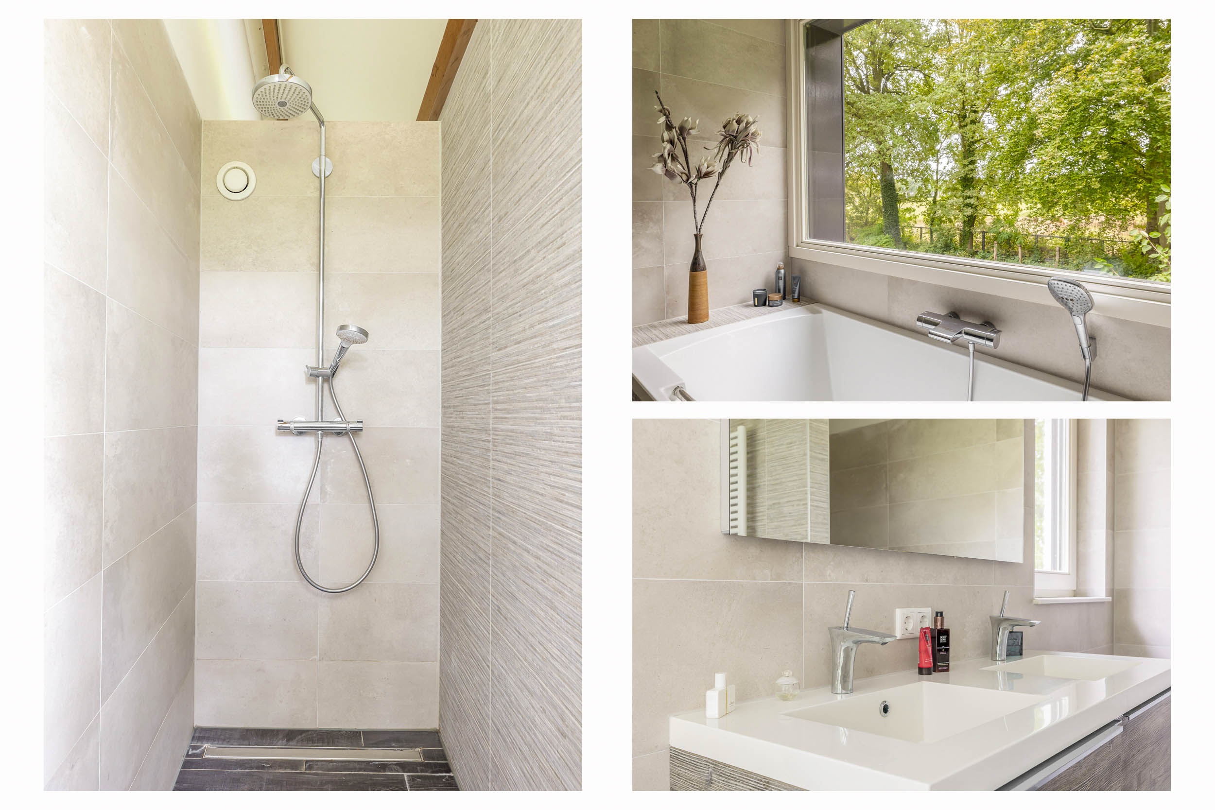 The third bedroom, the master bedroom, is also located at the rear. What makes this room unique is the large window overlooking the wooded garden. The en-suite bathroom is located directly next to this bedroom. This bathroom is fully tiled in a light, modern colour. There is a walk-in shower with hand and rain shower, a double sink with cabinet and a bathtub overlooking the garden. There is also a mechanical extraction system and windows for ventilation, as well as underfloor heating.