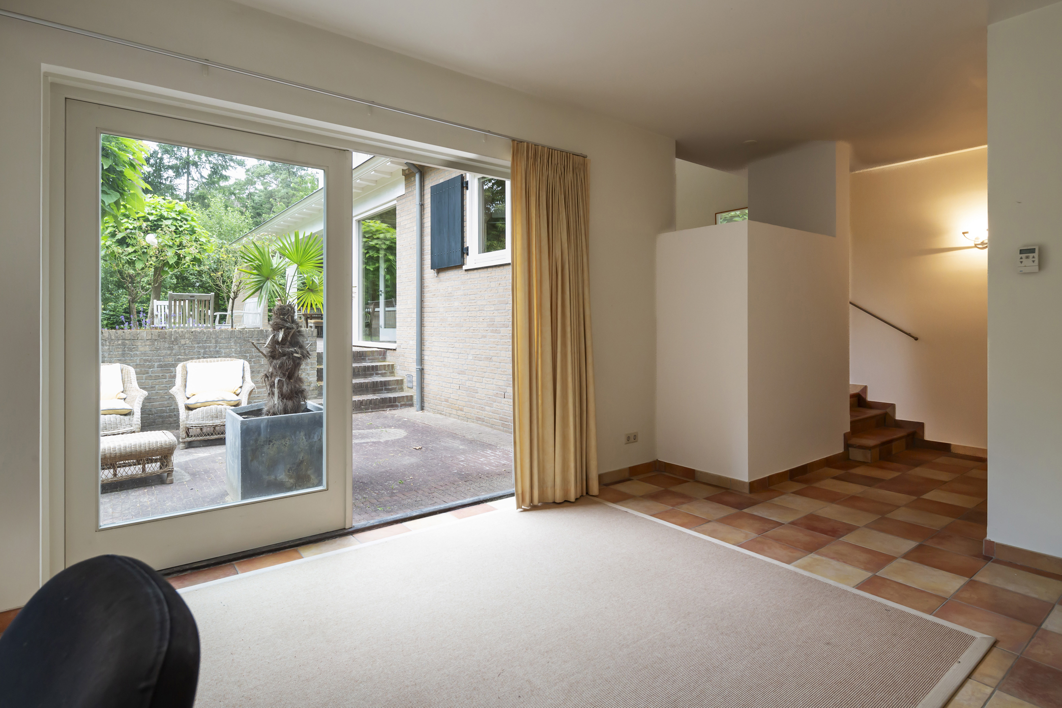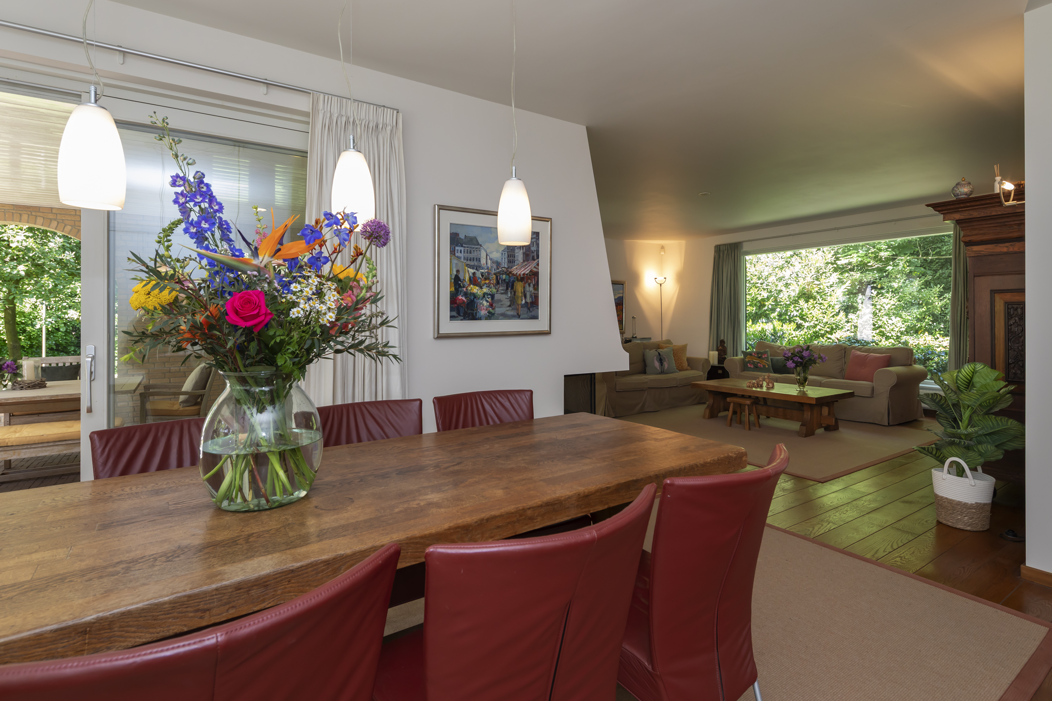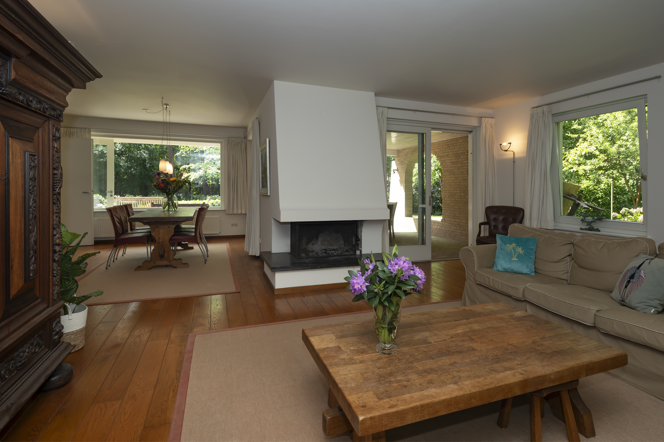 The attractive living room with fireplace is wonderfully light thanks to the large windows and has a view of the fantastic garden. The double large sliding doors provide access to the spacious covered terrace.