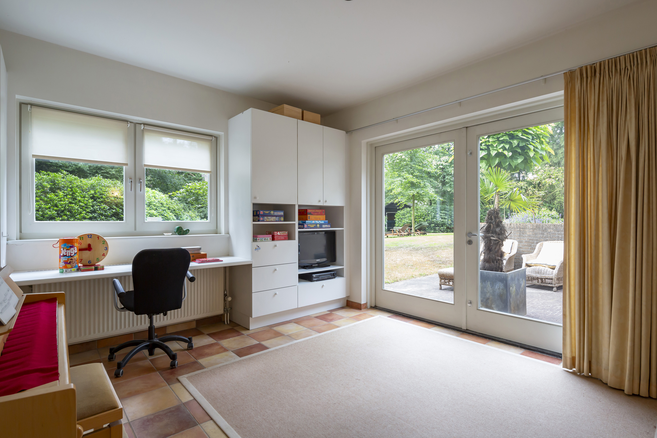 A multifunctional room with patio doors is also accessible from the kitchen, this could be a bedroom, but is suitable for multiple purposes. For example, it could also serve well as a playroom/game room/chill room for the children or a cozy bar.