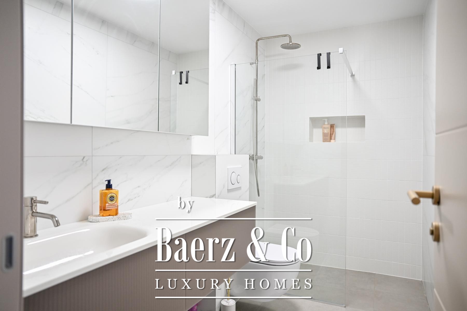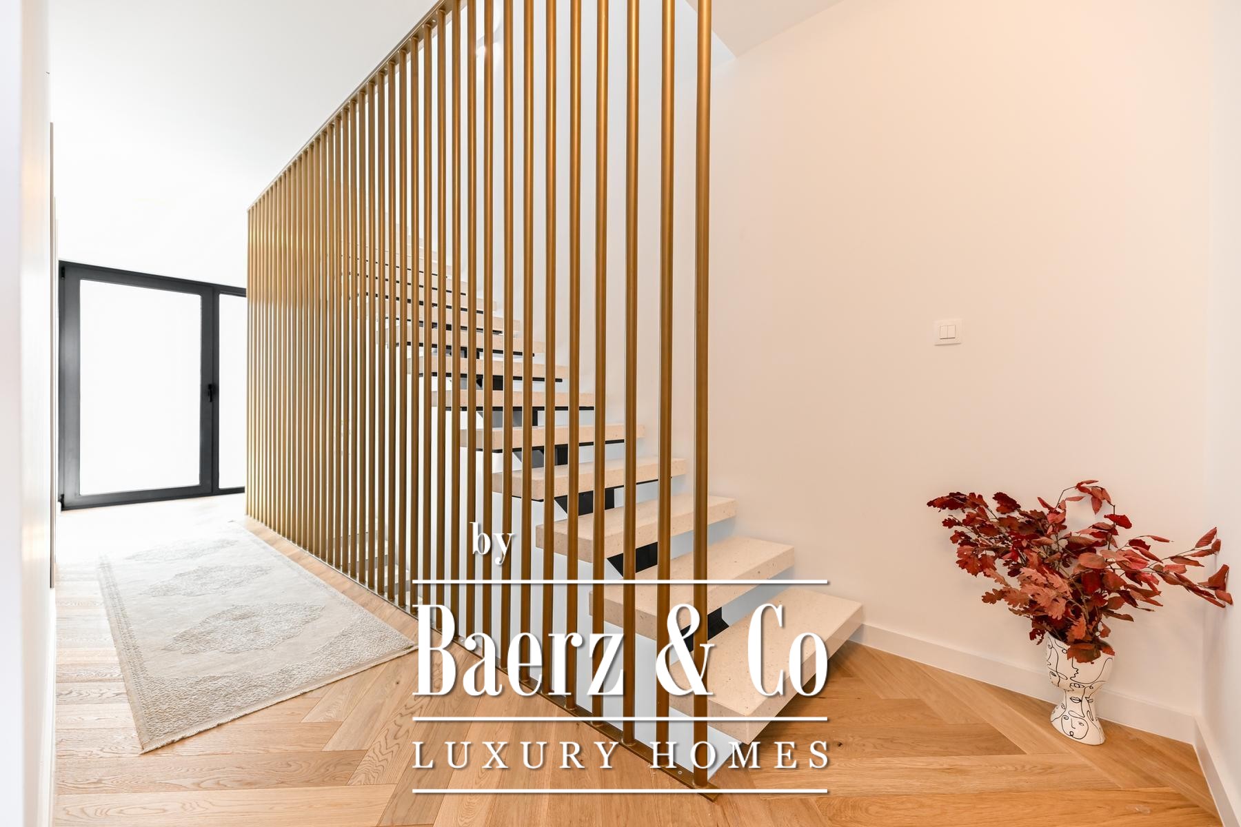 The basement level provides a bathroom, utility room, and storage space covering 53.9 m², equipped with two air conditioning units and adaptable for uses such as a gym or playroom. On the ground floor, the open-plan living area integrates a kitchen with the latest Bosch appliances and a welcoming living room, complemented by a bathroom. Ascending to the first floor, you find two bedrooms and a shared bathroom; one includes its own dressing room, while the second, almost 20 m² and fully glazed, frames striking views of the sea.