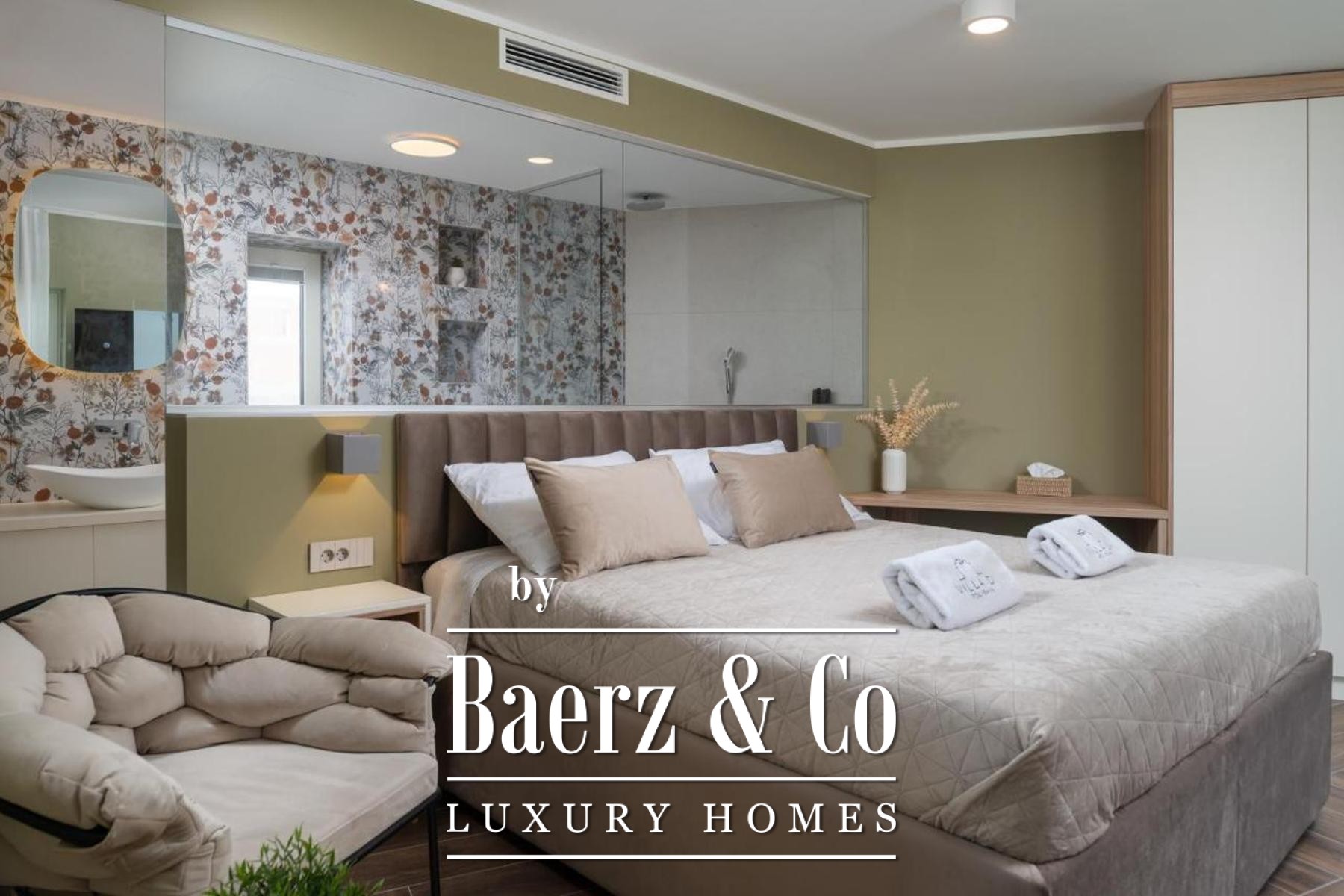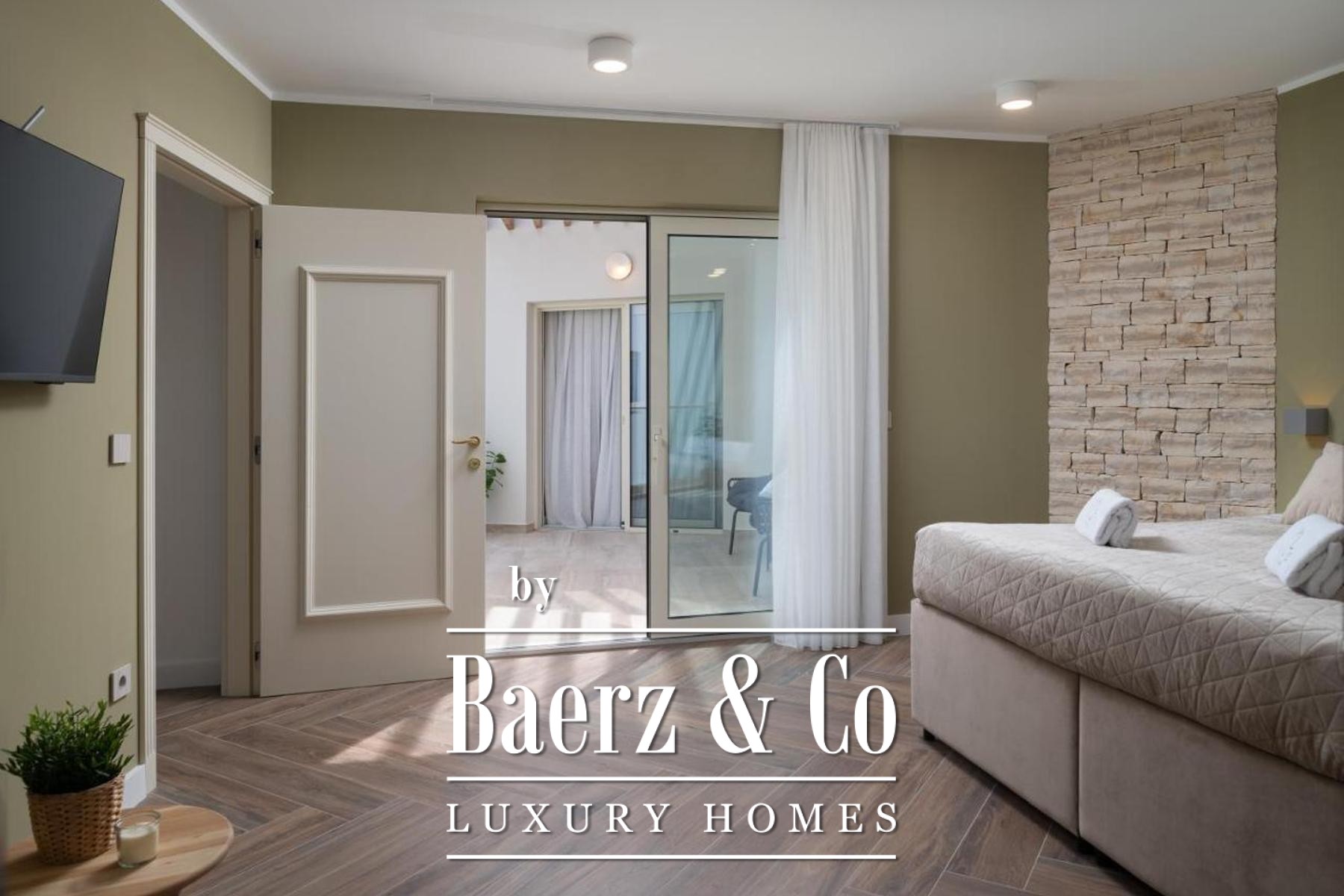 On the lower level, a game room adapts effortlessly to leisure or cinema needs. The upper floor houses four bedrooms, each with an en-suite bathroom and walk-in closet. Two principal suites command views of the Velebit mountain range, while the remaining bedrooms share a spacious terrace with similar panoramas. Offering privacy, light, and a constant dialogue between interior and landscape, this luxury villa for sale in Poličnik is a retreat attuned to both solitude and gathering.