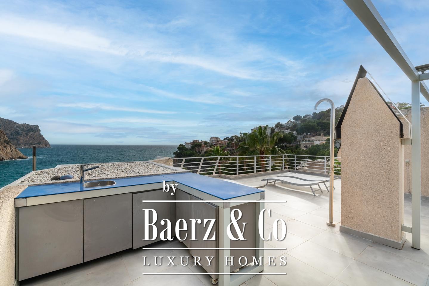 A private rooftop terrace crowns the home, inviting possibility for a tailored lounge with SPA or Jacuzzi, where sun and sky meet the deep blue of the sea. The southern orientation ensures sunlight throughout the day, while the elevated position captures evocative evening light and partial views of Dragonera Island, particularly vivid at sunset.