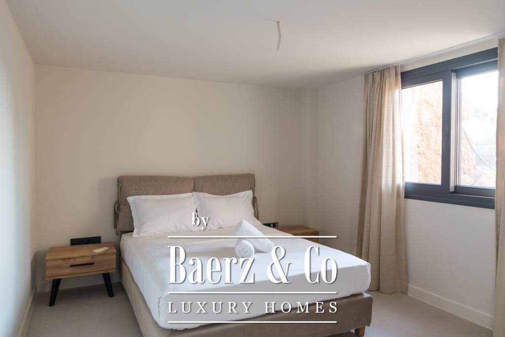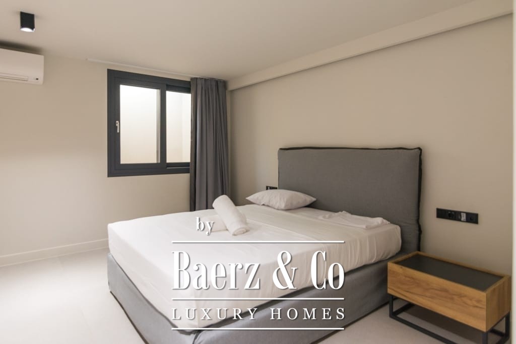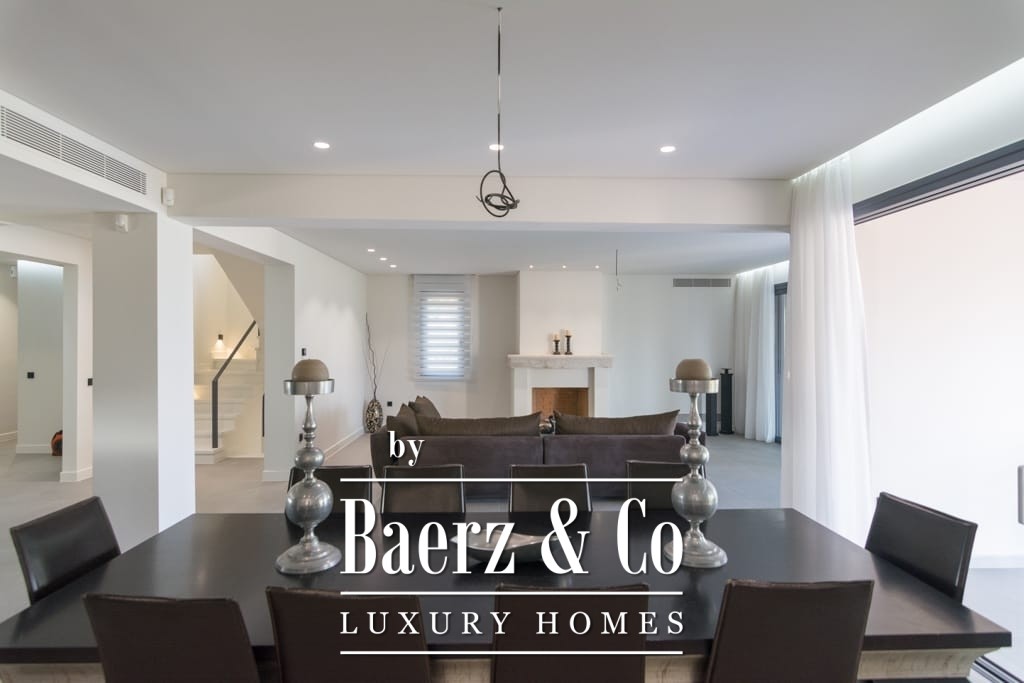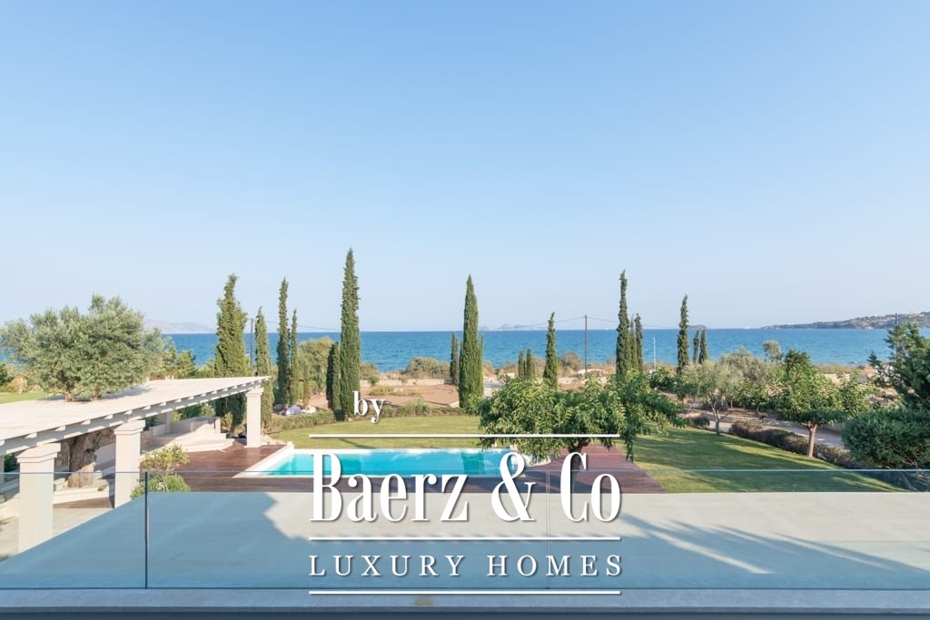 Throughout, interiors are shaped by understated luxury, merging timeless Mediterranean character with contemporary comfort. Striking wooden roof details and expansive aged marble floors create a tactile sense of elegance, while generous openings allow light to move freely across spacious reception areas. The living and dining areas flow out to broad terraces and wide balconies, perfectly framing panoramic sea views toward Spetses, Hydra, and the horizon beyond.