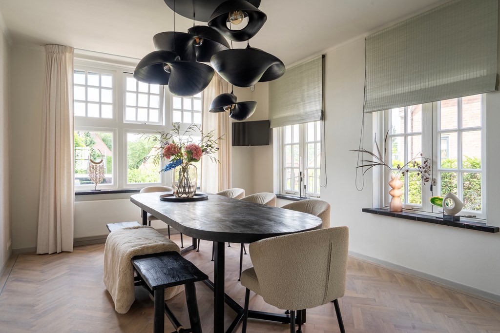 On the other side of the hall is the luxurious kitchen. Spacious and modern, it is fitted with high-quality built-in appliances and offers extensive work and storage space—a dream for any cooking enthusiast, with plenty of room for serious cooking and baking. The kitchen flows seamlessly into the dining room, an inviting space that comfortably accommodates larger gatherings—ideal for relaxed family dinners or more formal occasions with friends. From the kitchen you also have access to the practical utility room, perfect for extra storage and as a laundry area.