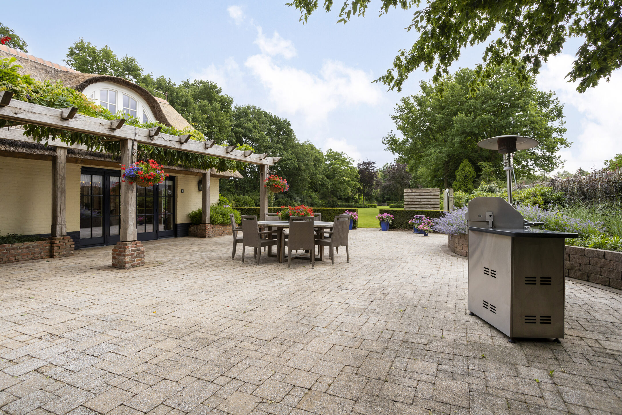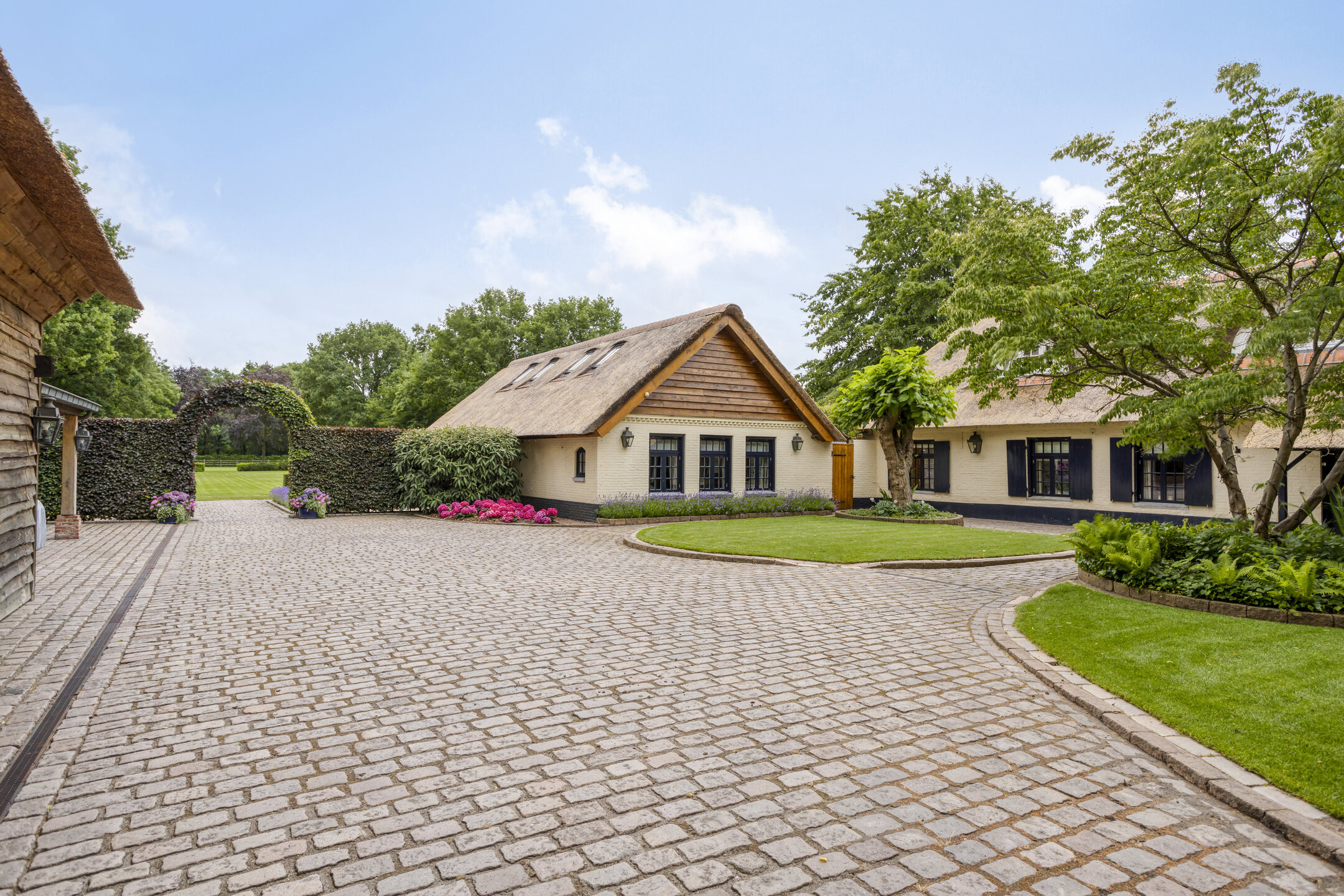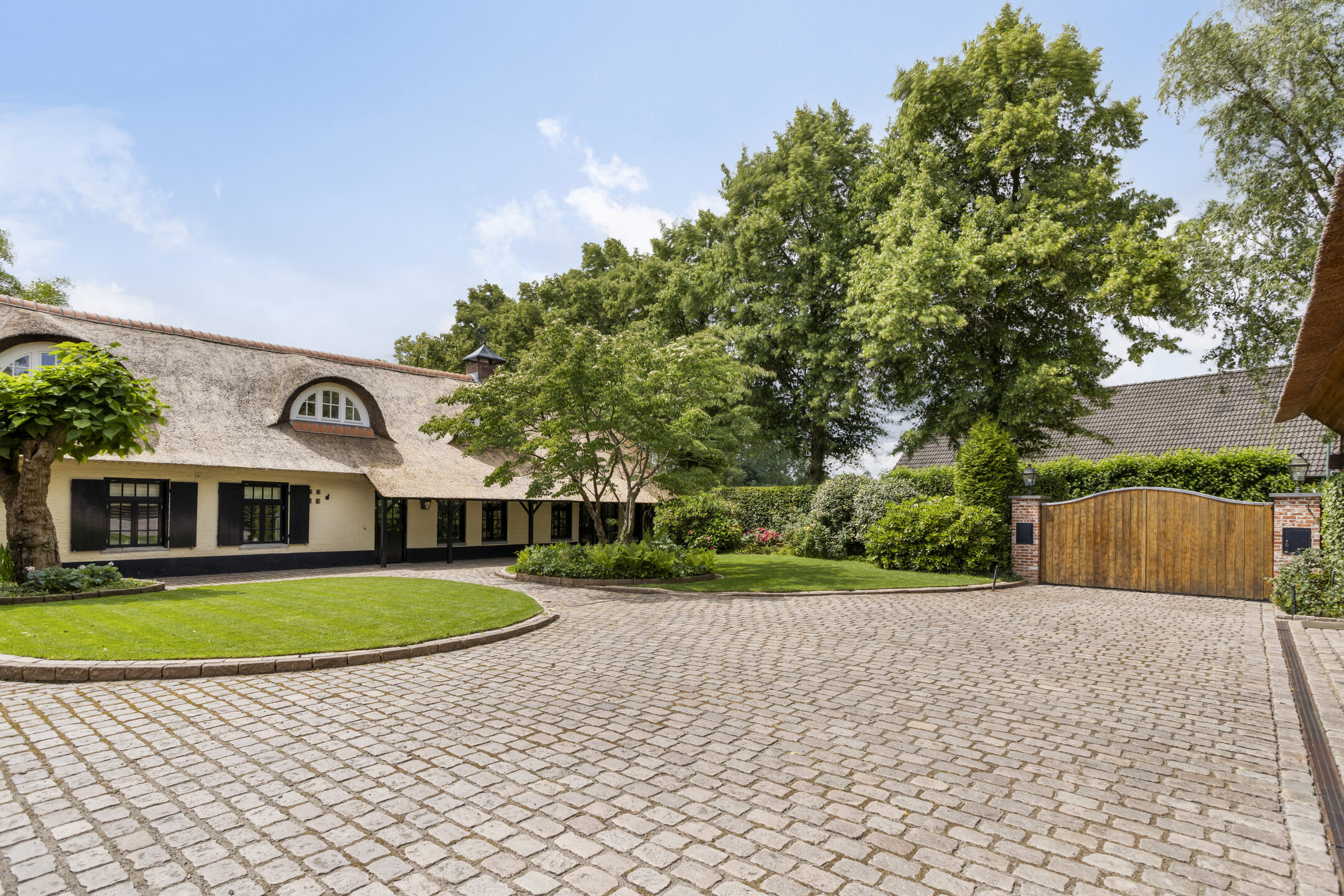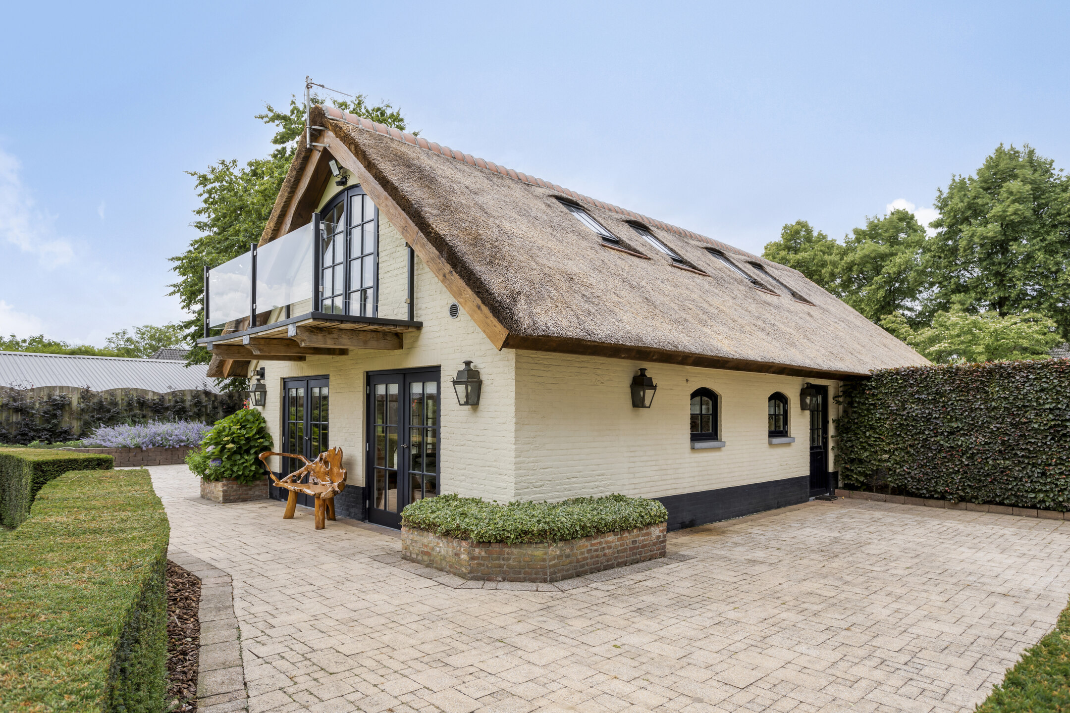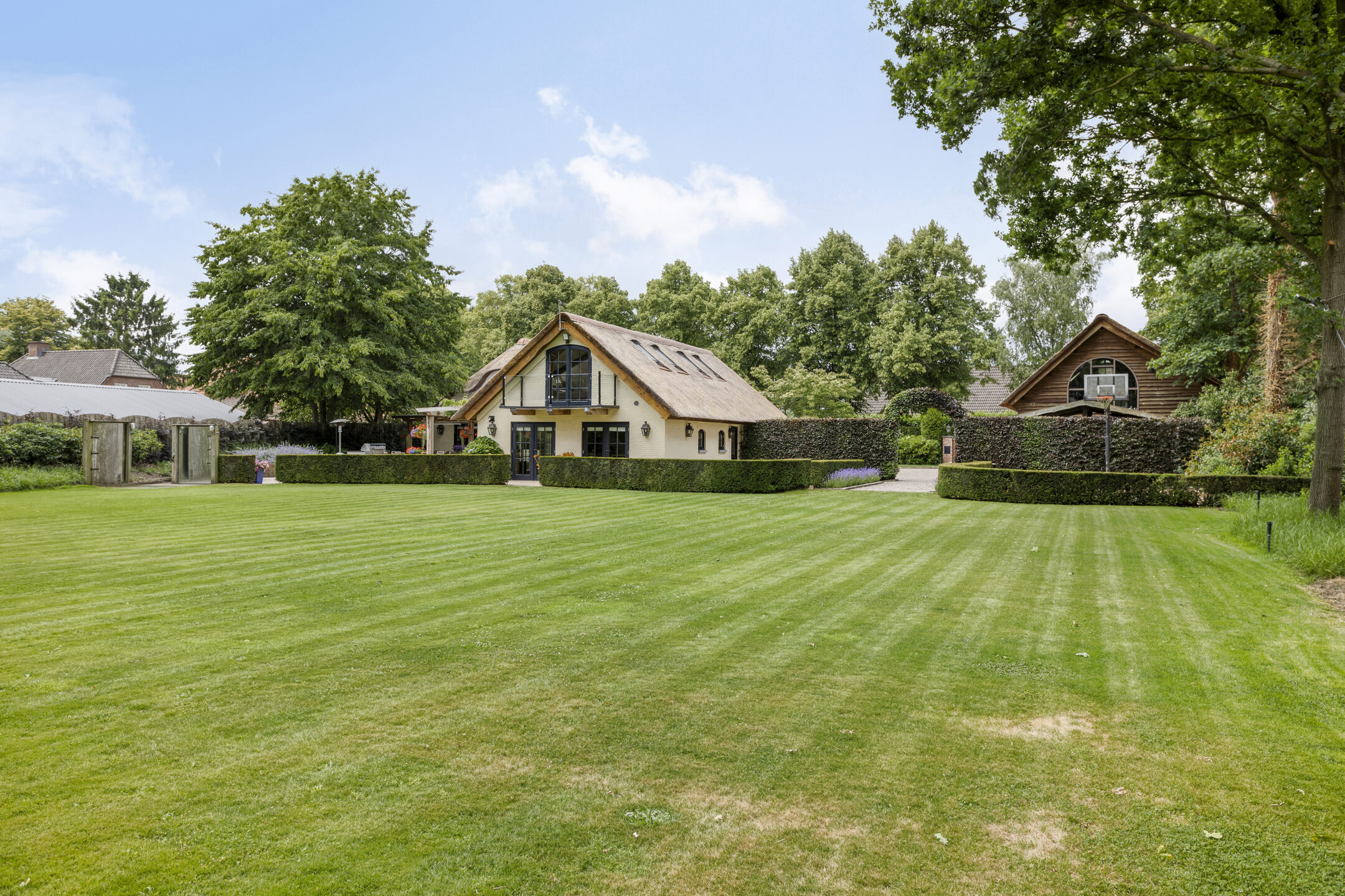 Farmhouse Riethoven offers a sense of seclusion and legacy on a peaceful street at the edge of Riethoven, Netherlands. This fully renovated residence occupies a magnificent 6,755 m² plot, with 484 m² of living space balancing restored character and contemporary comfort, including a detached guest house and a spacious outbuilding. The farmhouse Riethoven is enhanced by a thatched roof and thoughtful details throughout, from the marble-floored entrance and carved hardwood staircases to the elegant beamwork and expansive, light-filled interiors.