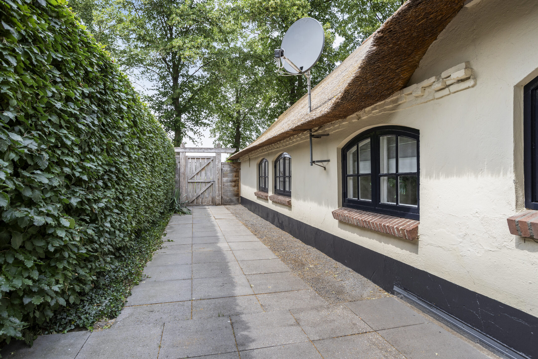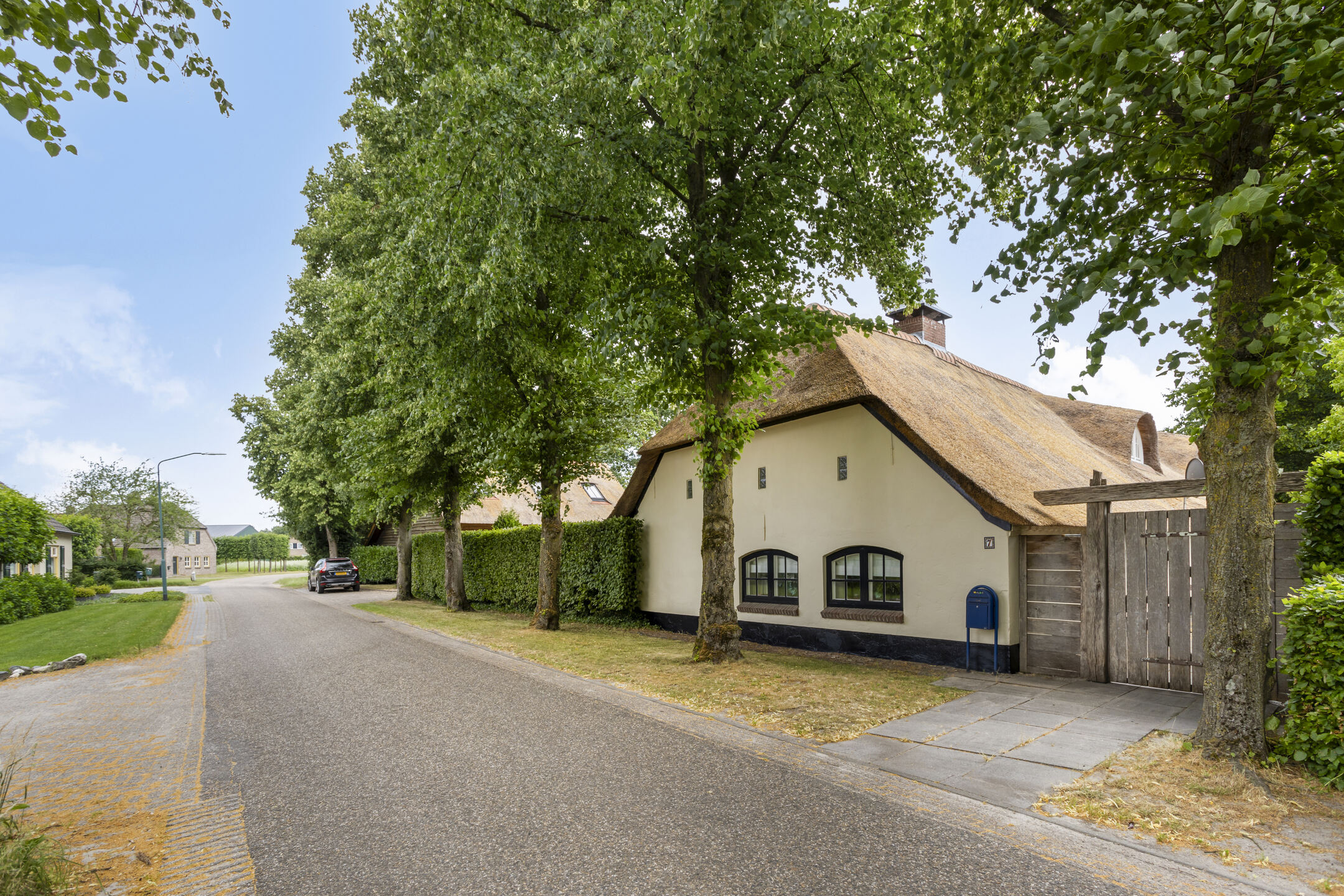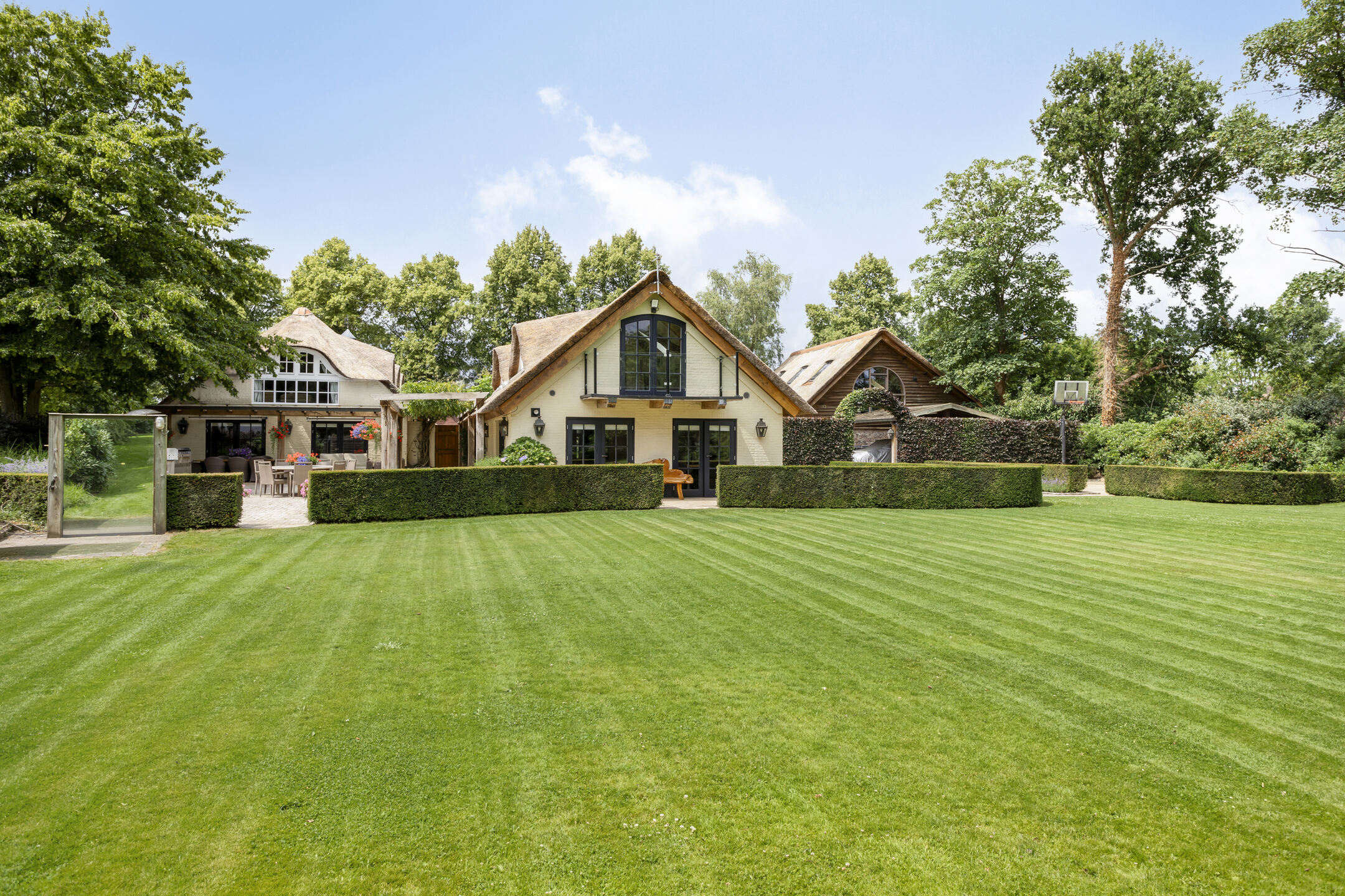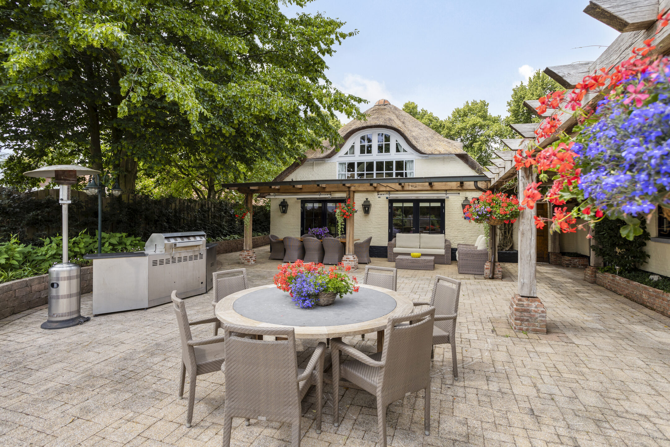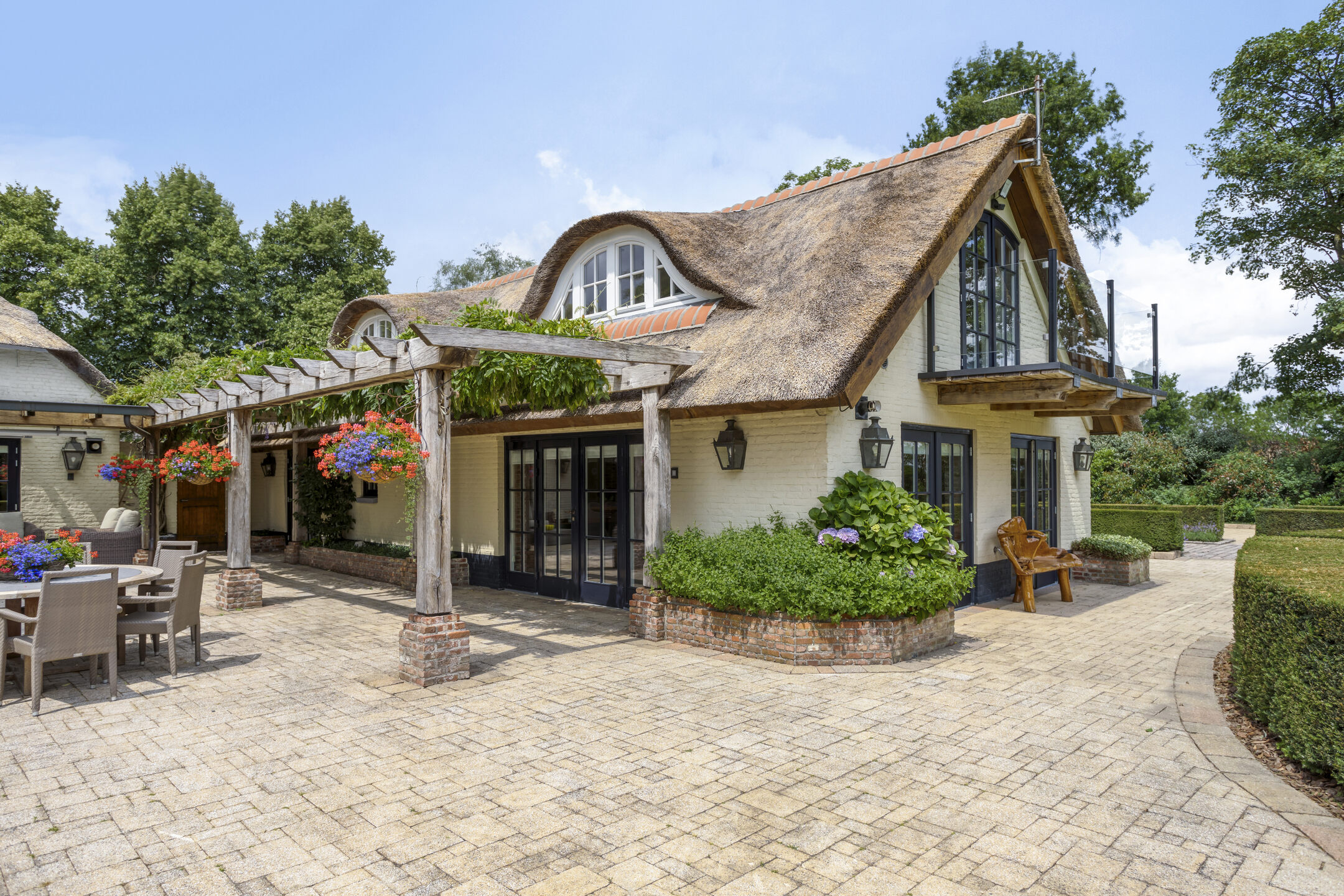 Farmhouse Riethoven offers a sense of seclusion and legacy on a peaceful street at the edge of Riethoven, Netherlands. This fully renovated residence occupies a magnificent 6,755 m² plot, with 484 m² of living space balancing restored character and contemporary comfort, including a detached guest house and a spacious outbuilding. The farmhouse Riethoven is enhanced by a thatched roof and thoughtful details throughout, from the marble-floored entrance and carved hardwood staircases to the elegant beamwork and expansive, light-filled interiors.
