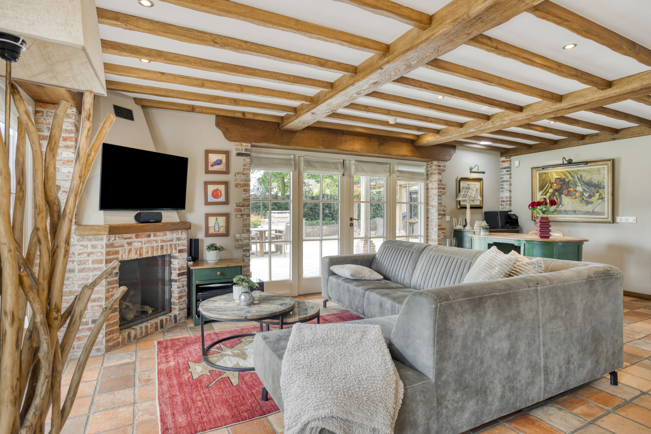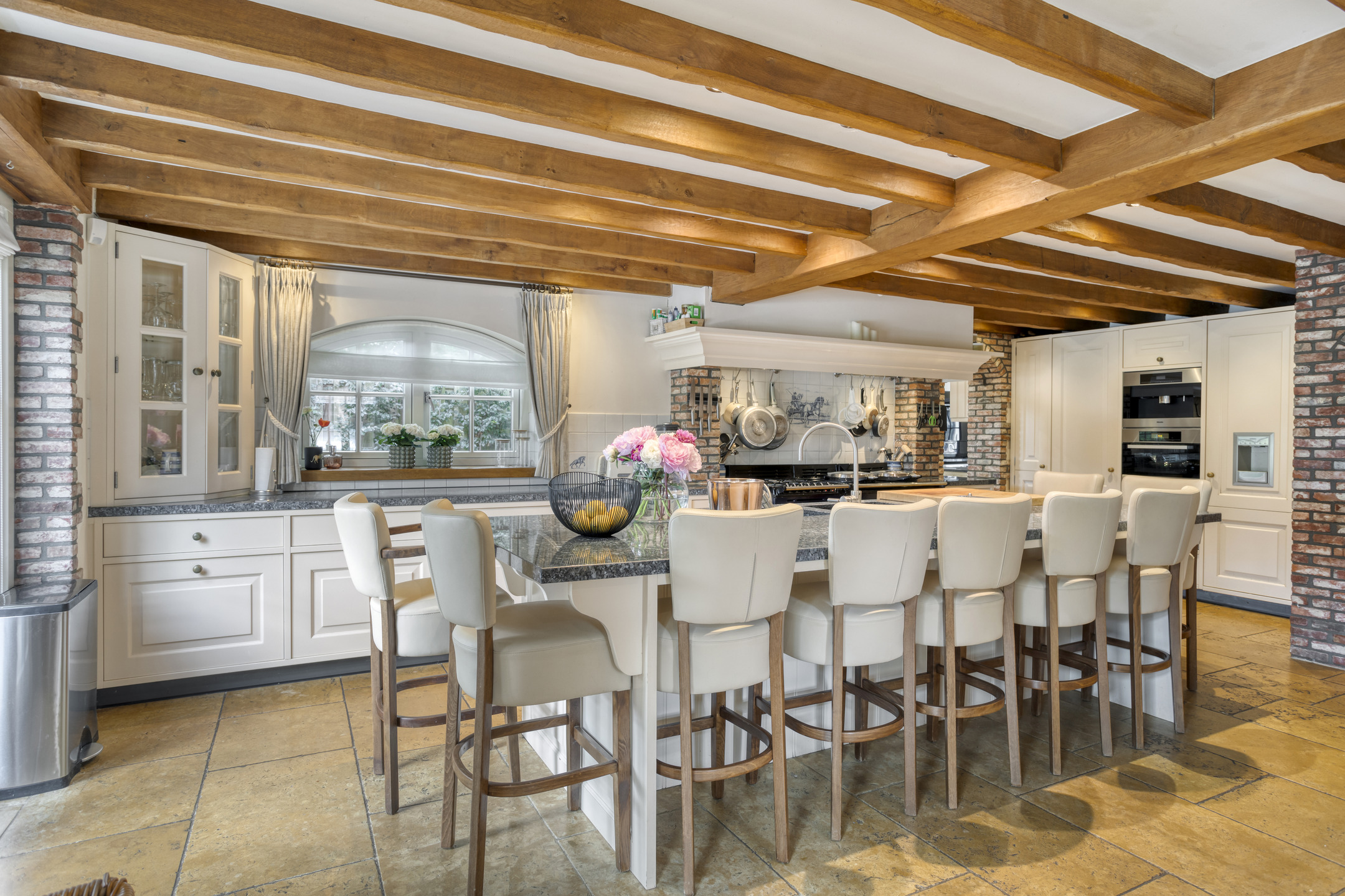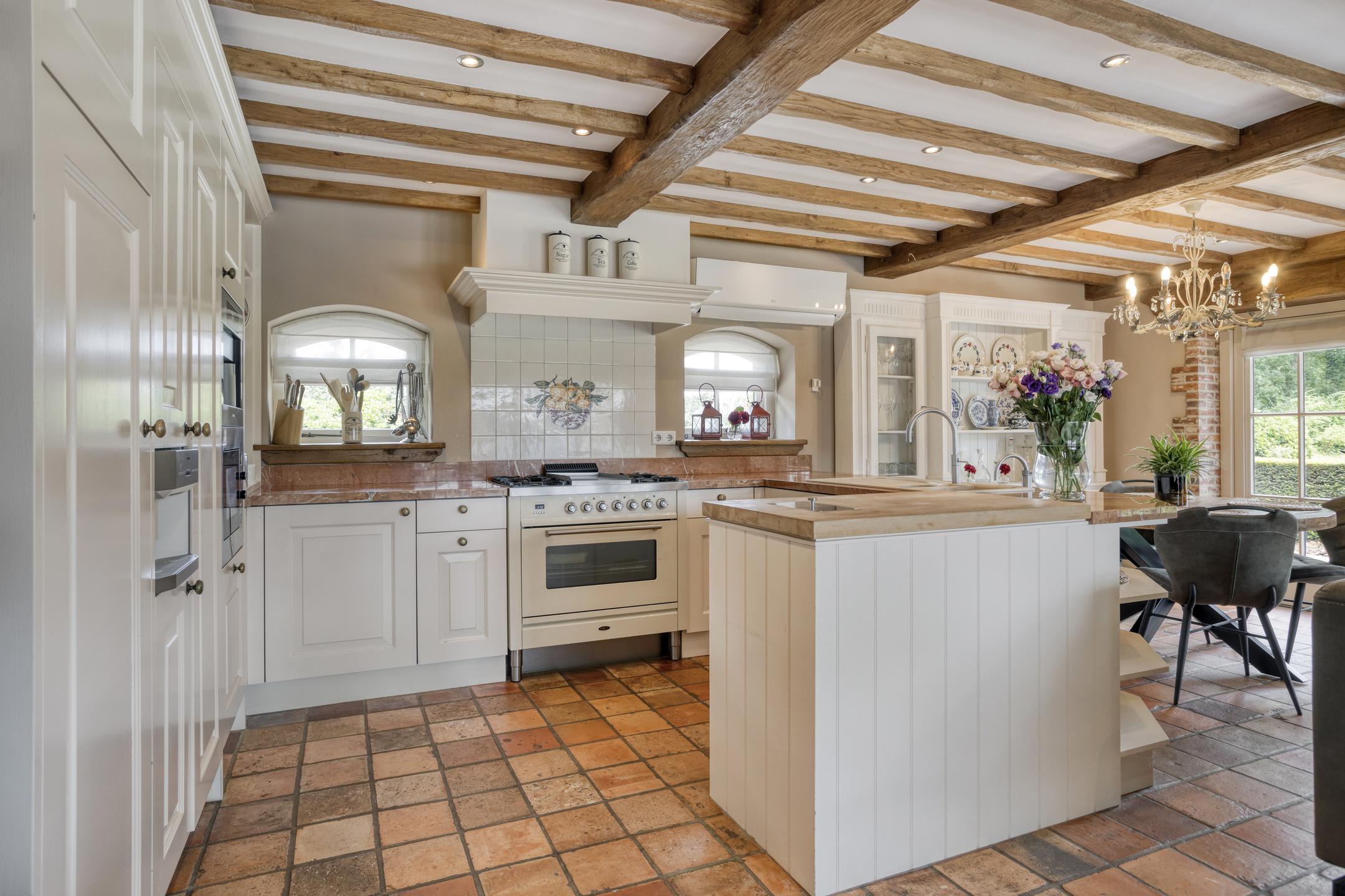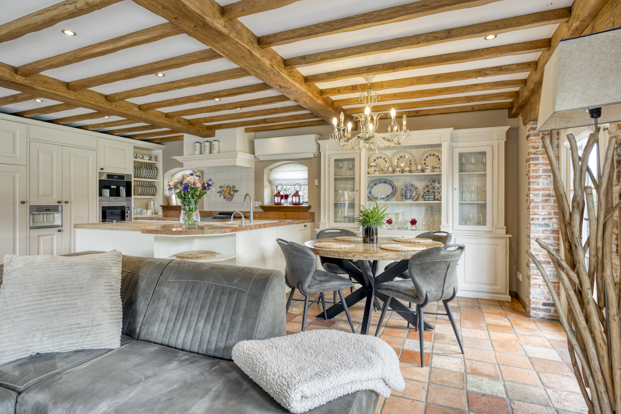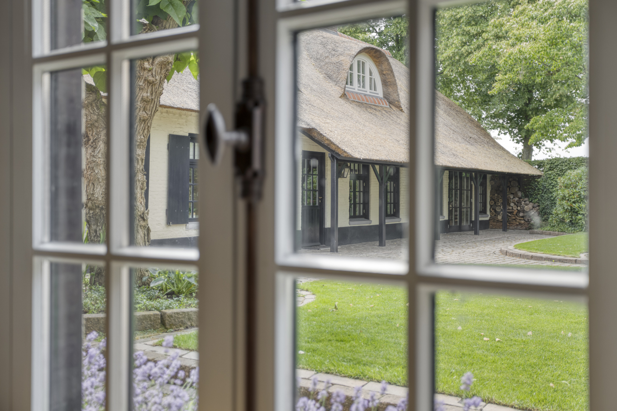 Farmhouse Riethoven offers a sense of seclusion and legacy on a peaceful street at the edge of Riethoven, Netherlands. This fully renovated residence occupies a magnificent 6,755 m² plot, with 484 m² of living space balancing restored character and contemporary comfort, including a detached guest house and a spacious outbuilding. The farmhouse Riethoven is enhanced by a thatched roof and thoughtful details throughout, from the marble-floored entrance and carved hardwood staircases to the elegant beamwork and expansive, light-filled interiors.