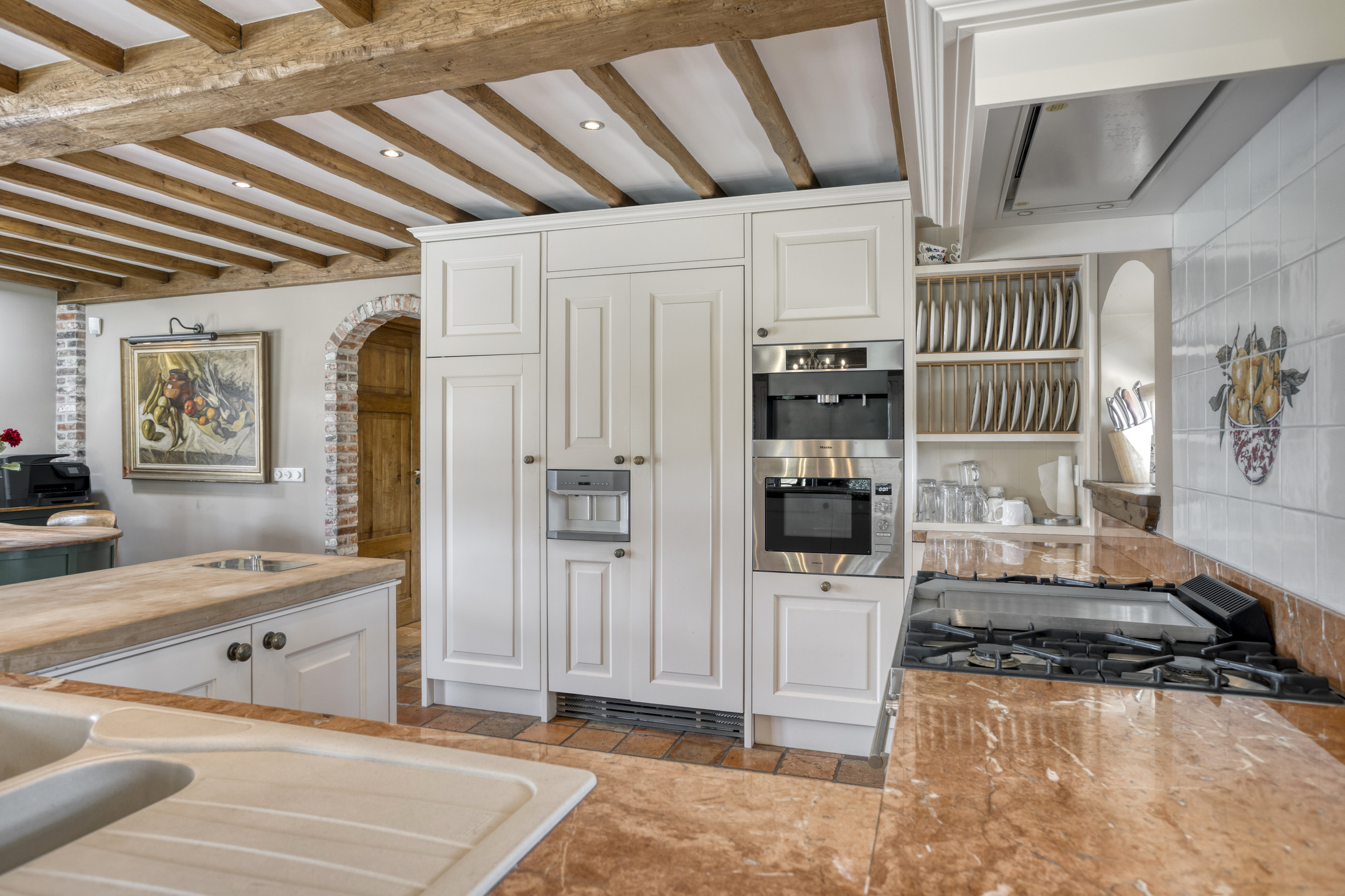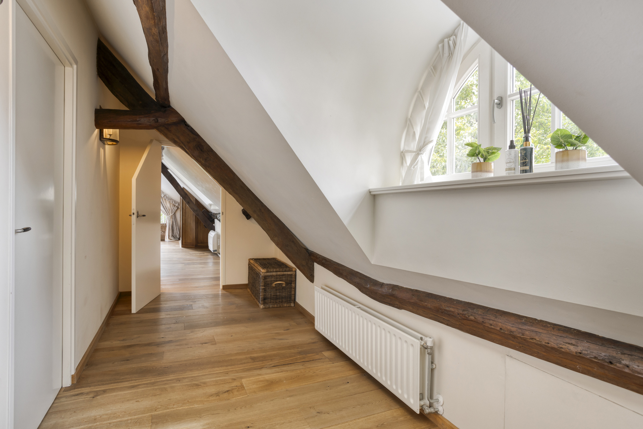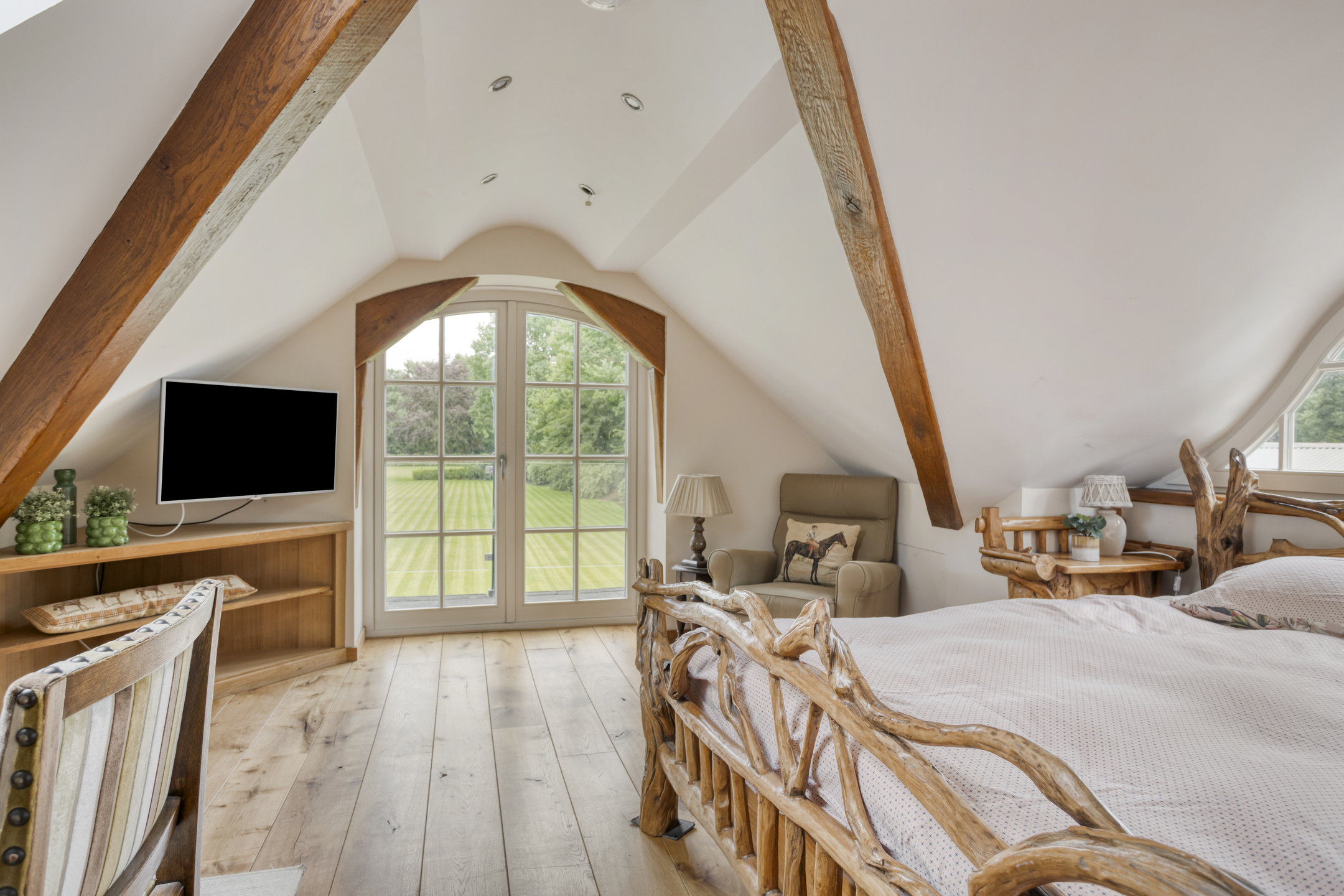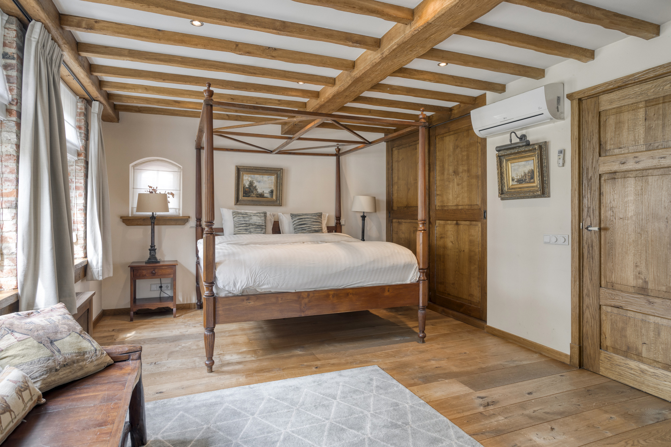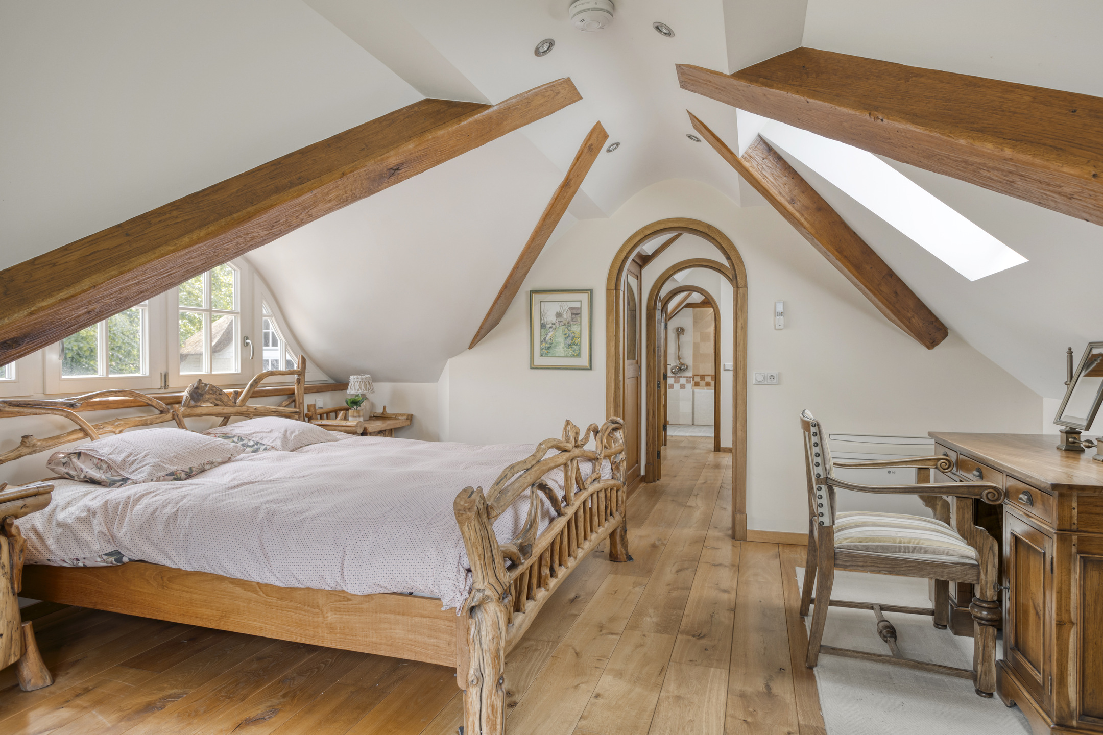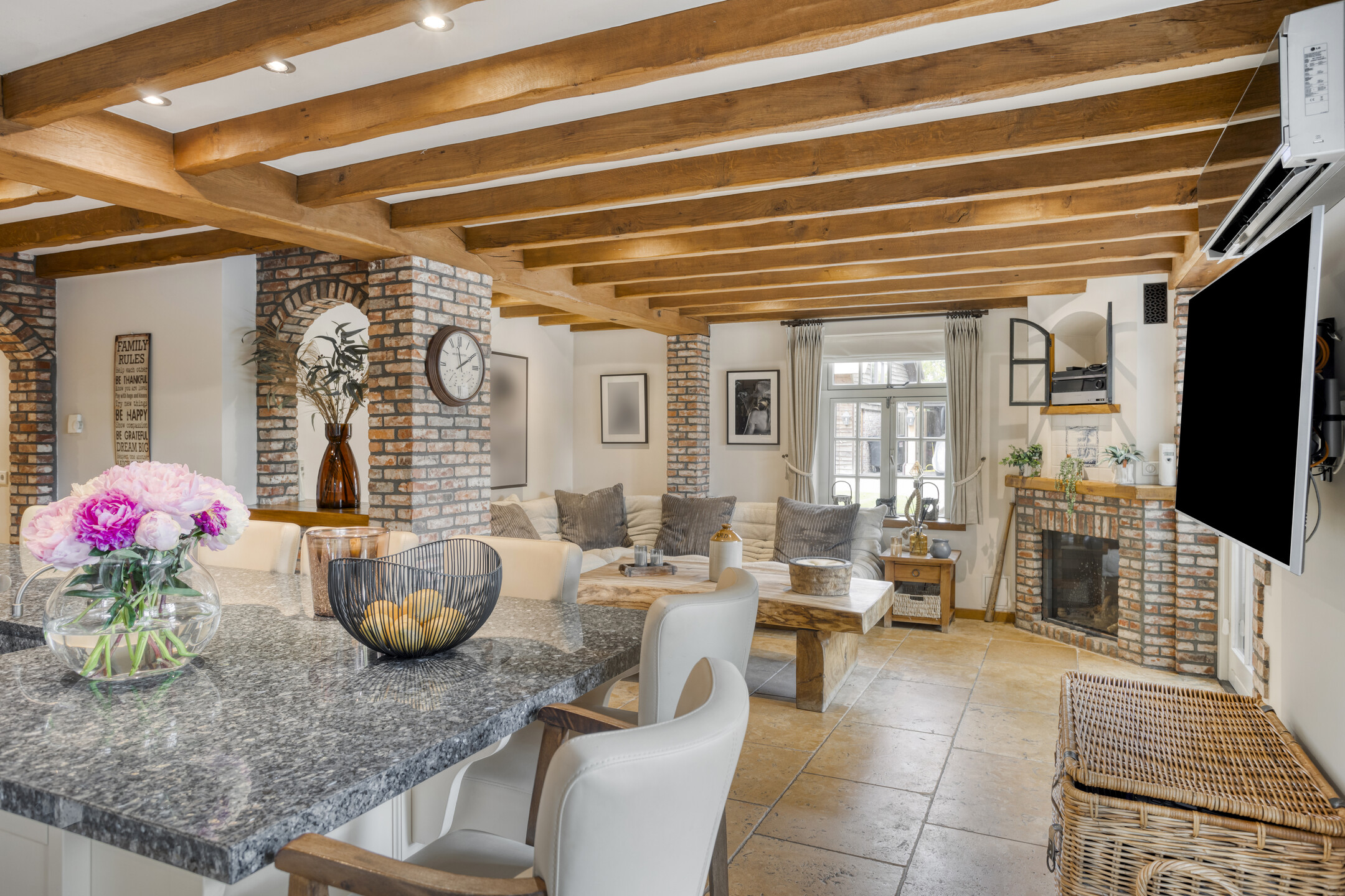 Farmhouse Riethoven offers a sense of seclusion and legacy on a peaceful street at the edge of Riethoven, Netherlands. This fully renovated residence occupies a magnificent 6,755 m² plot, with 484 m² of living space balancing restored character and contemporary comfort, including a detached guest house and a spacious outbuilding. The farmhouse Riethoven is enhanced by a thatched roof and thoughtful details throughout, from the marble-floored entrance and carved hardwood staircases to the elegant beamwork and expansive, light-filled interiors.