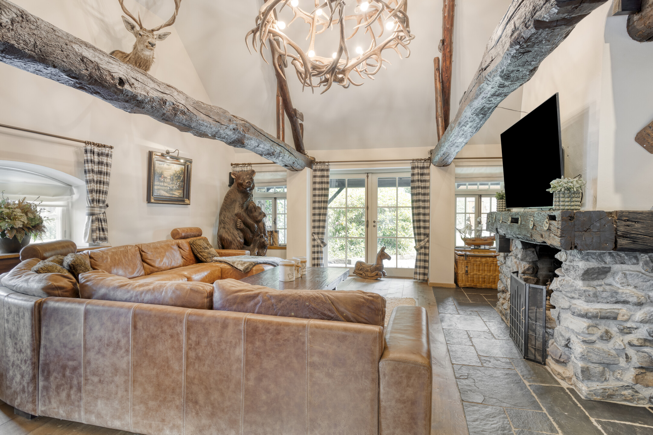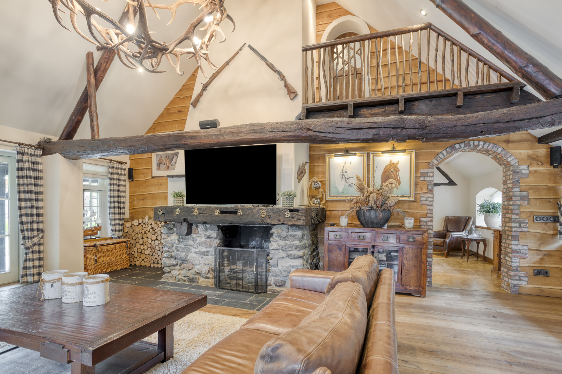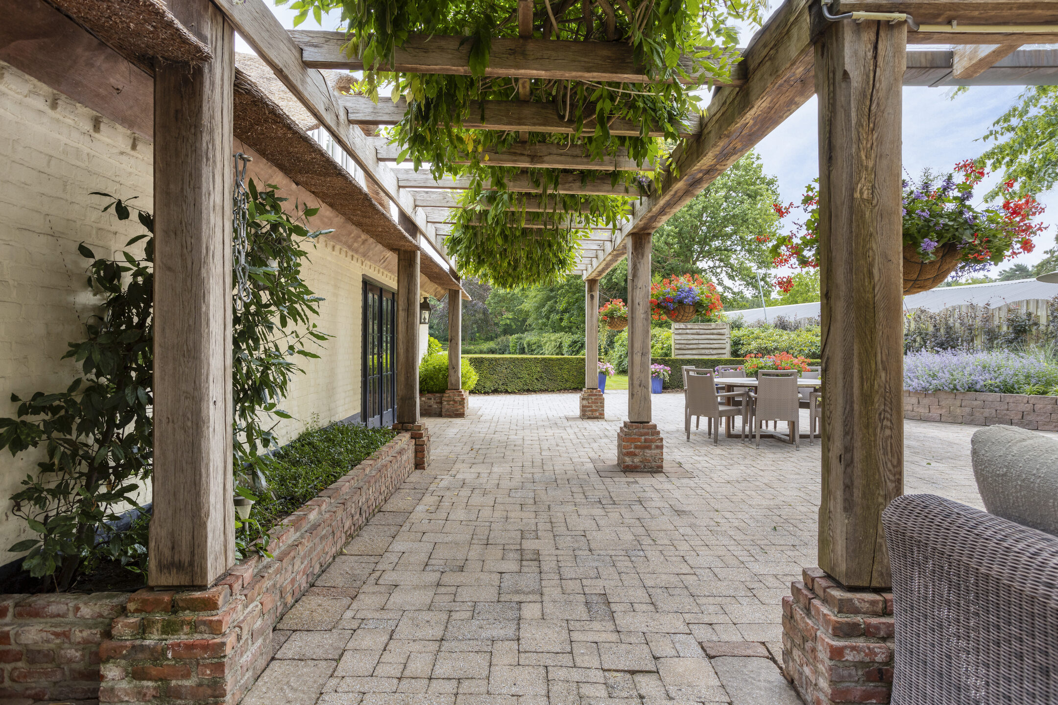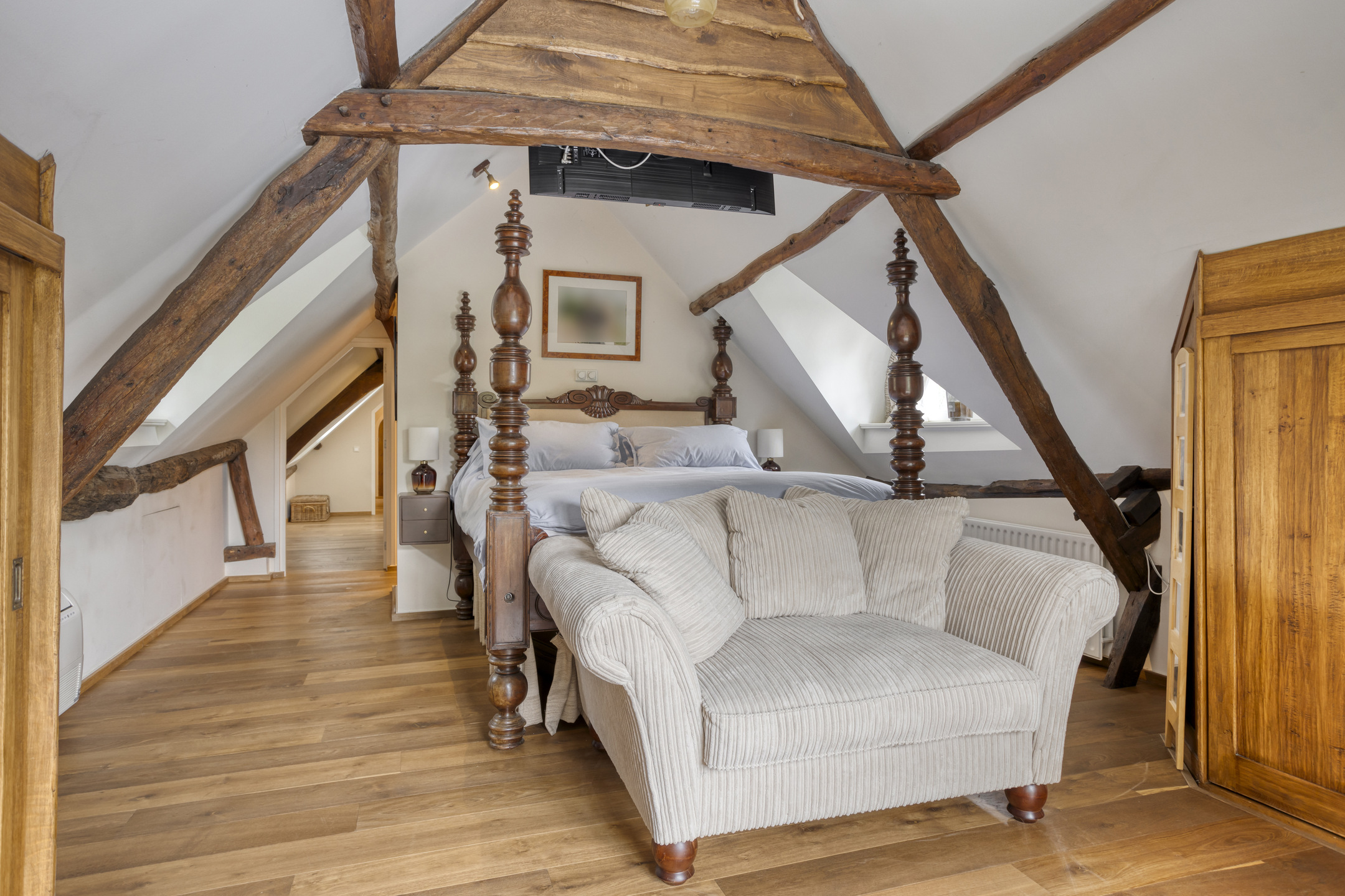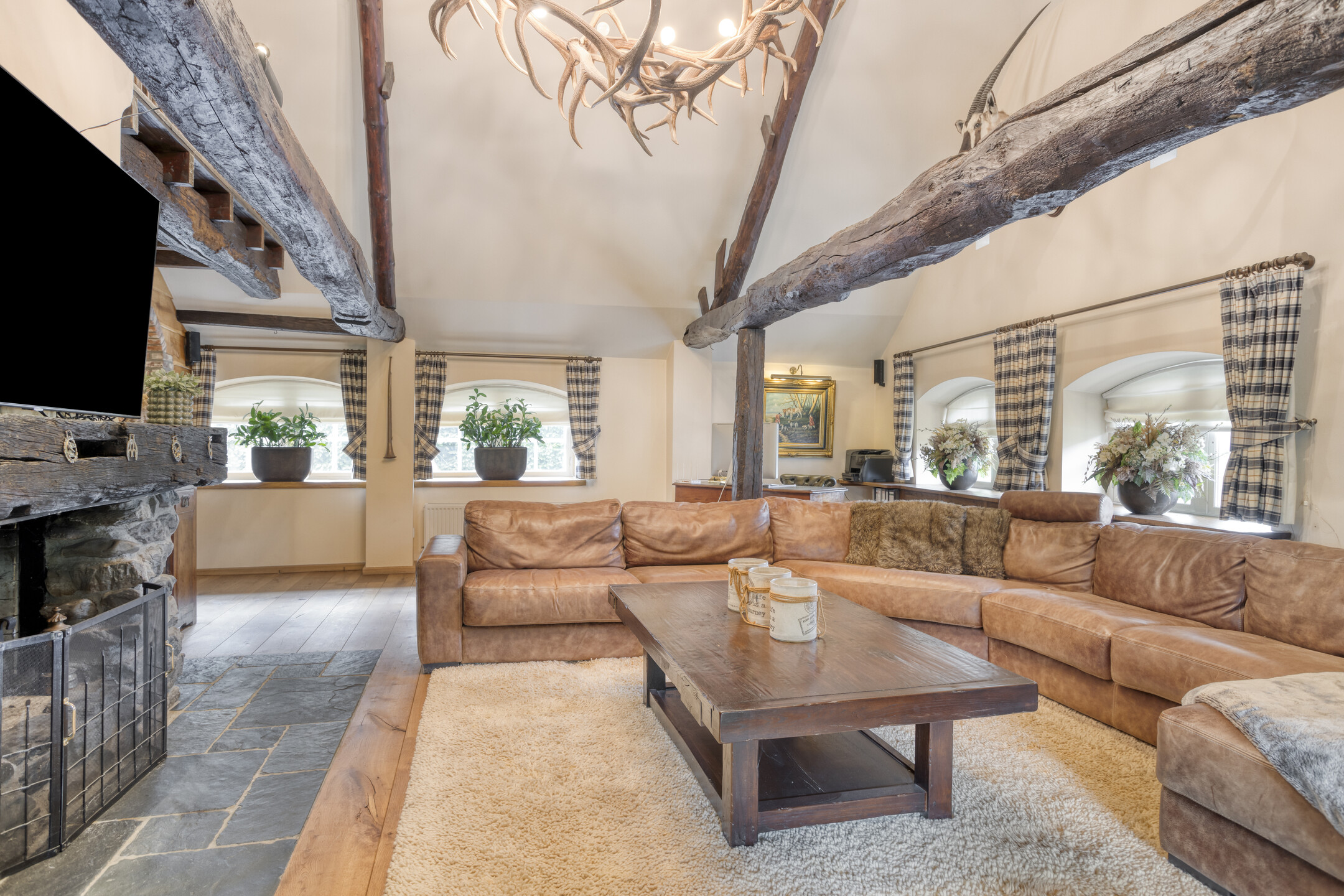 Farmhouse Riethoven offers a sense of seclusion and legacy on a peaceful street at the edge of Riethoven, Netherlands. This fully renovated residence occupies a magnificent 6,755 m² plot, with 484 m² of living space balancing restored character and contemporary comfort, including a detached guest house and a spacious outbuilding. The farmhouse Riethoven is enhanced by a thatched roof and thoughtful details throughout, from the marble-floored entrance and carved hardwood staircases to the elegant beamwork and expansive, light-filled interiors.
