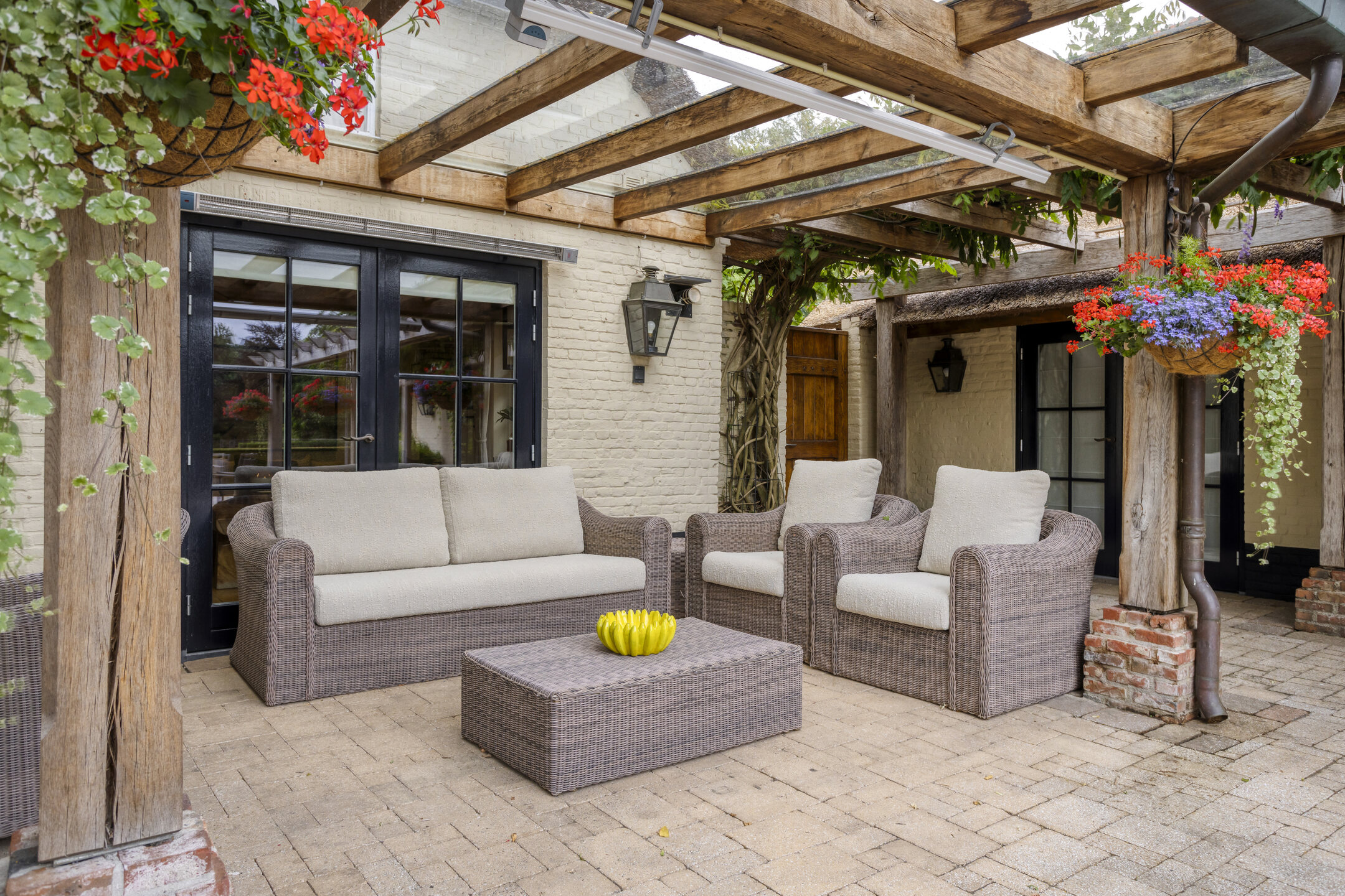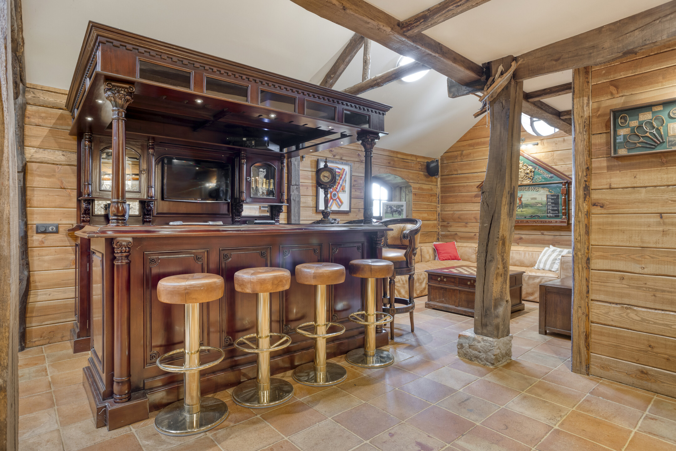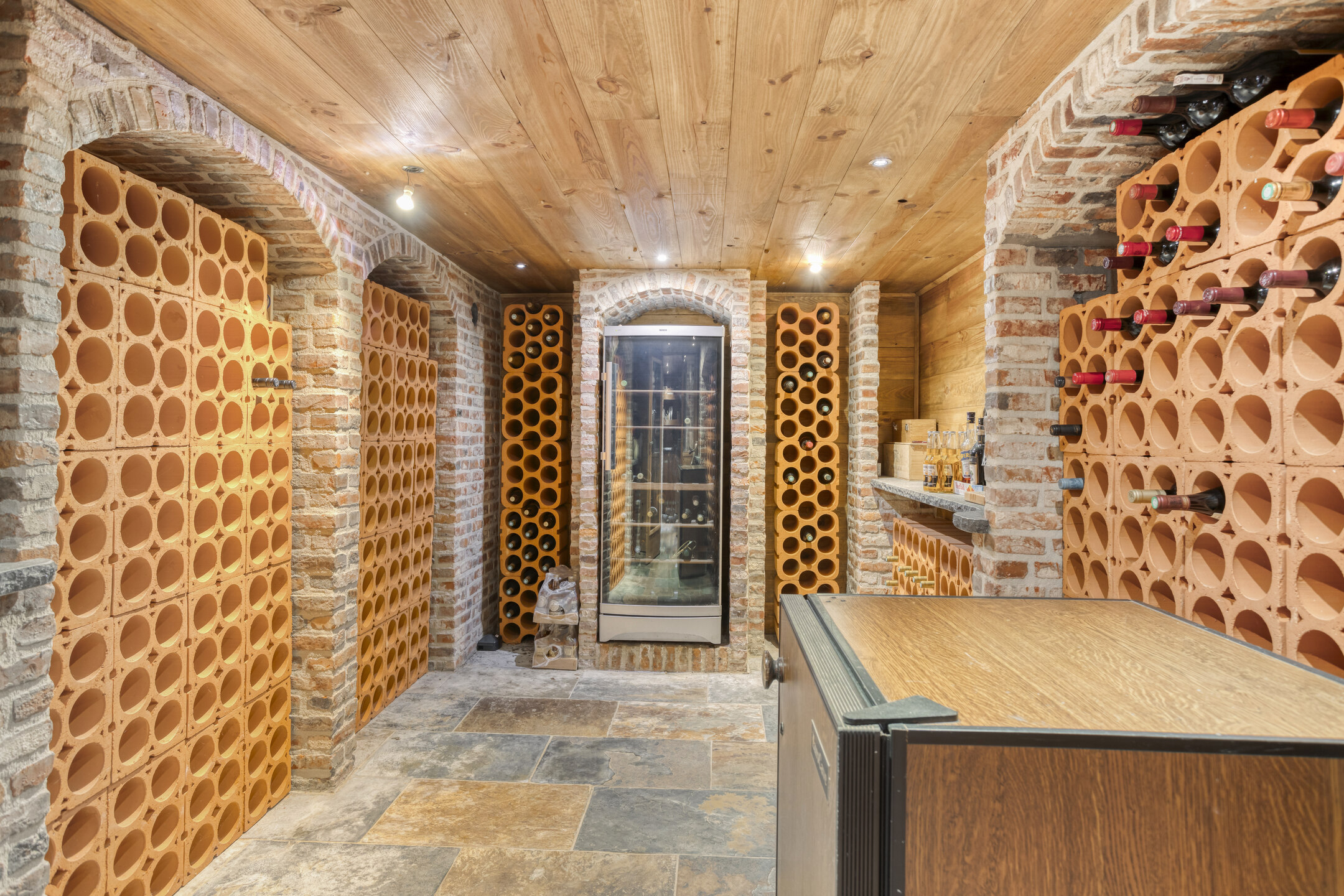The main house is composed of a welcoming living room with a wood fireplace, a refined dining space, a large kitchen with marble surfaces and a prominent island, a wine cellar, four tranquil bedrooms, and two marble-clad bathrooms. Air conditioning, partial underfloor heating, and an alarm system elevate comfort and security. The guest house, with thatched roof and its own terrace, provides two additional bedrooms and two bathrooms, offering autonomy and dignity for visitors or extended family.