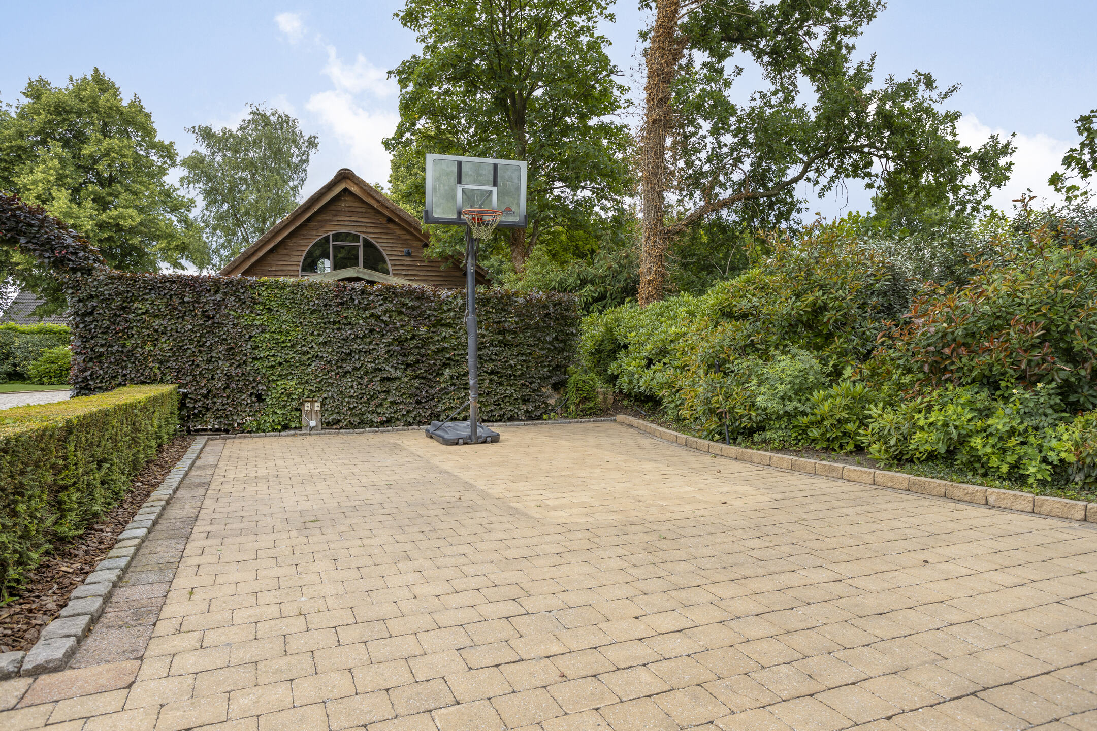 The outbuilding, formerly a garage, includes a gym and relaxation room, furthering the sense of retreat. The property also features a multi-vehicle carport with charging point, a discreet basketball court, and mature grounds landscaped with lawns, terraces, and extensive greenery. The east-facing park-like garden ensures lasting privacy, framed by trees and open skies. Nature reserves and cycling routes are close by, while Eersel’s vibrant amenities and the strategic connectivity to Eindhoven, the High Tech Campus, and the A67 place city life and global access within easy reach.