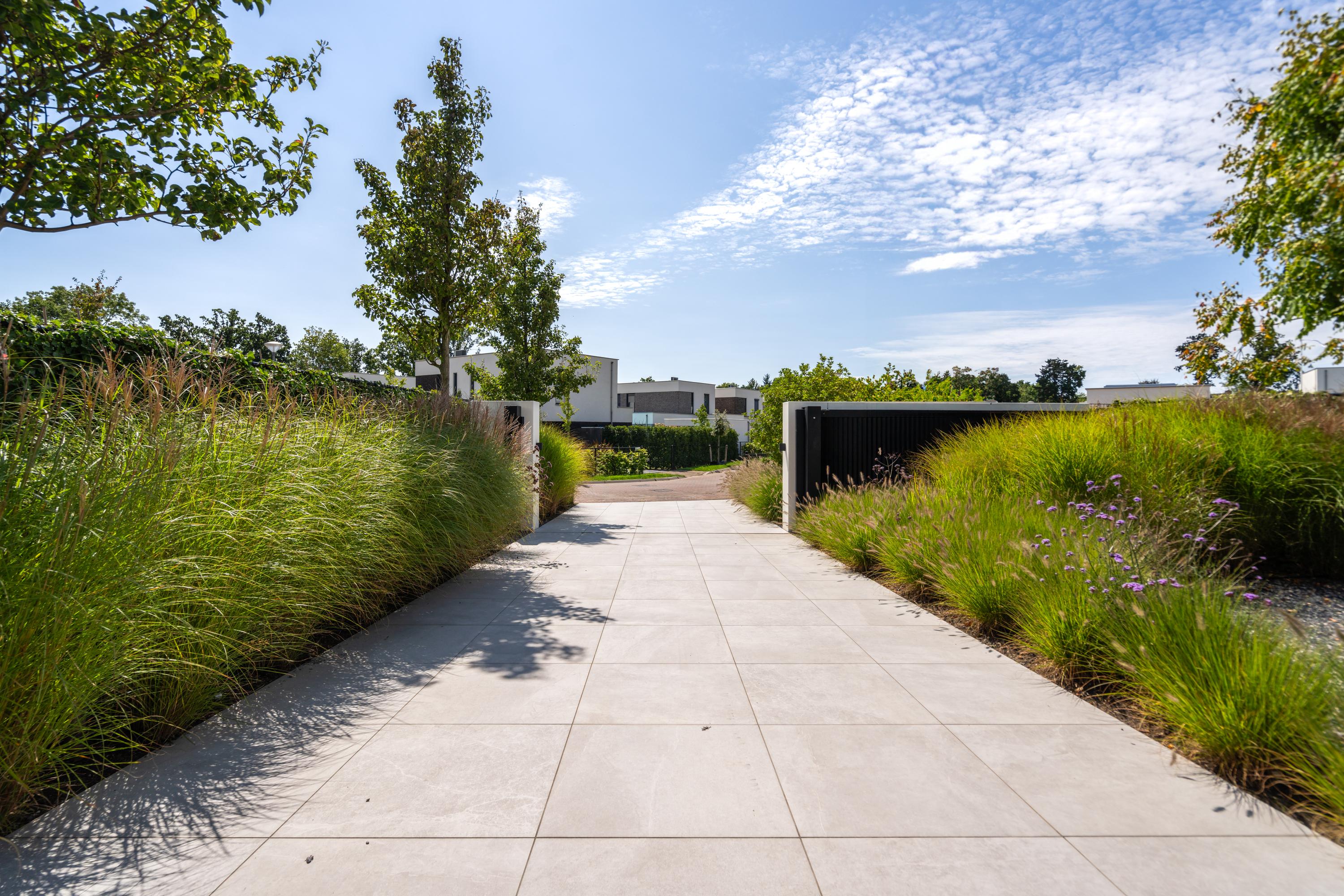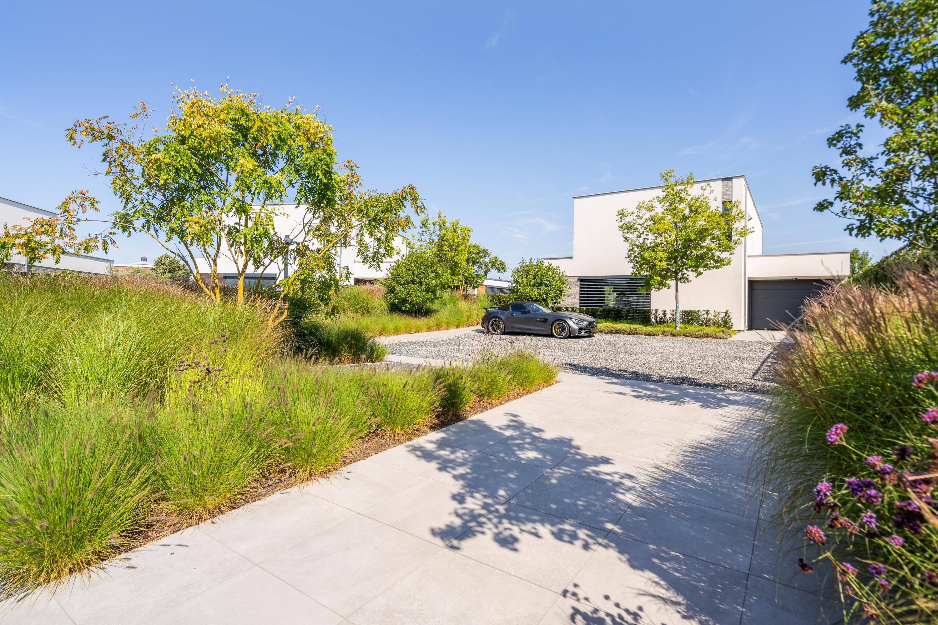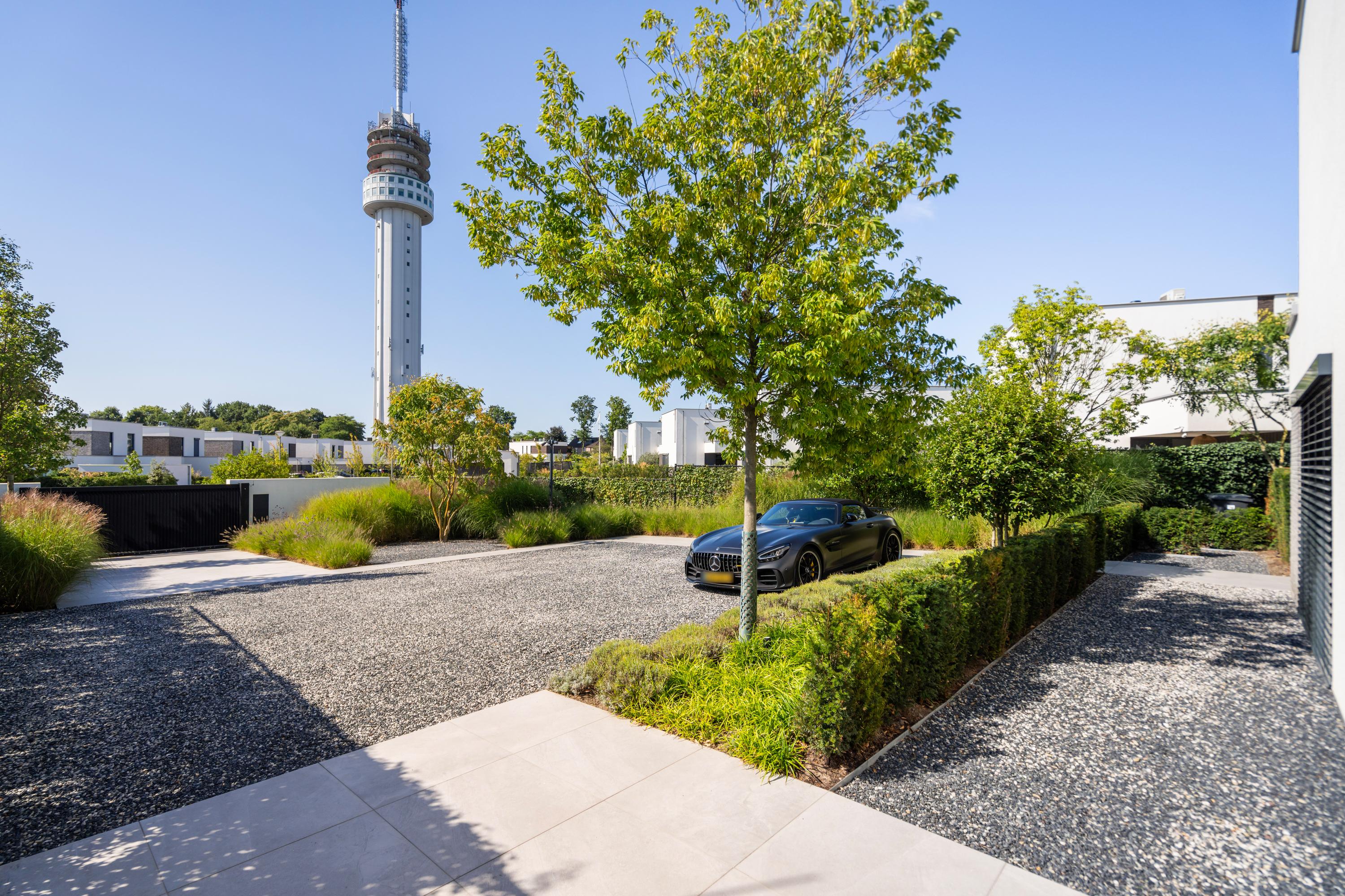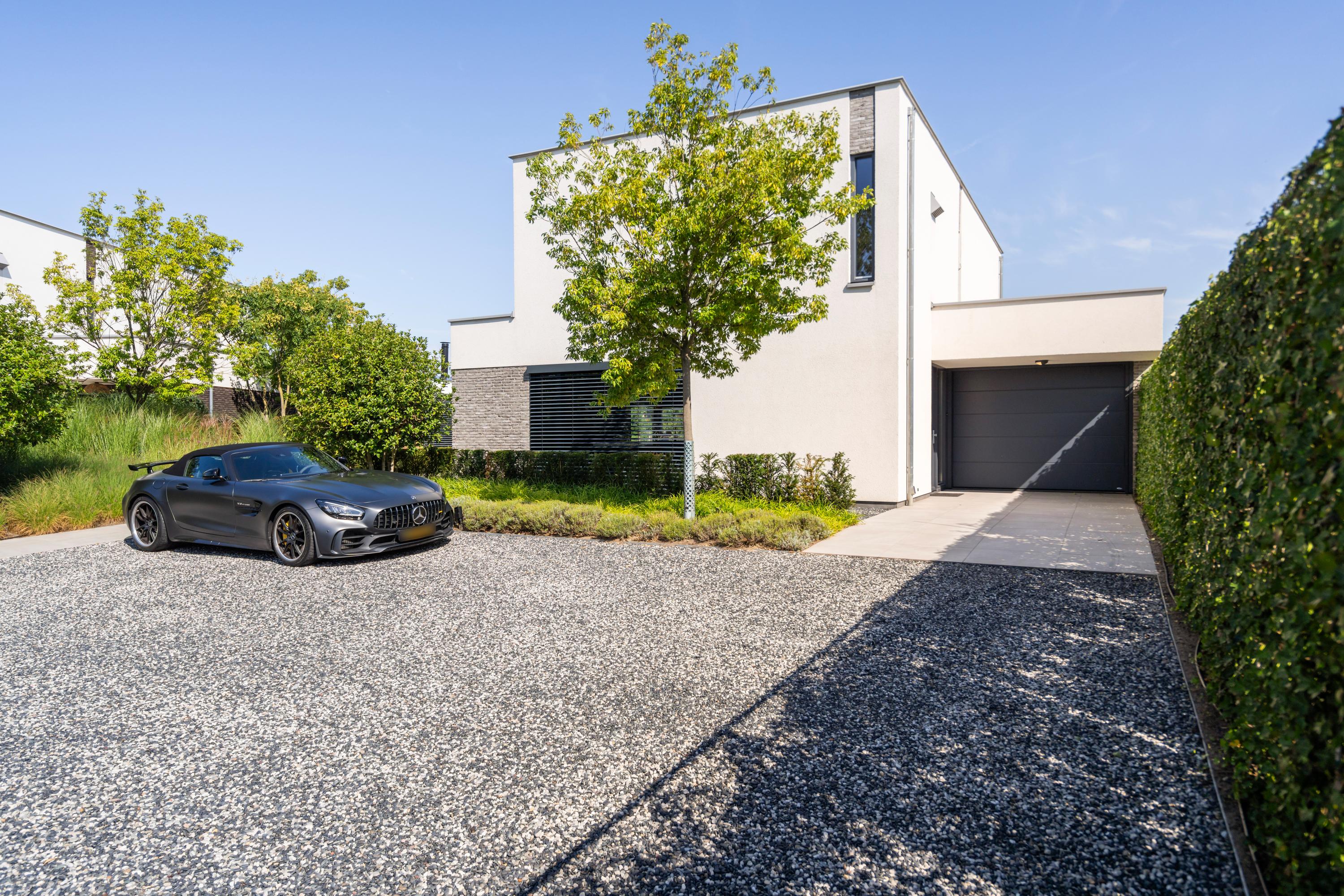 At the front, the villa is embraced by a generous garden that immediately sets the tone for the exclusive character of the property. The carefully designed combination of modern paving and green borders creates a harmonious and refined whole. The private driveway, finished with high?quality tiles and subtle greenery, leads you stylishly to the entrance.