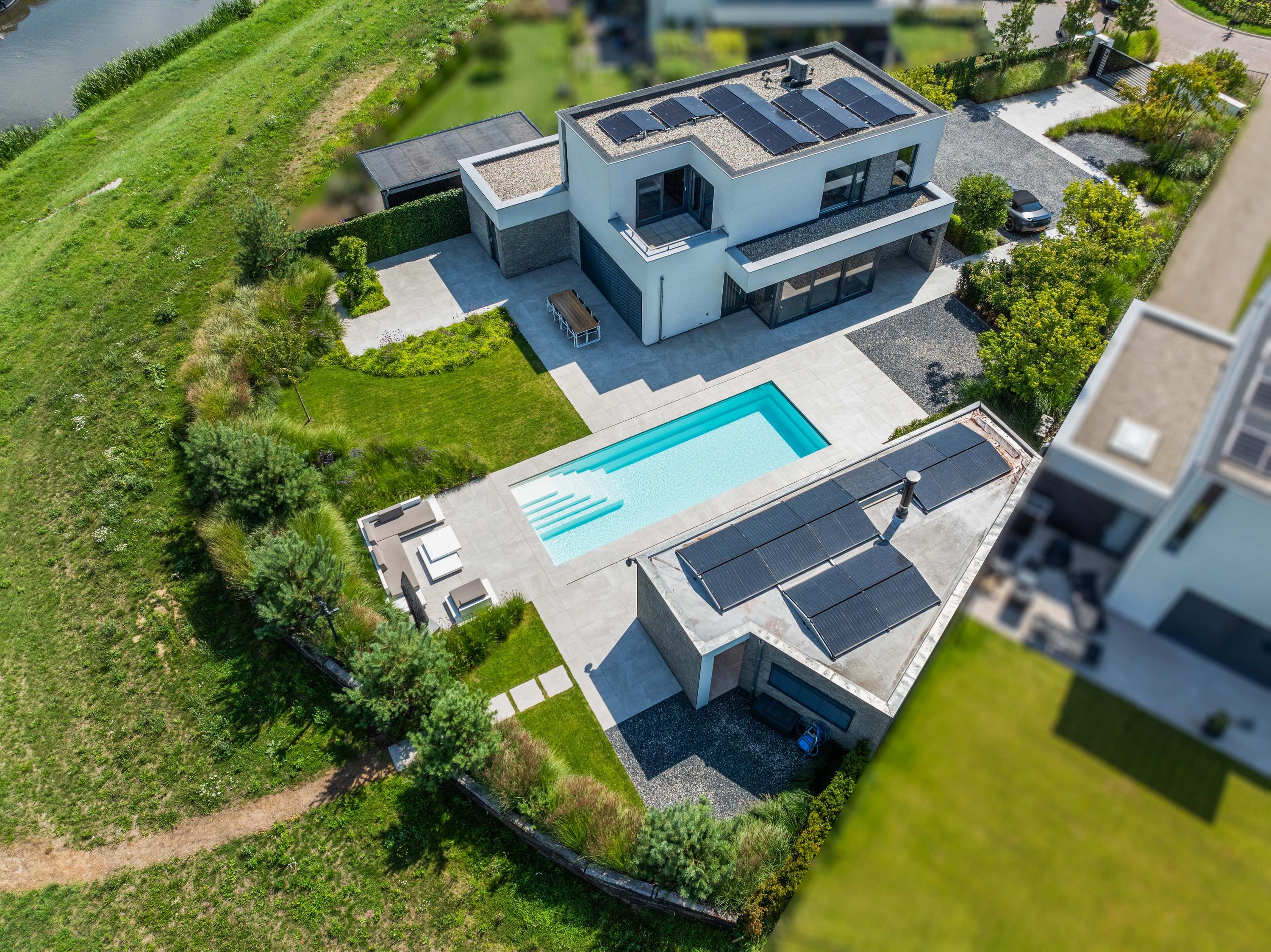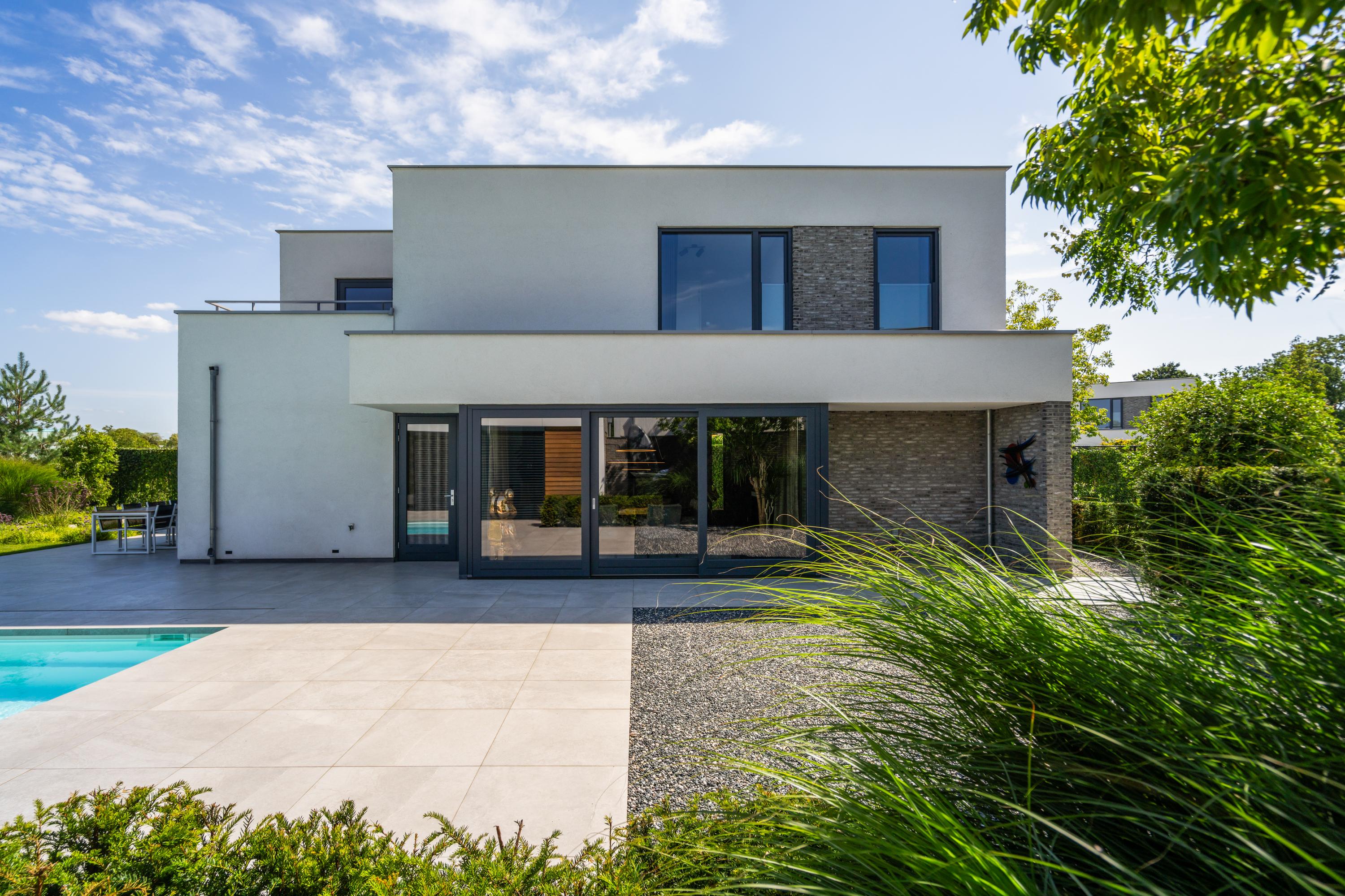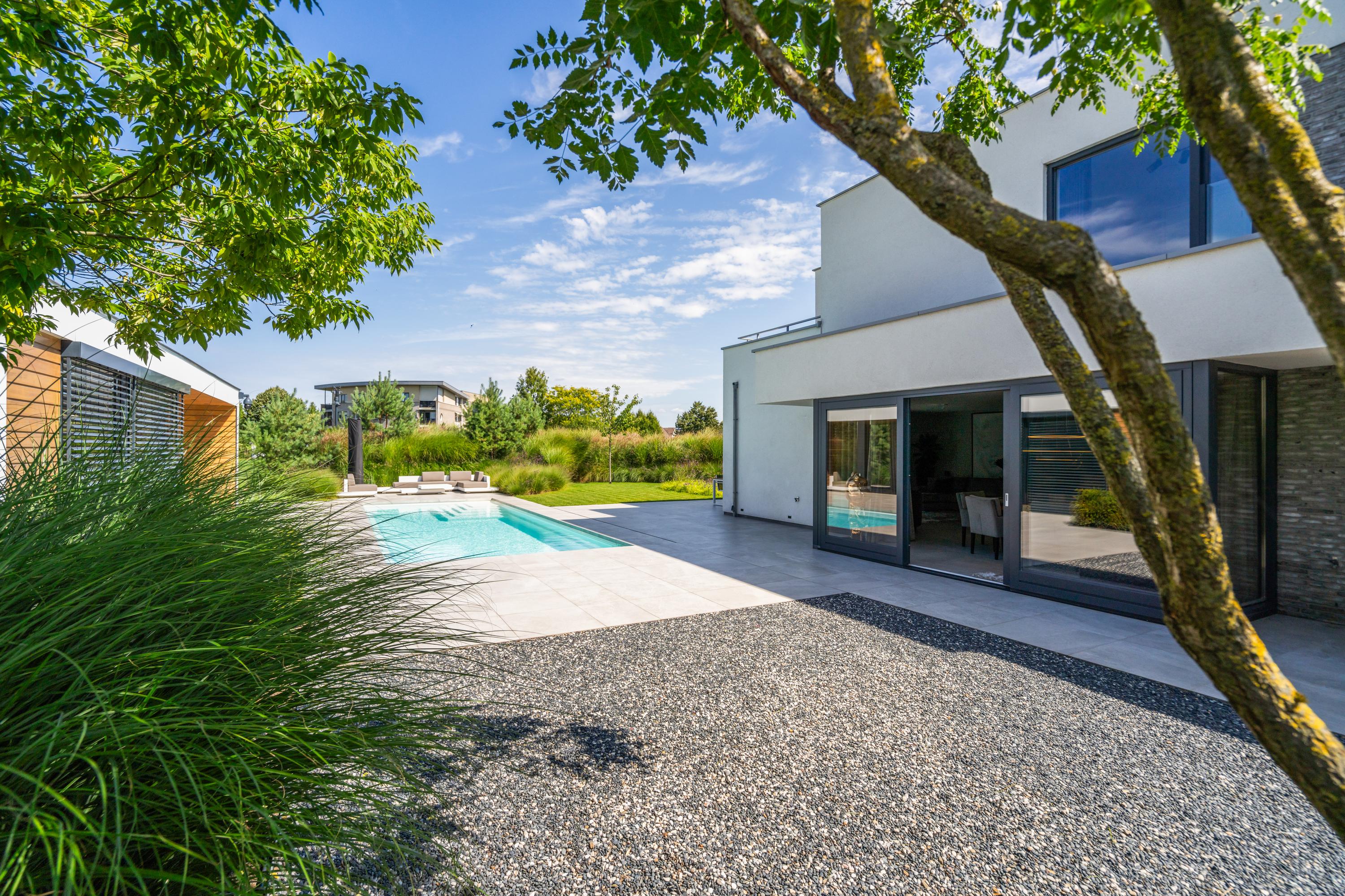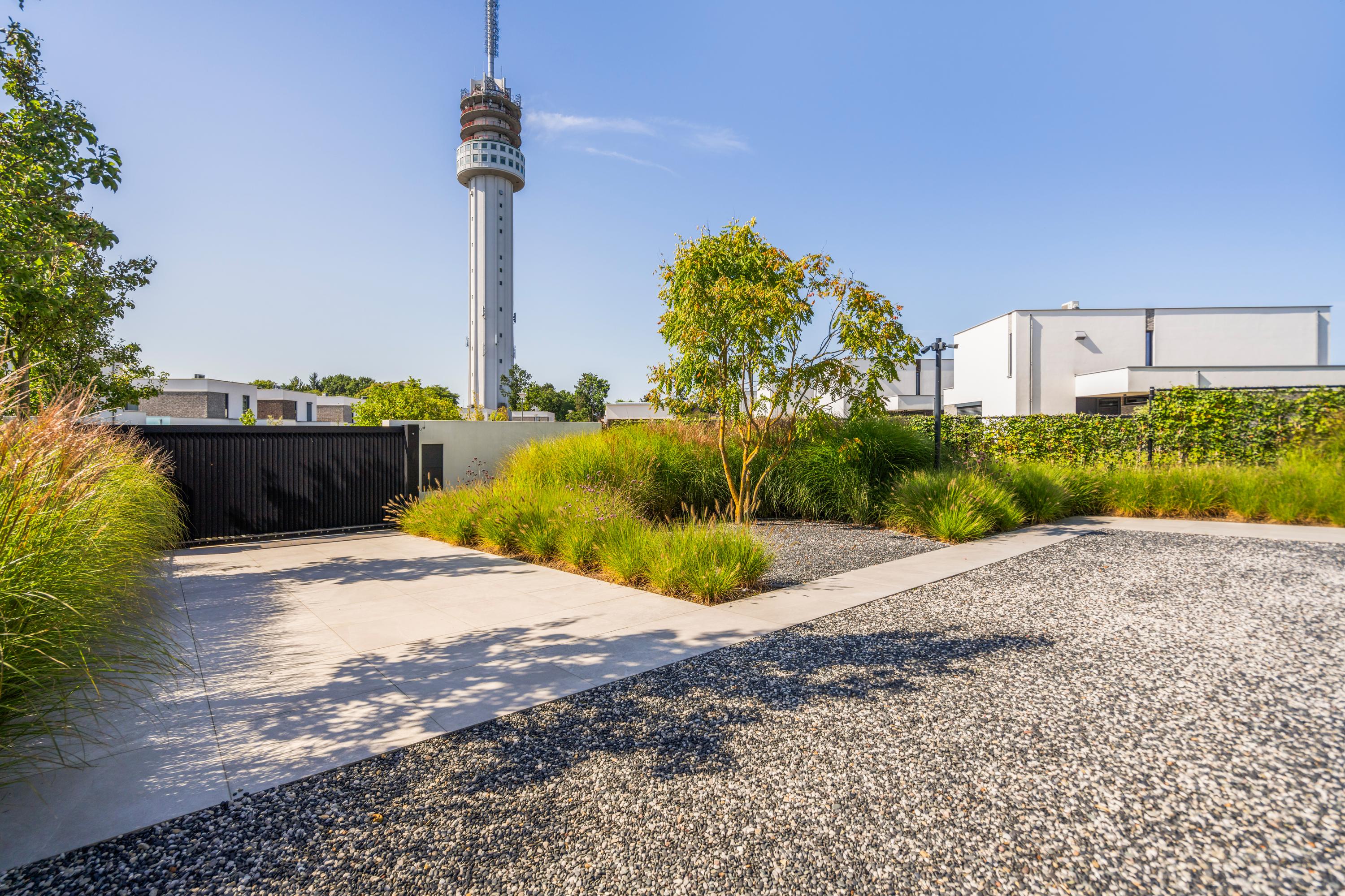 At the front, the villa is embraced by a generous garden that immediately sets the tone for the exclusive character of the property. The carefully designed combination of modern paving and green borders creates a harmonious and refined whole. The private driveway, finished with high?quality tiles and subtle greenery, leads you stylishly to the entrance.