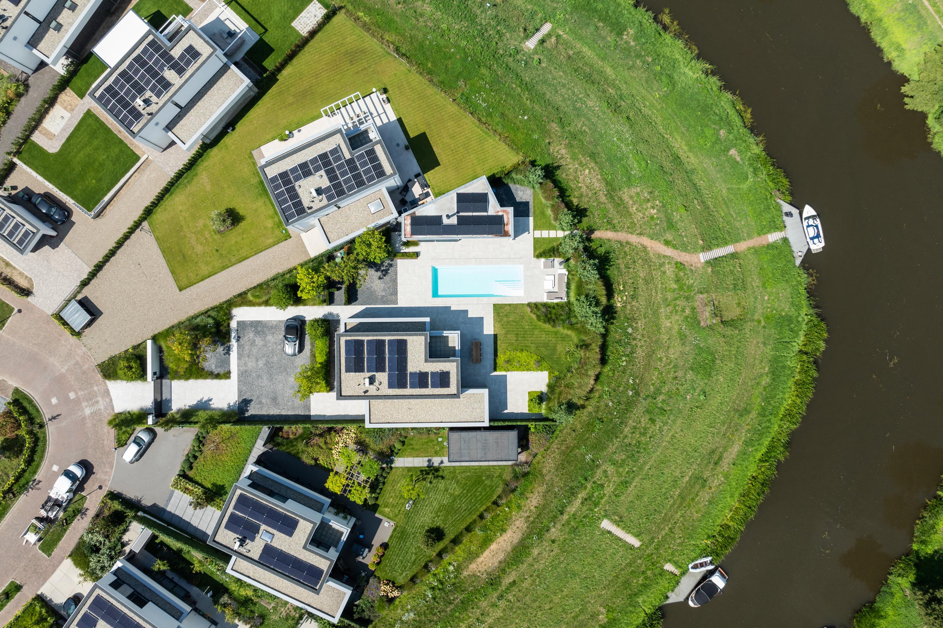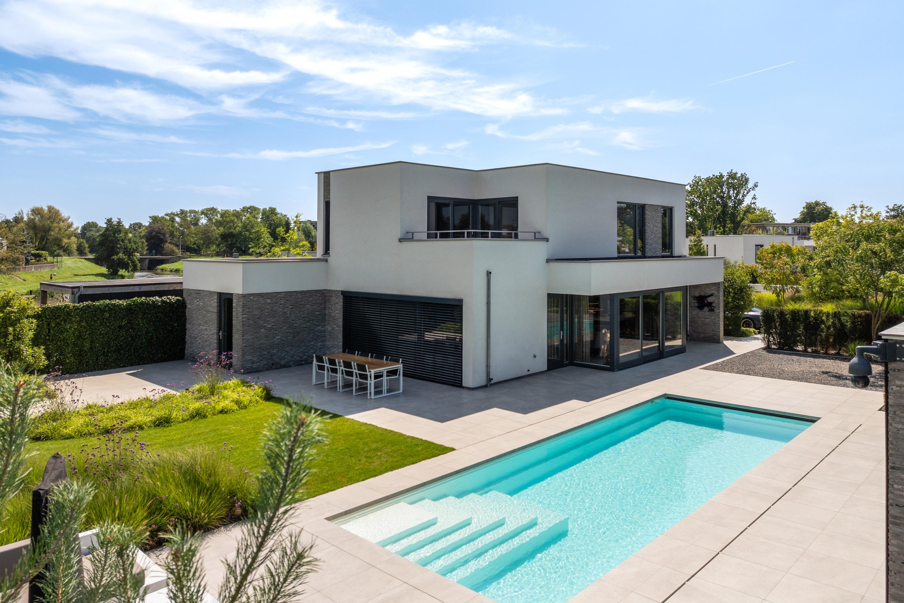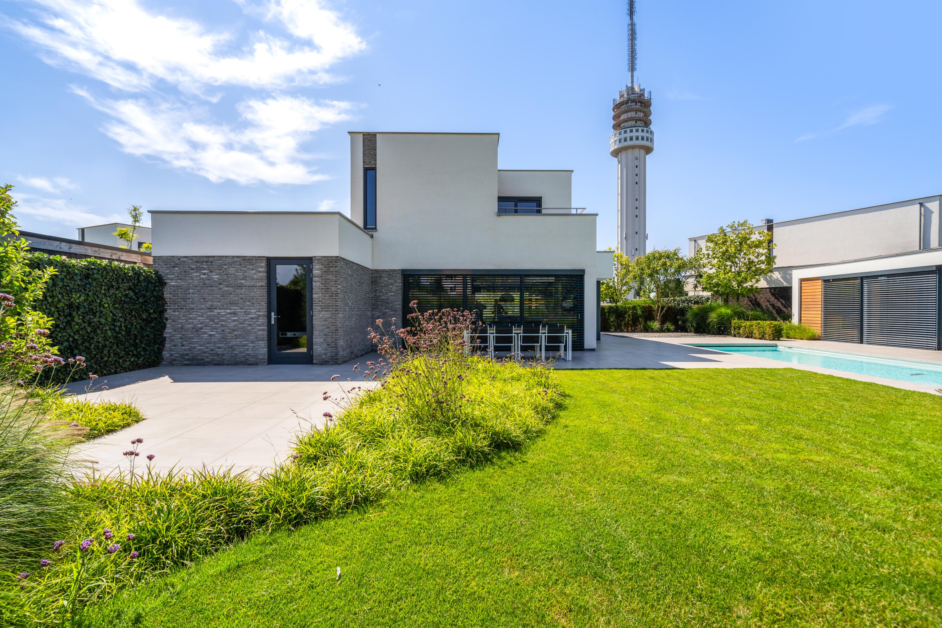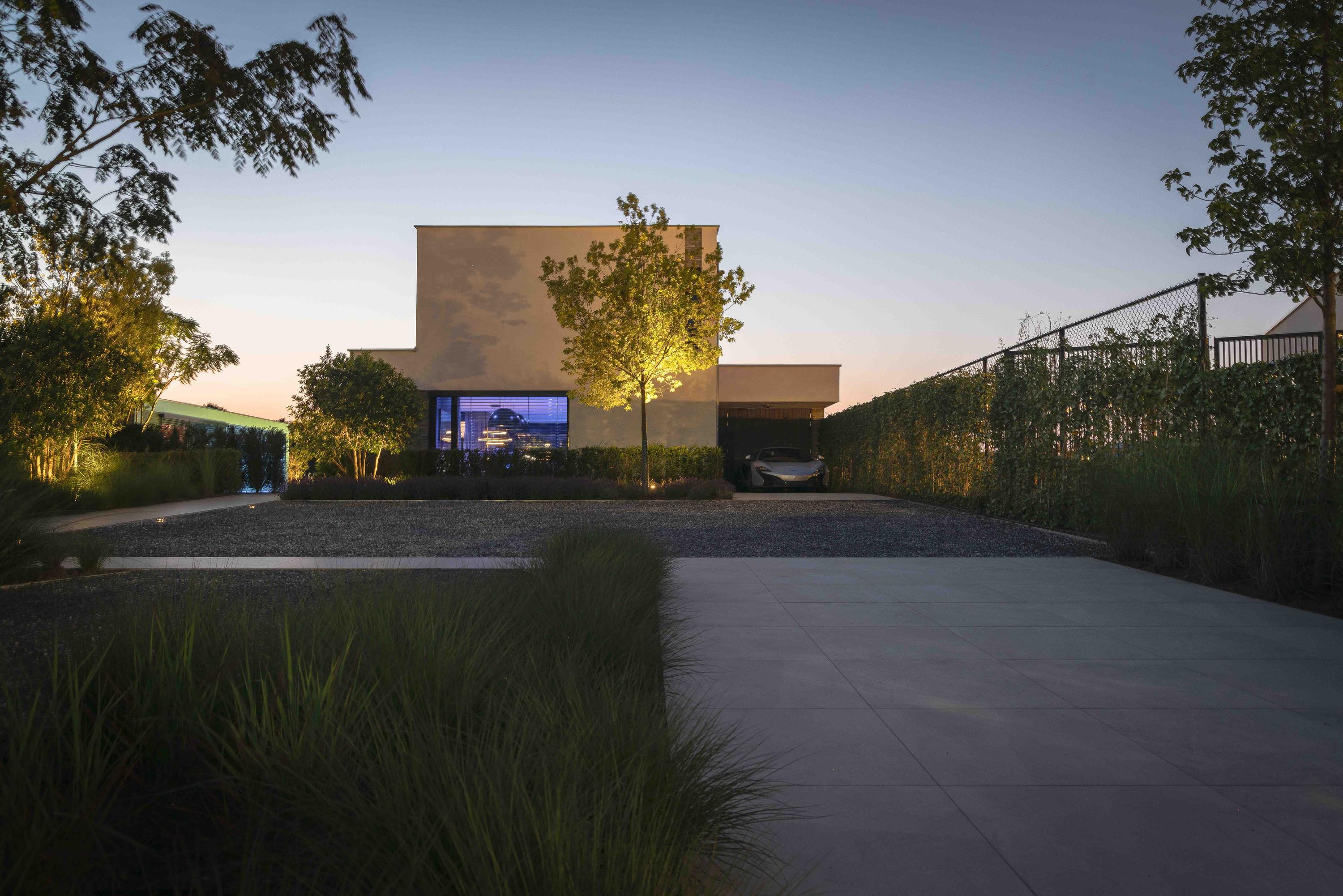 At the front, the villa is embraced by a generous garden that immediately sets the tone for the exclusive character of the property. The carefully designed combination of modern paving and green borders creates a harmonious and refined whole. The private driveway, finished with high?quality tiles and subtle greenery, leads you stylishly to the entrance.