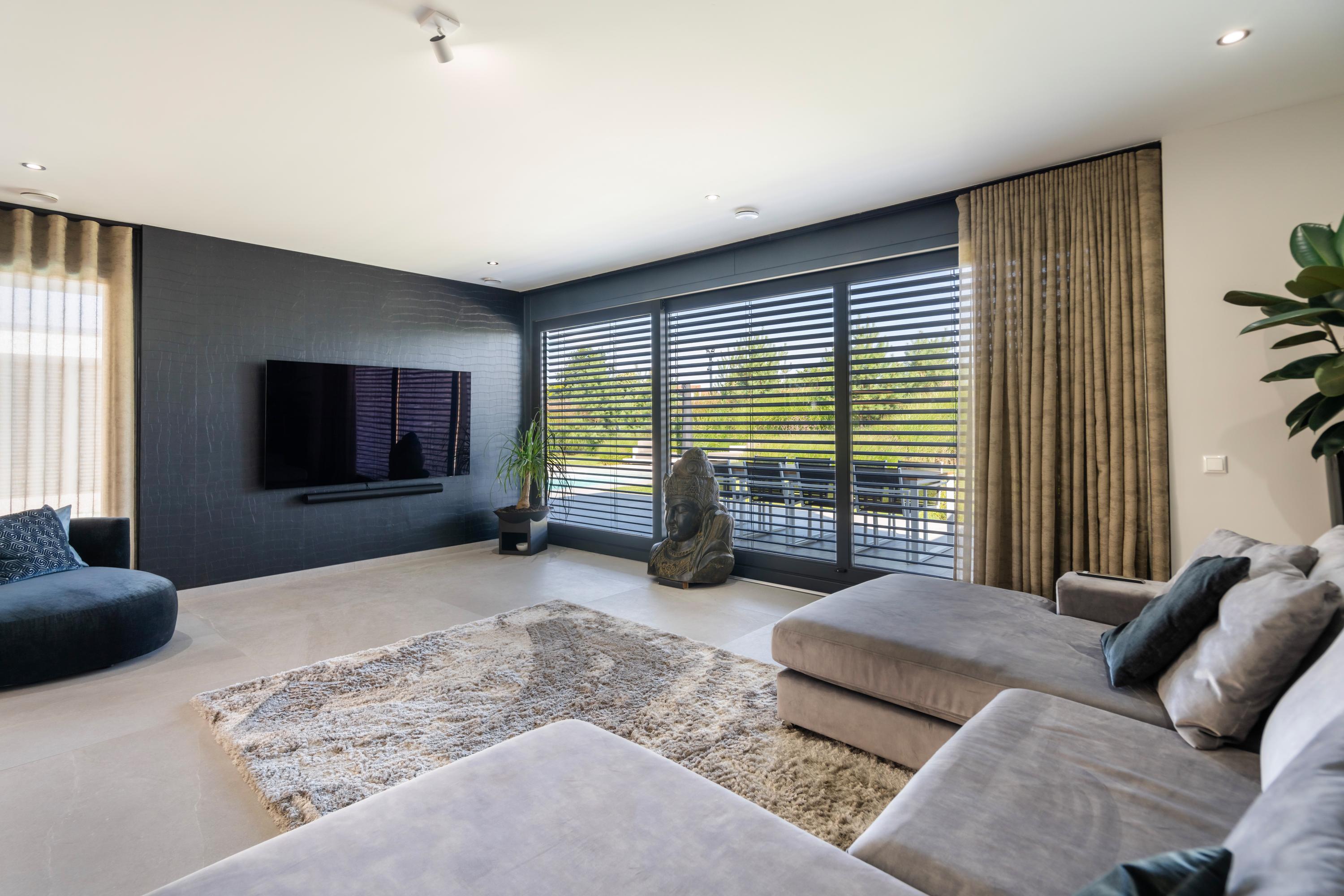 In the living area, the sense of space and the large windows immediately stand out, providing abundant natural daylight and a strong connection with the surroundings. The large windows are fitted with electrically operated curtains.