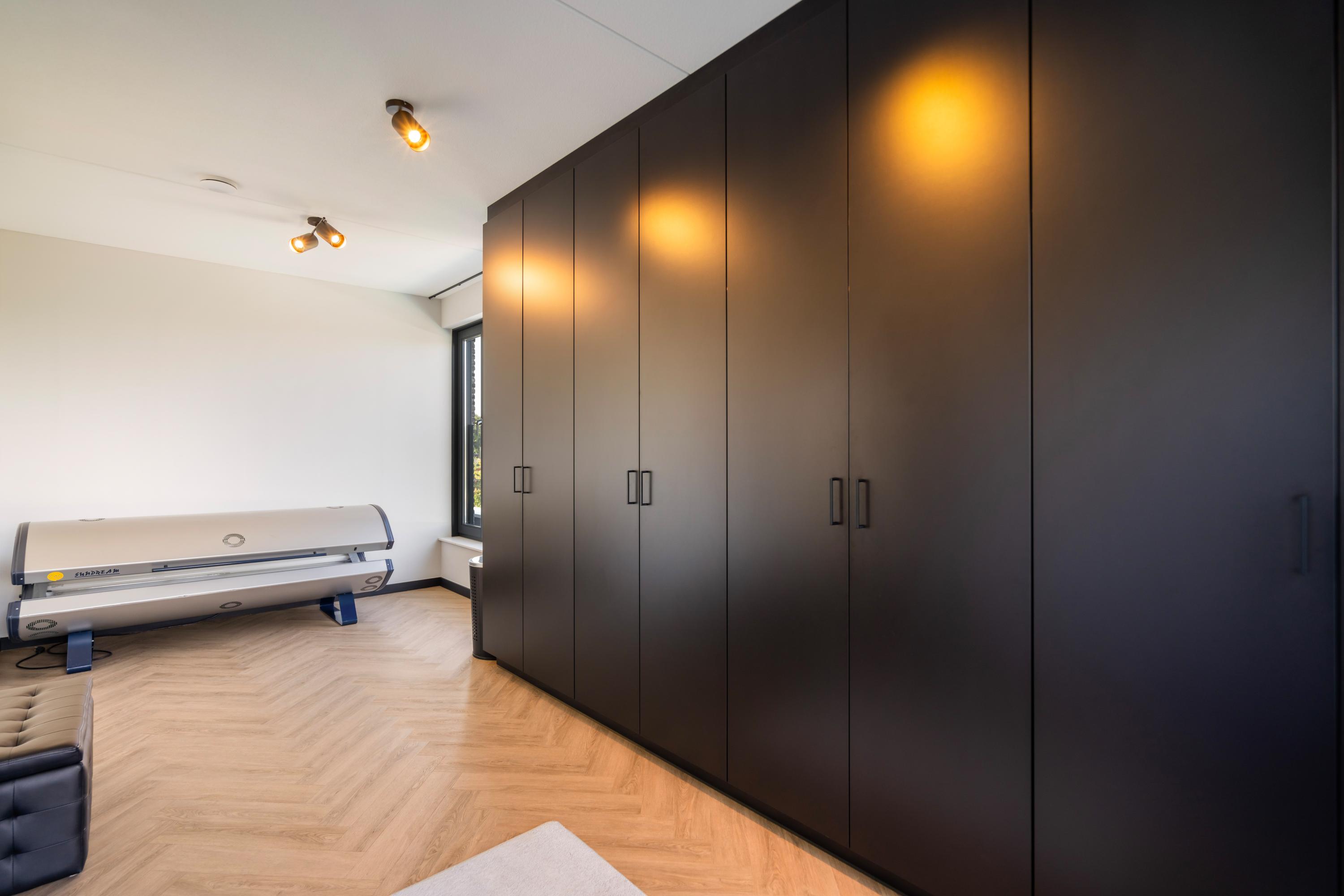 The first floor offers three spacious bedrooms, a luxurious bathroom, and a separate toilet. The bedrooms and landing feature the same modern, threshold?free PVC herringbone floor. Underfloor heating and cooling are also present on this level. One of the bedrooms includes a custom?made wardrobe wall.