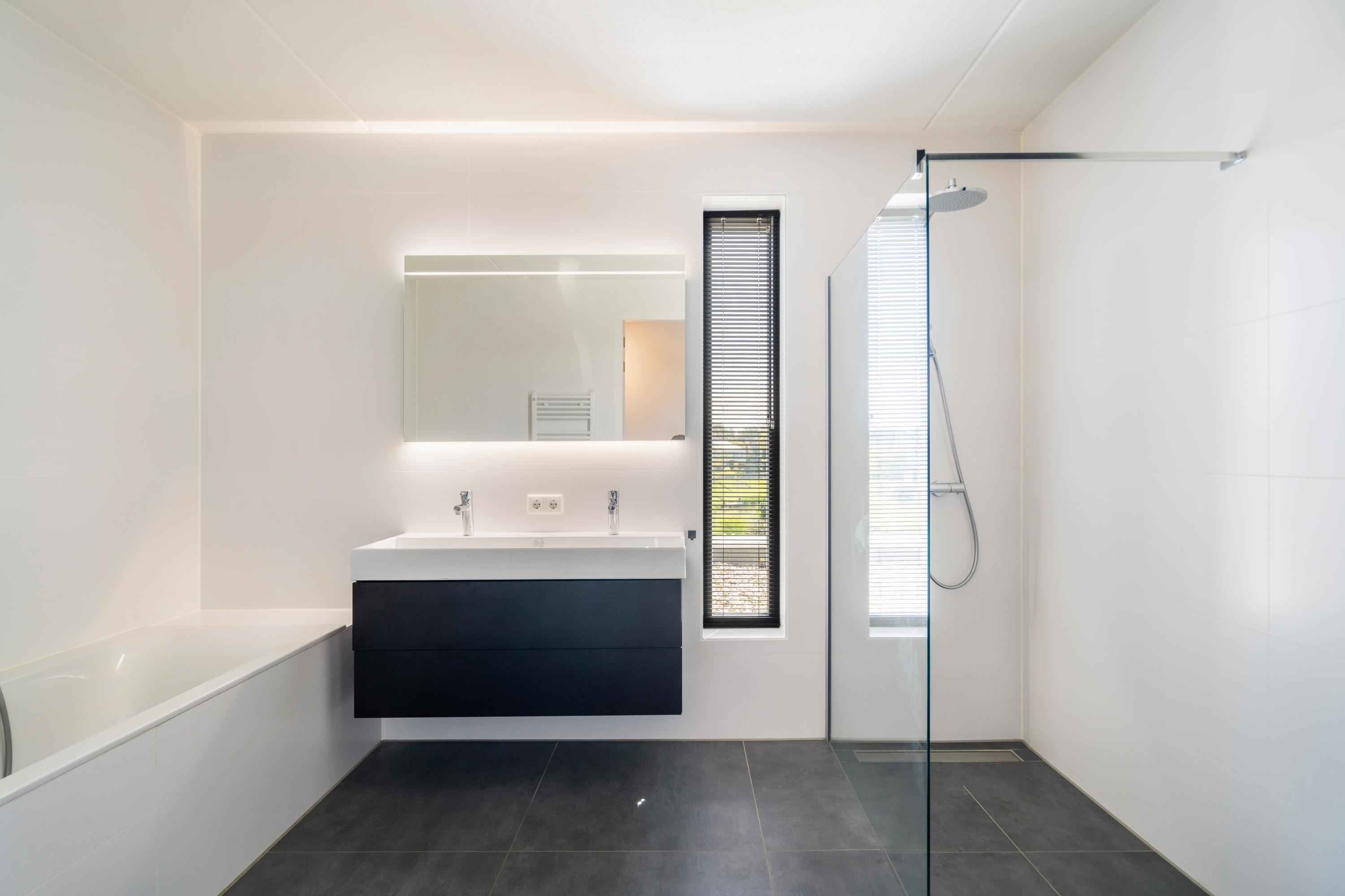 The bathroom is equipped with a spacious walk?in shower, bathtub, double washbasin with cabinet, and a practical storage wall. A separate storage room houses the technical installations.
