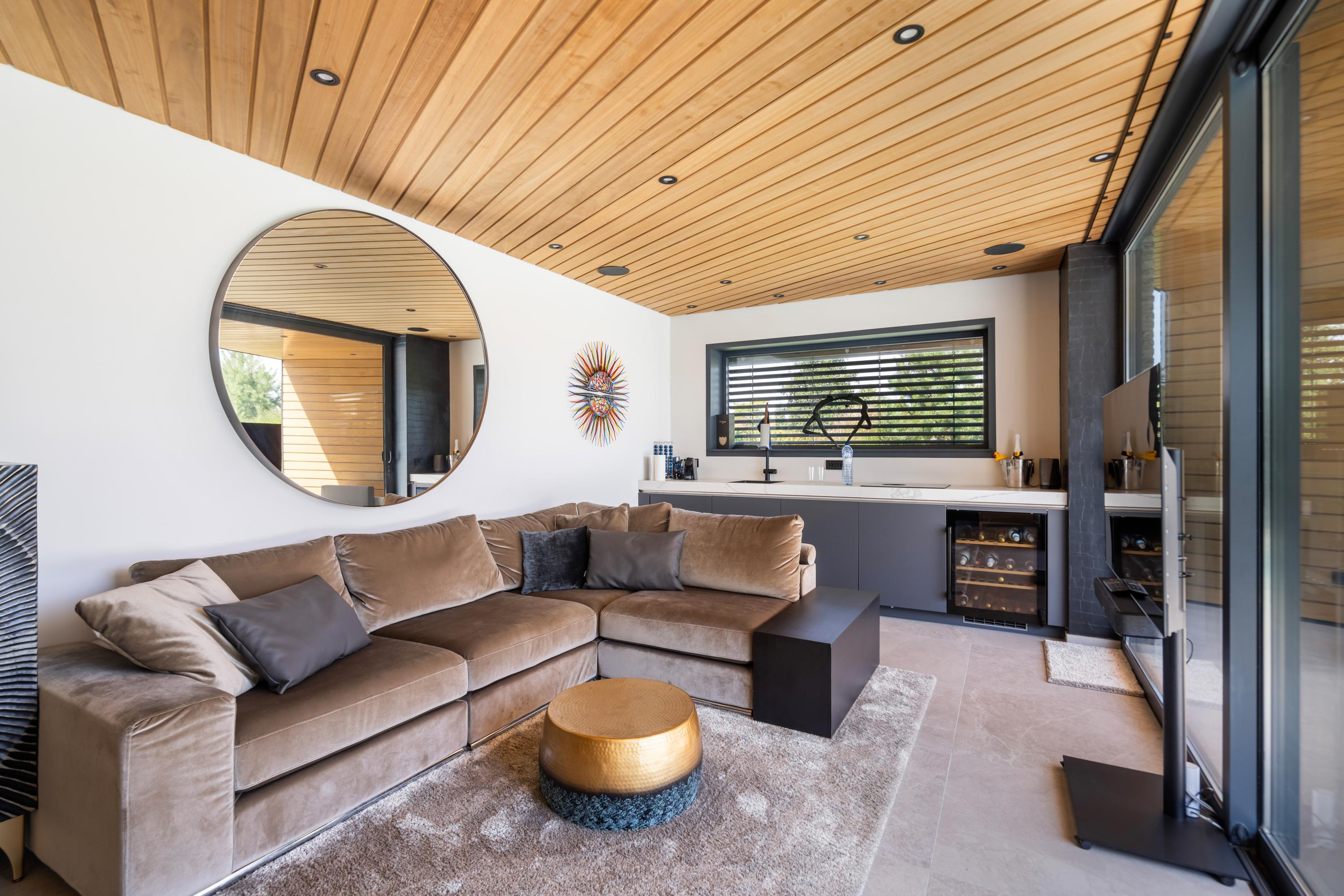 The spacious side and rear gardens are finished to the same high standard. A true highlight is the luxurious pool house, complete with sauna and swimming pool. The carefully selected Finnish wooden interior creates an ultimate wellness atmosphere. Upon entering, the rotating wood?burning stove immediately catches the eye — a real statement piece.