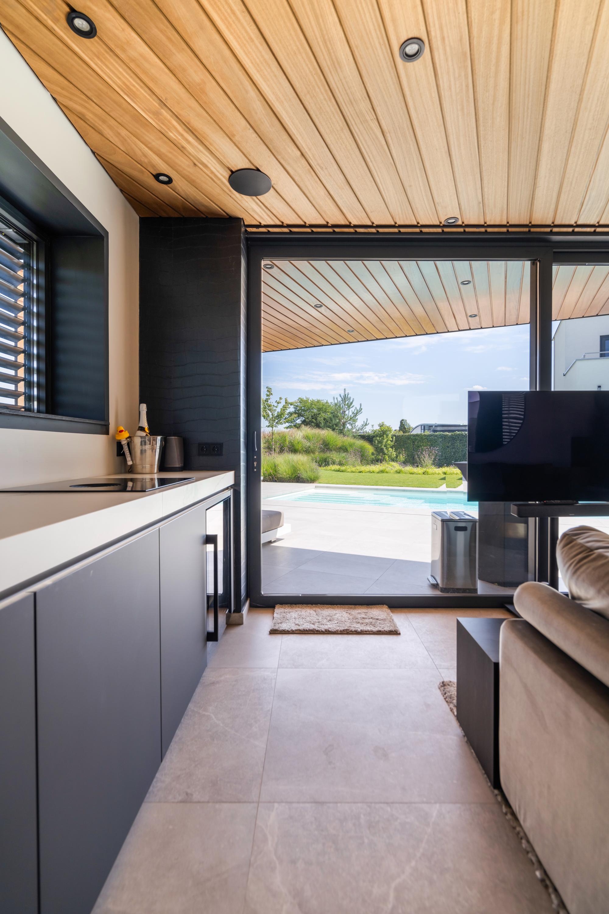 The pool house is equipped with a kitchenette with sink, wine climate cabinet, refrigerator, induction hob with Bora extraction, and various storage cabinets. Built?in speakers and lighting are also present. Outside, you will find an outdoor shower with thermostatic tap. A separate room houses all technical installations.