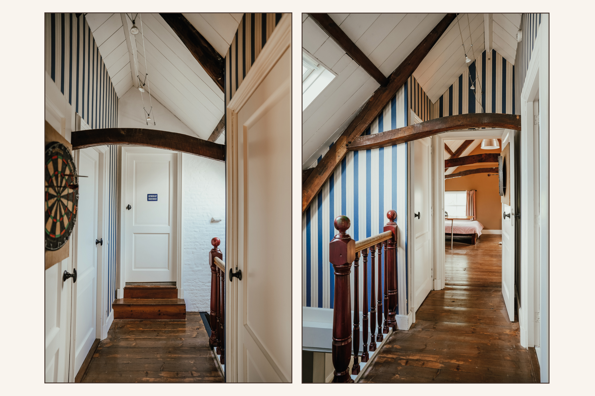 From the kitchen, you can access the utility room, which has its own entrance from the driveway. This area connects to the hallway that leads to the guesthouse, stable area, barn, and staircase to the office space.