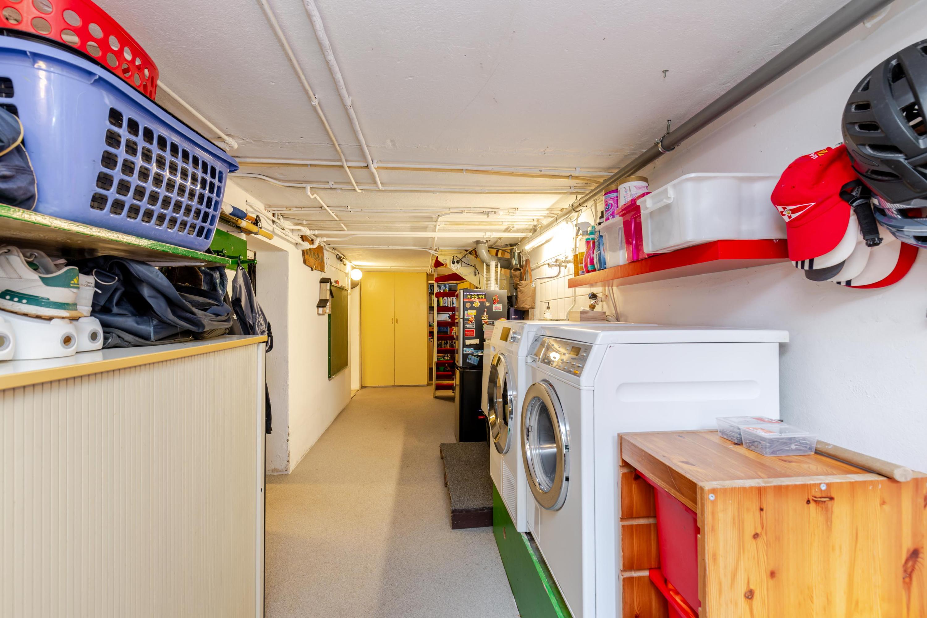 A fantastic space extending under the entire house with a ceiling height of approx. 190cm in the hallway and approx. 175cm in the rooms under the beams and approx. 198cm between the beams, consisting of a hallway with a washing machine and dryer setup and access to the backyard, a pantry (ideal for a wine cellar), and 2 spacious rooms or hobby rooms that can be used for multiple purposes.