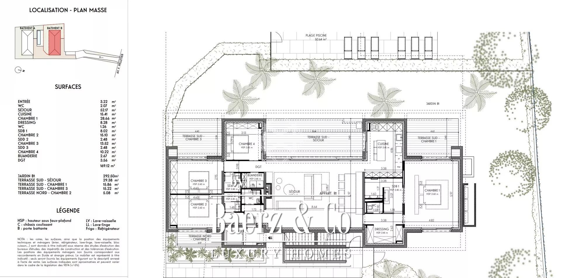 The apartments benefit from magnificent terraces extended by private gardens on the lower levels. The residence, built to impeccable standards, also offers underground garages and a shared swimming pool.