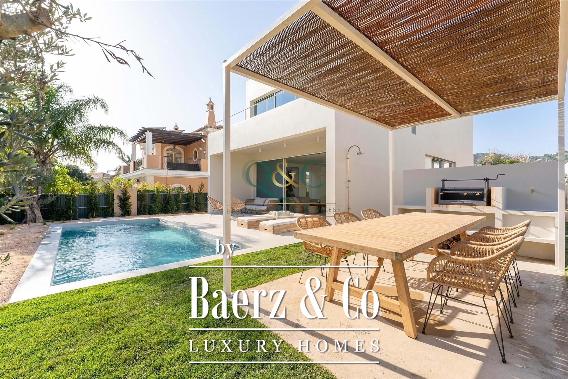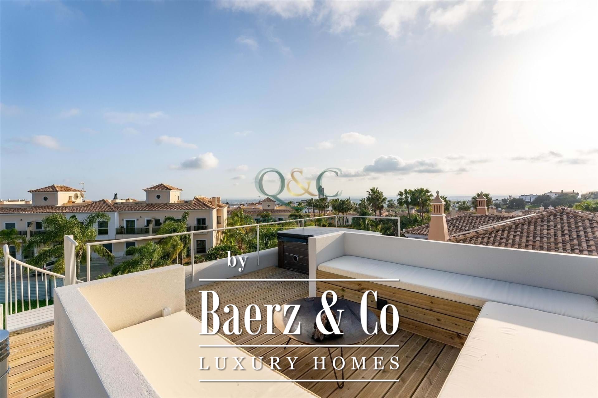 The main living spaces open directly onto sun terraces, private garden, and a swimming pool bordered by dedicated outdoor dining and barbecue areas. A rooftop terrace offers sweeping sea views and a comfortable seating area around a fire pit, ideal for enjoying the Algarve’s quiet sunsets. The lower ground floor encompasses a generous basement and an enclosed garage, providing flexibility for use as a leisure room, gym, cinema, or additional accommodation.