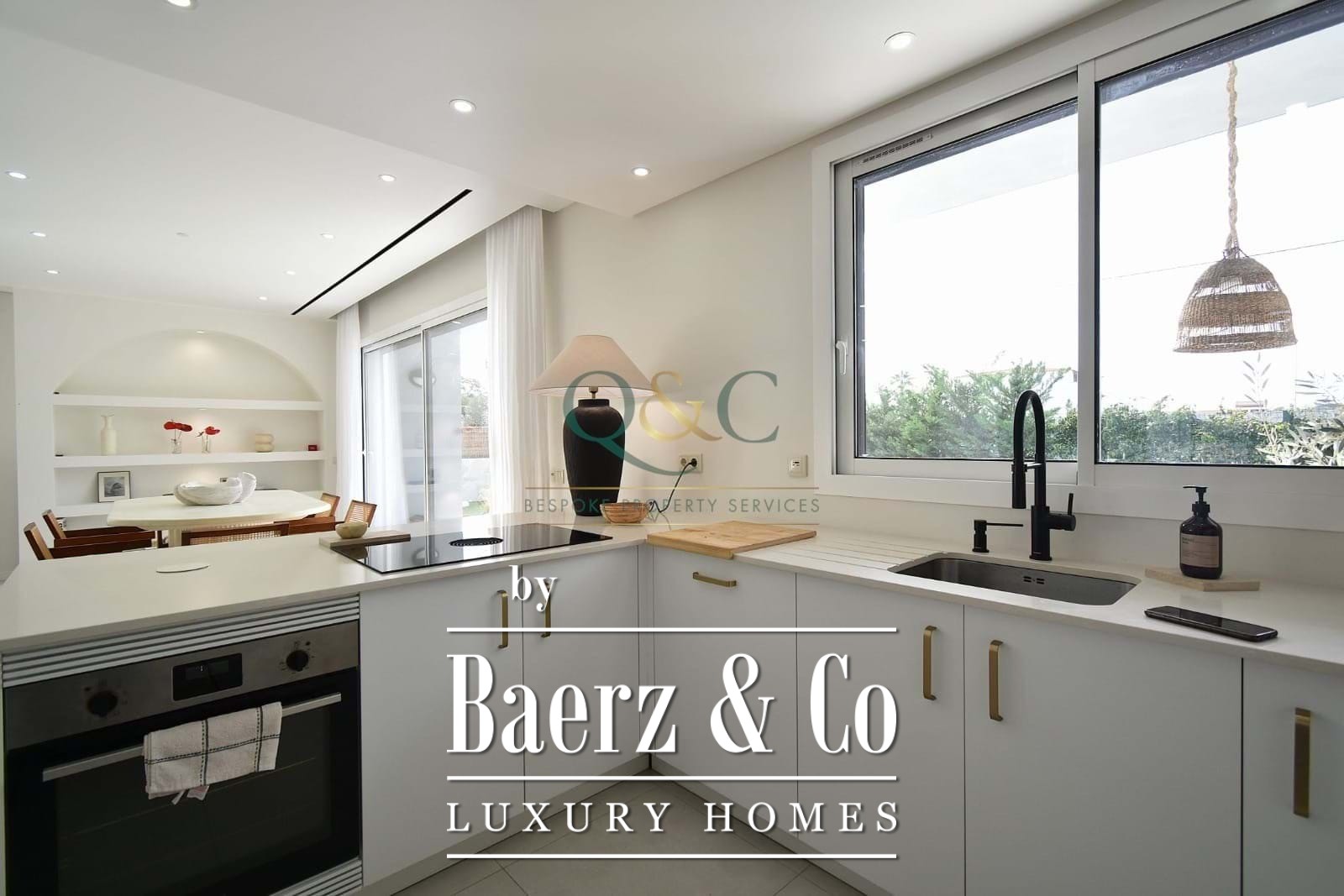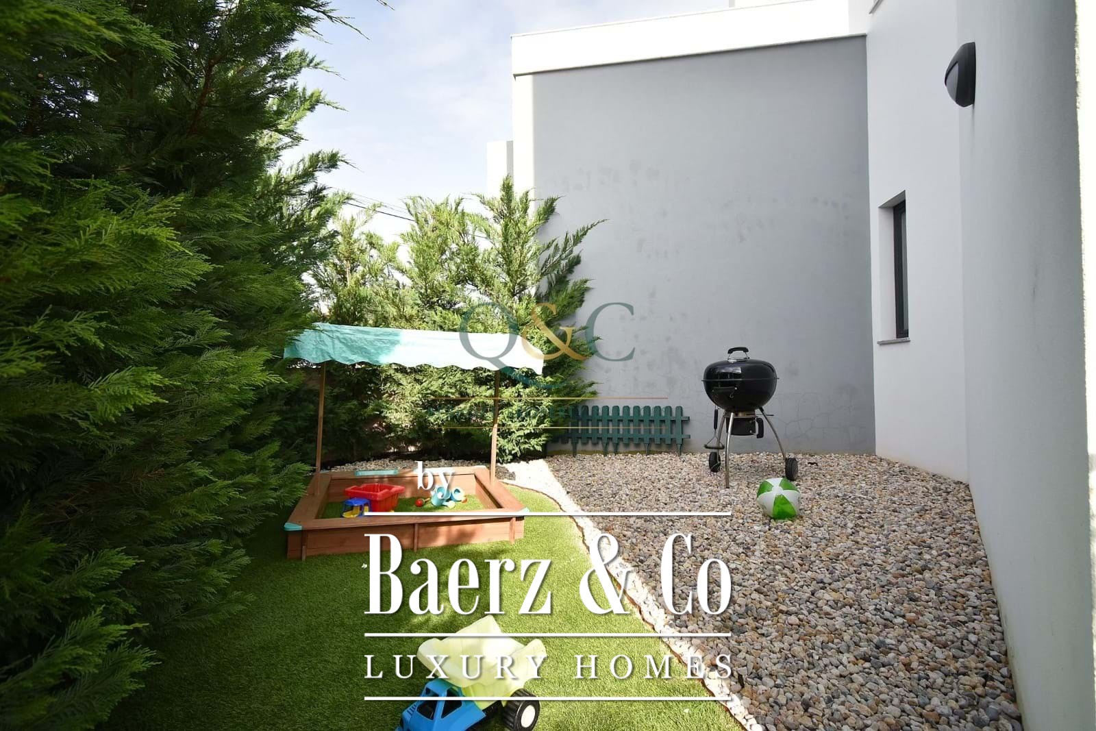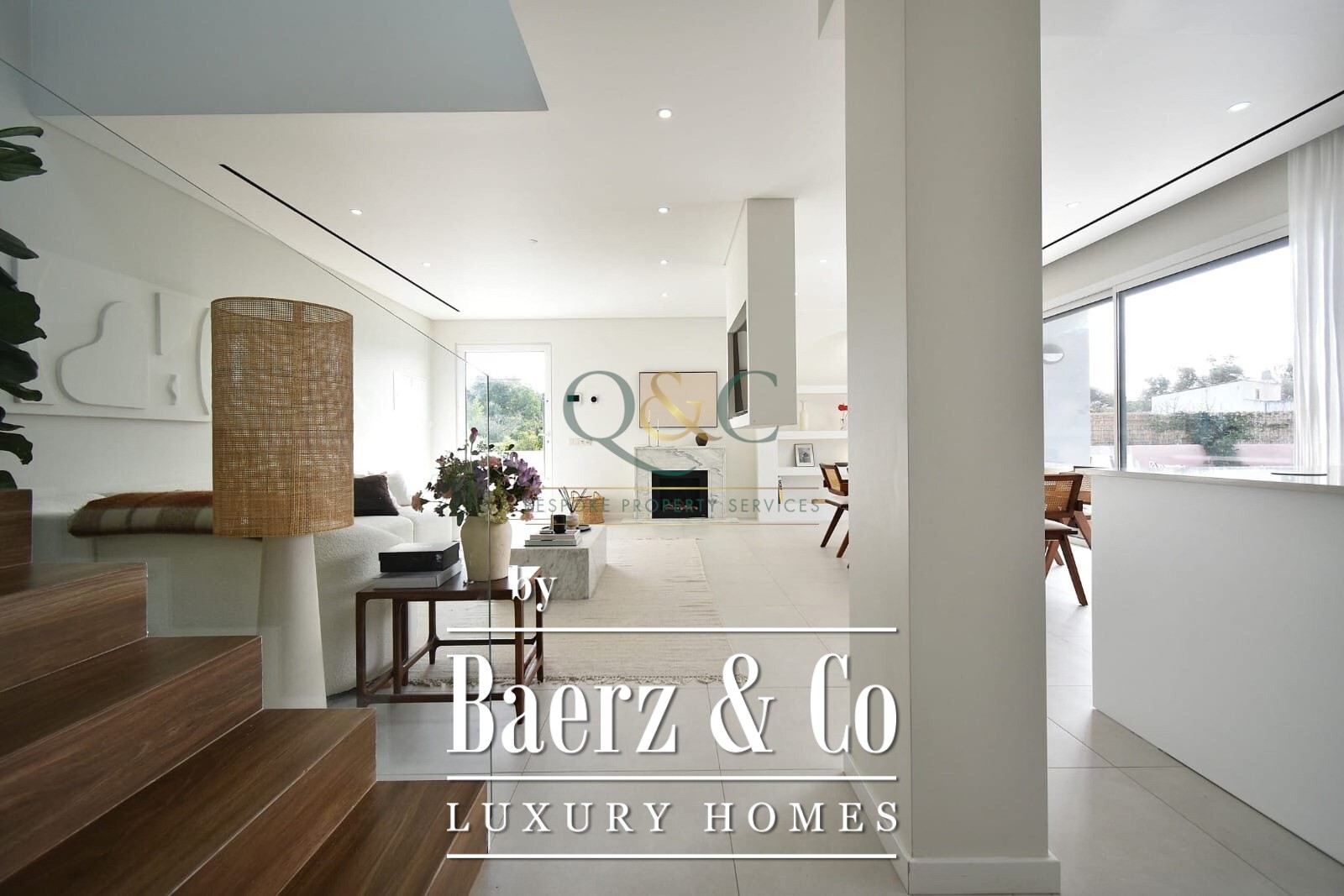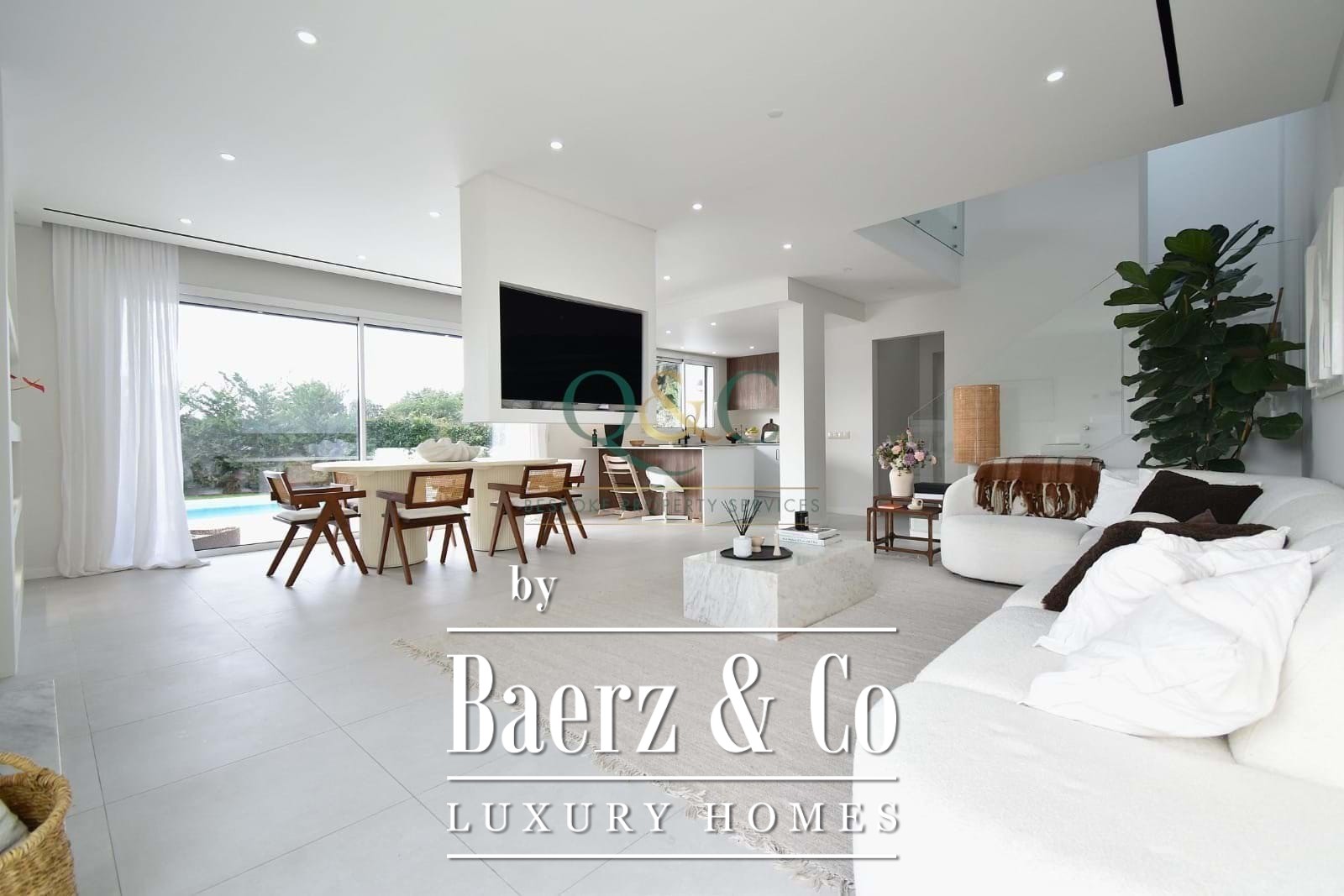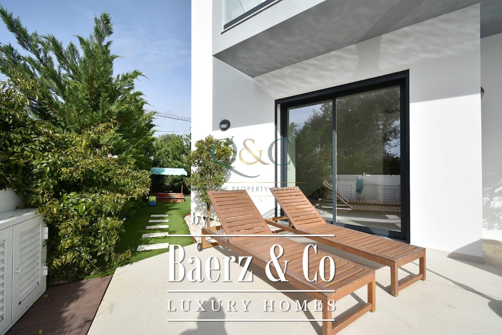 On the ground floor, an open living and dining room with an ethanol marble fireplace creates a soft rhythm between interior space and sunlight, complemented by central air conditioning. The open-plan kitchen, laundry, and pantry support daily living, while the patio invites relaxation beside the chlorine pool and a garden shaped for quiet enjoyment. Almost every room is oriented south and benefits from abundant natural light.