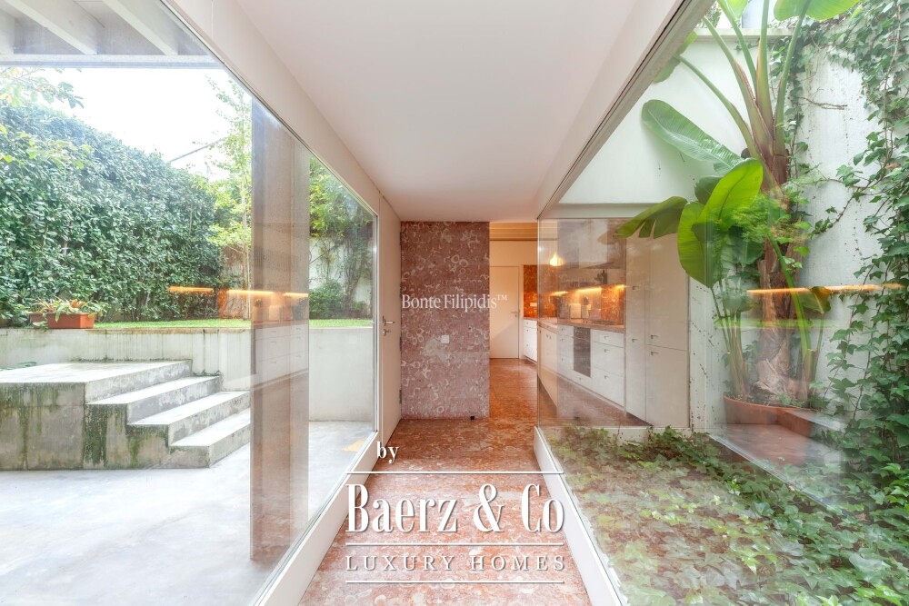 The primary living spaces are marked by original stone flooring and softly vintage accents, with large panoramic windows drawing natural light into the open-plan social area. Here, living and dining zones flow seamlessly out to an 80 m² private garden, a tranquil retreat bordered by mature greenery for quiet moments or reserved gatherings. Subtle material choices and precise detailing lend an understated sophistication to every space.