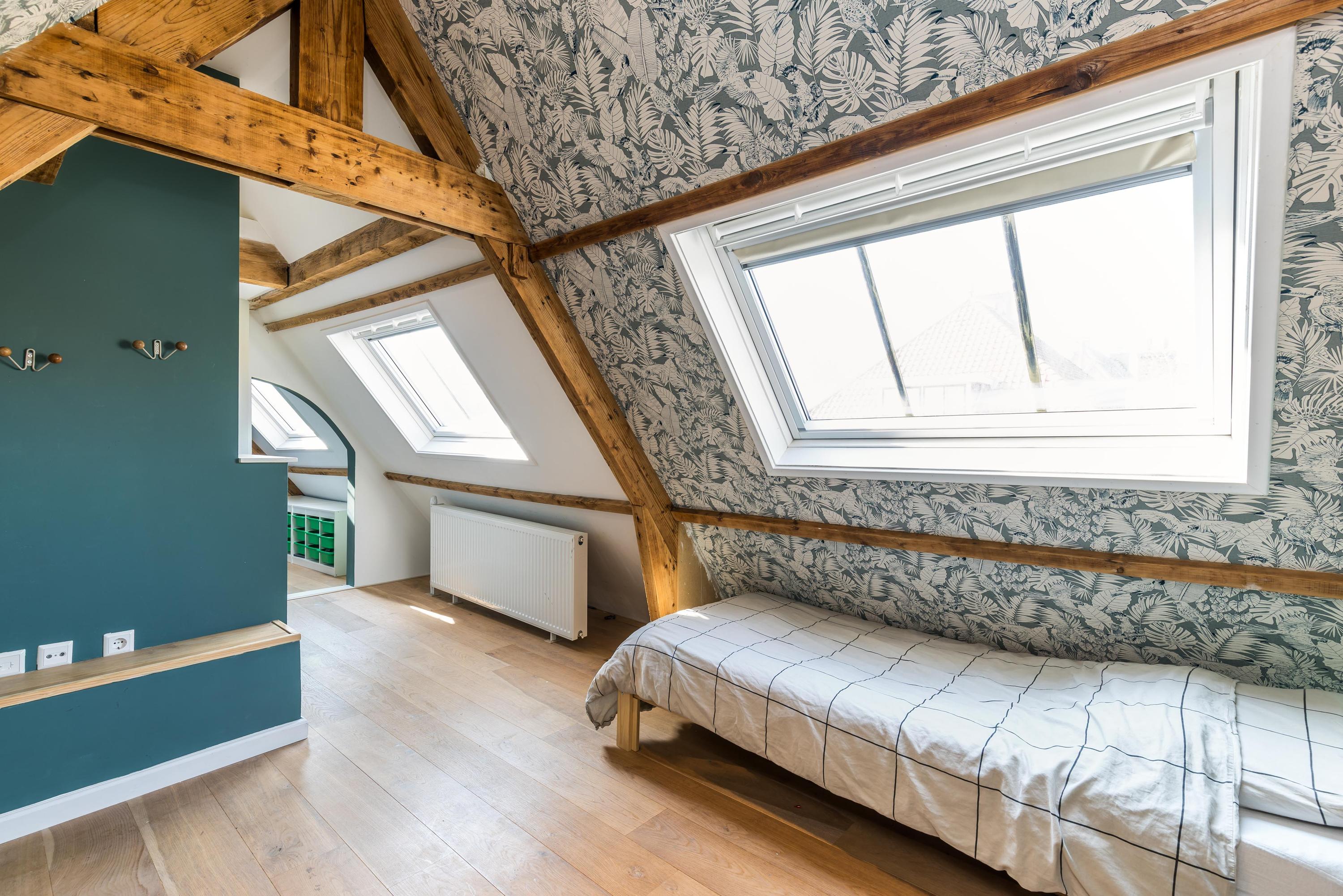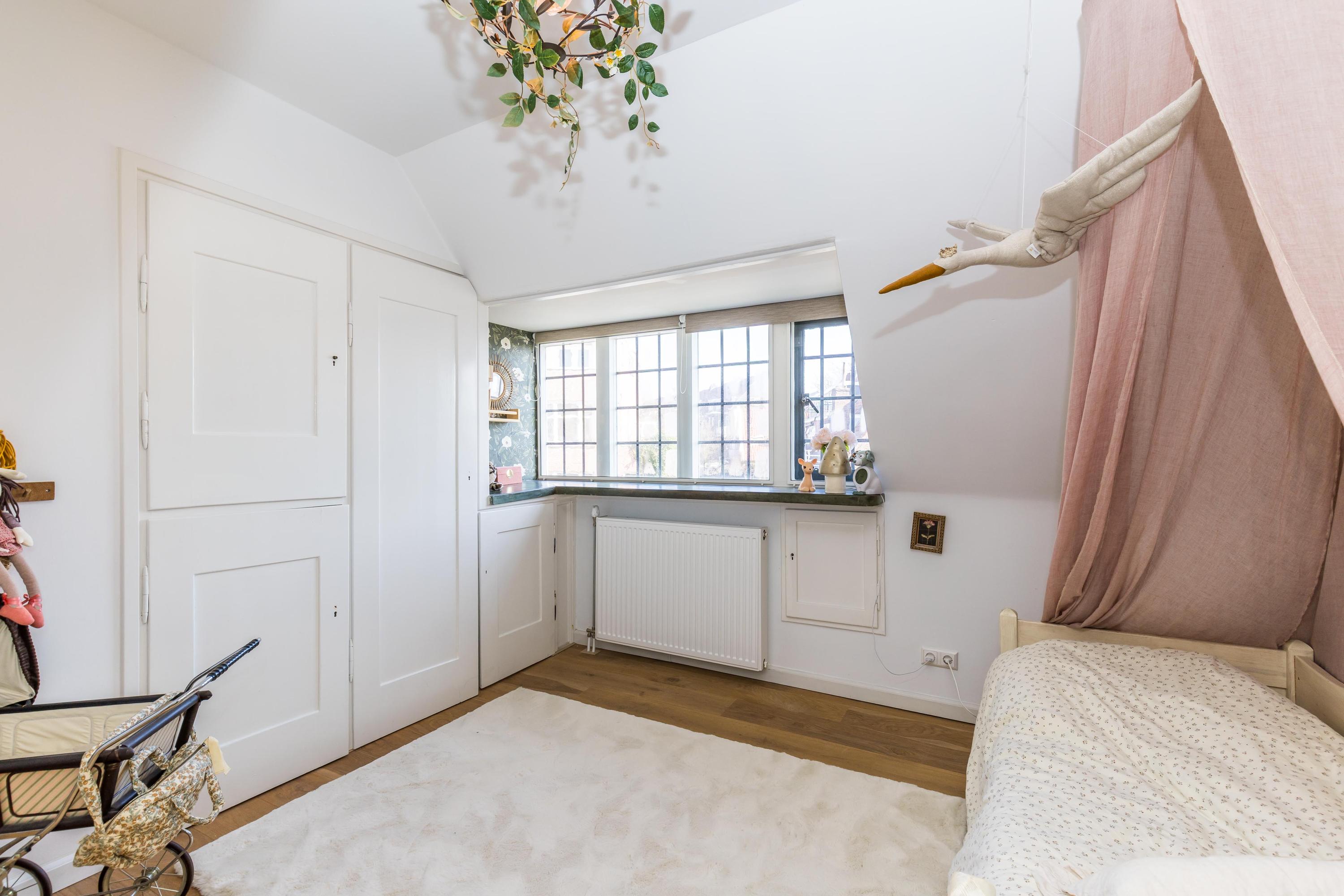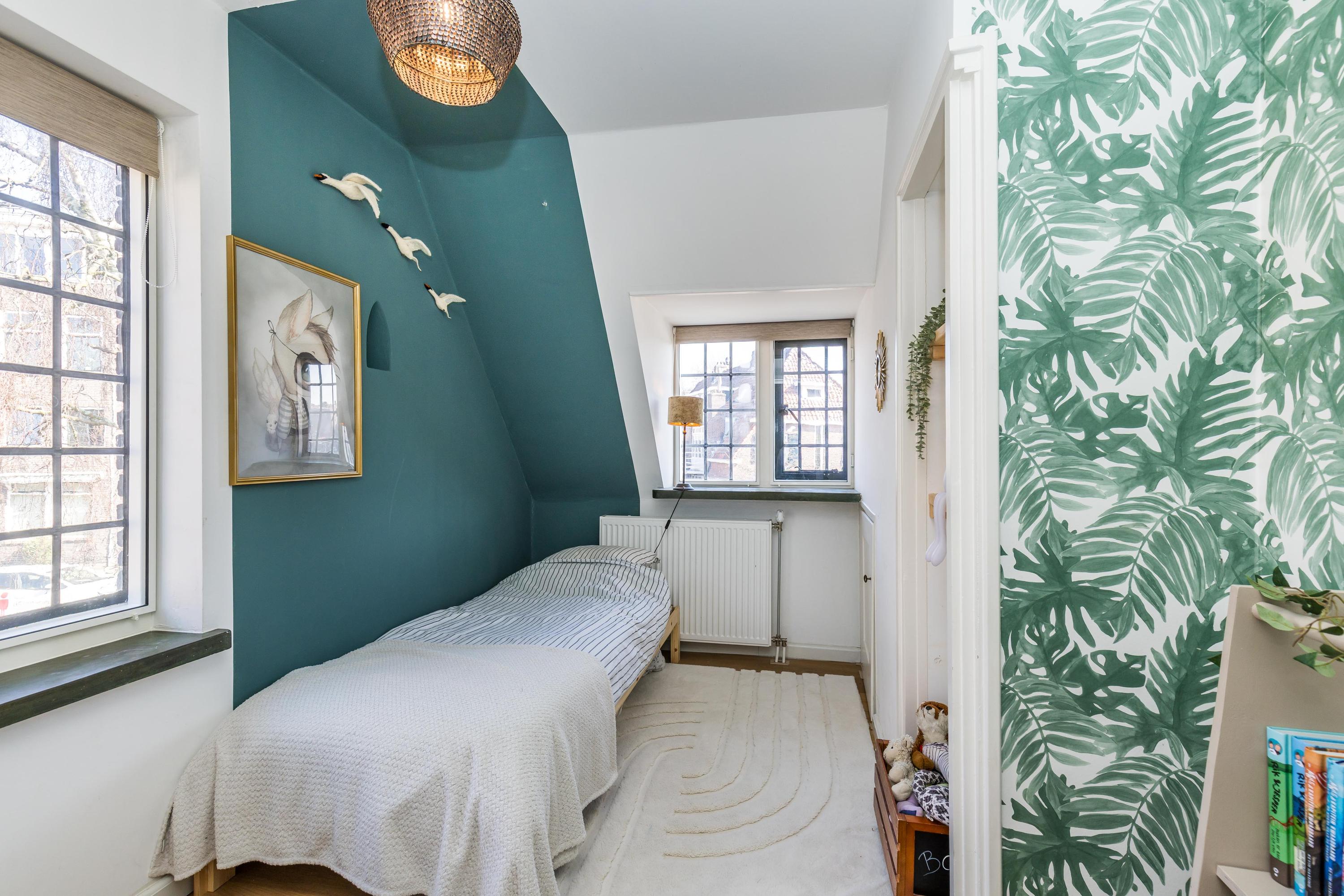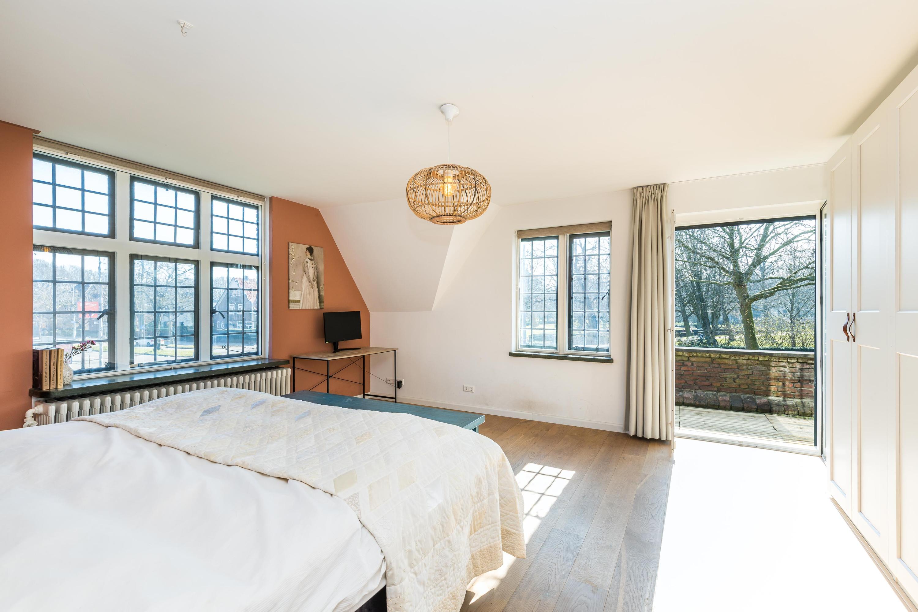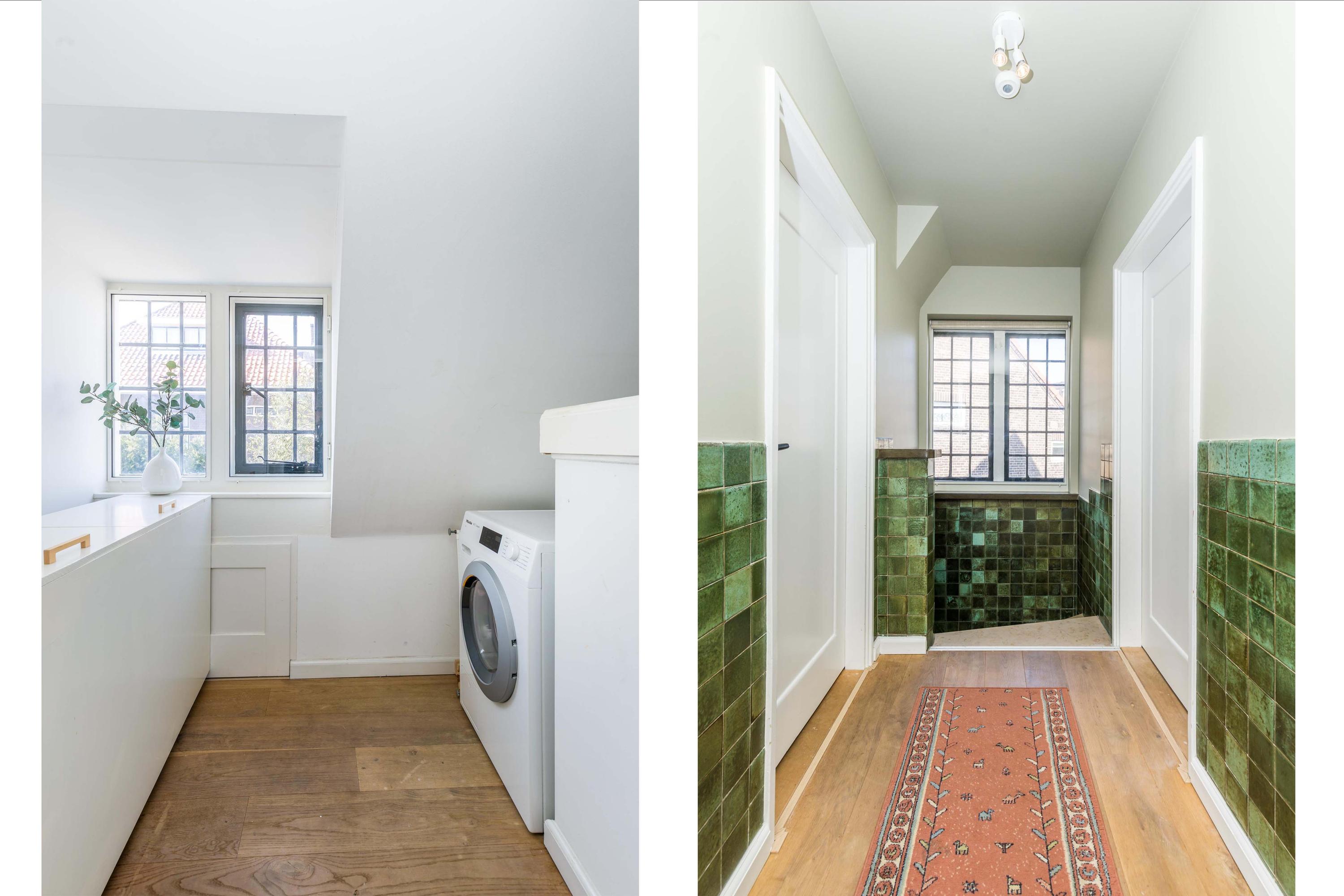 1st floor: beautiful and light landing with also original wall tiles. There are no fewer than 4 bedrooms on this floor, as well as a laundry room, a separate toilet and a surprisingly spacious and very tastefully decorated bathroom with a bath, walk-in shower and washbasin. The master bedroom is a dream, you feel like a king in terms of space, but also because of the charming balcony that can be reached through French doors. You imagine yourself in the annual royal balcony scene while you contemplate the sublime view over the Julianapark.
