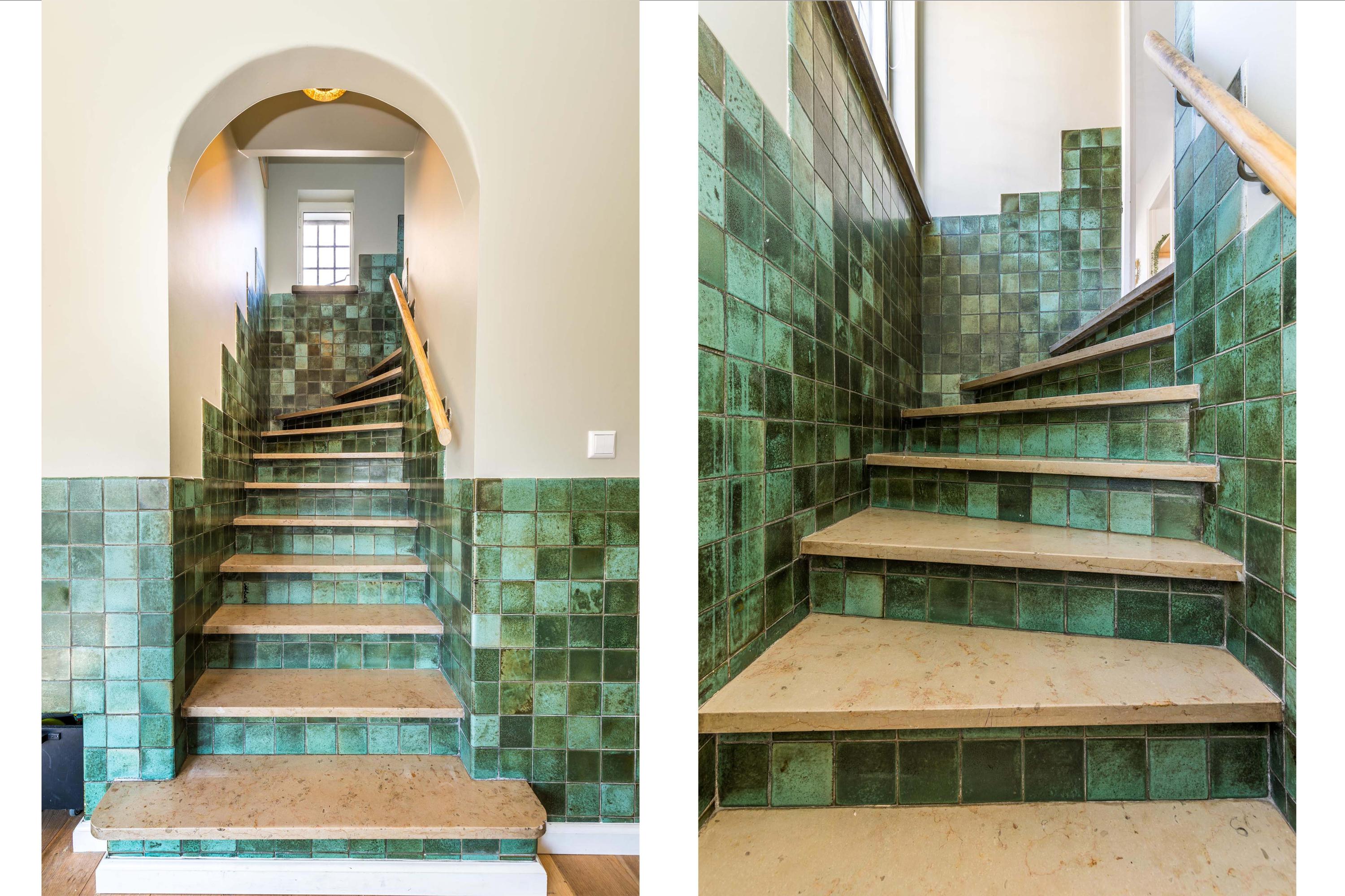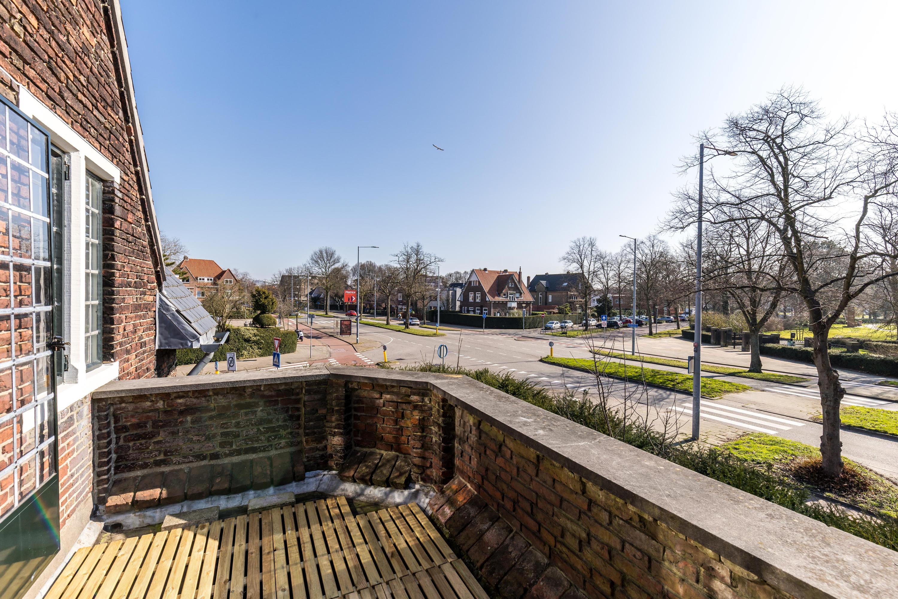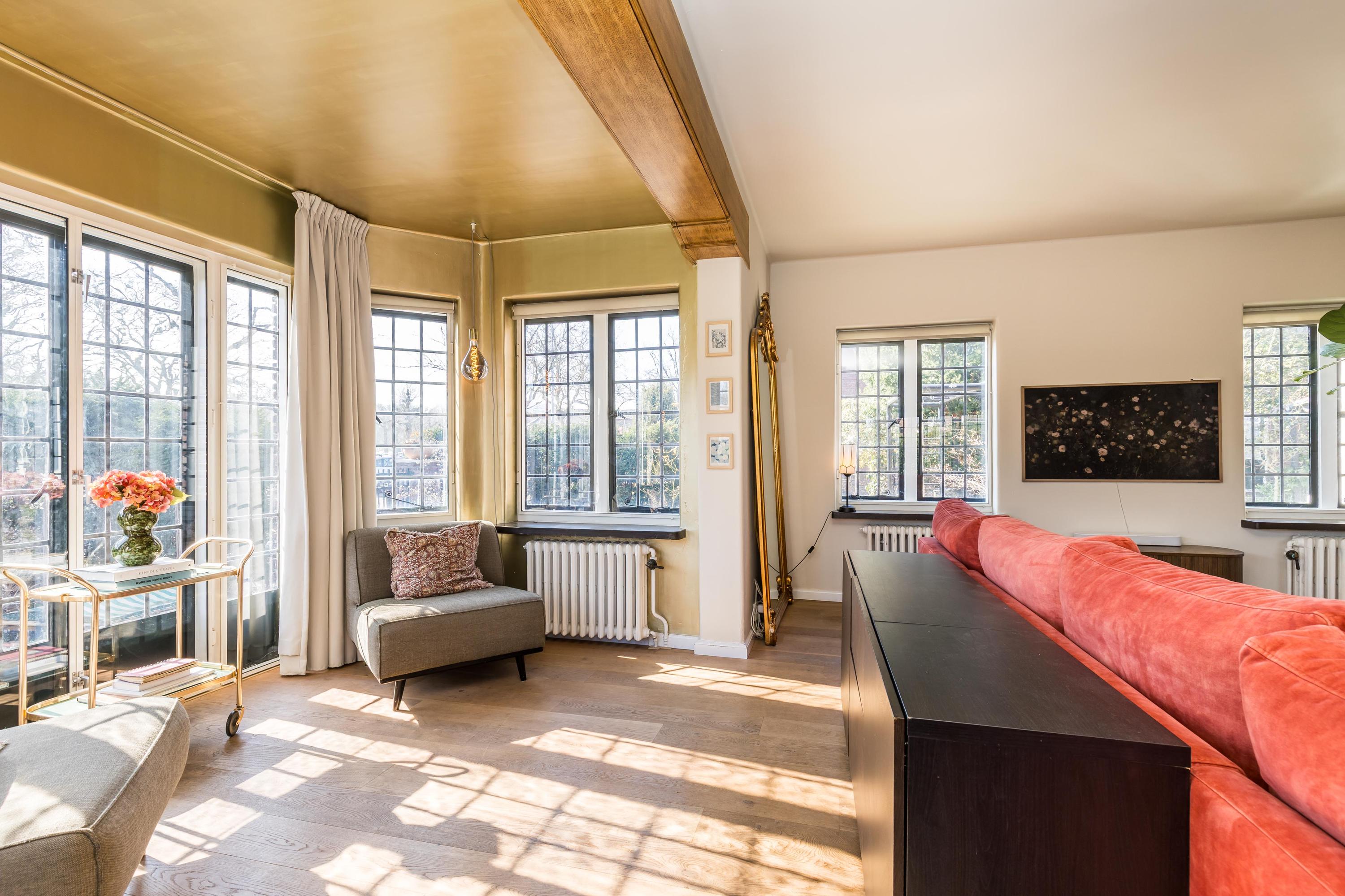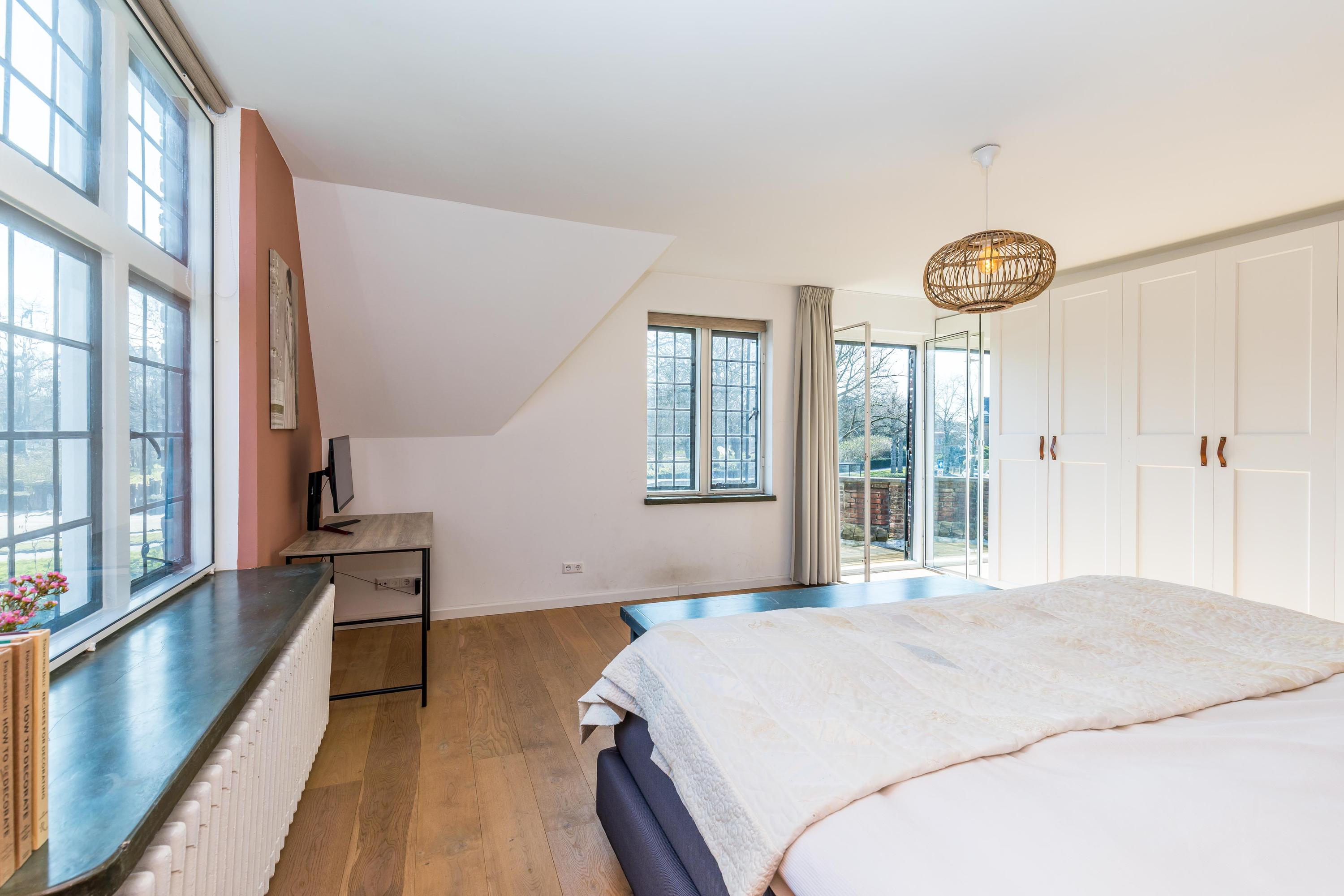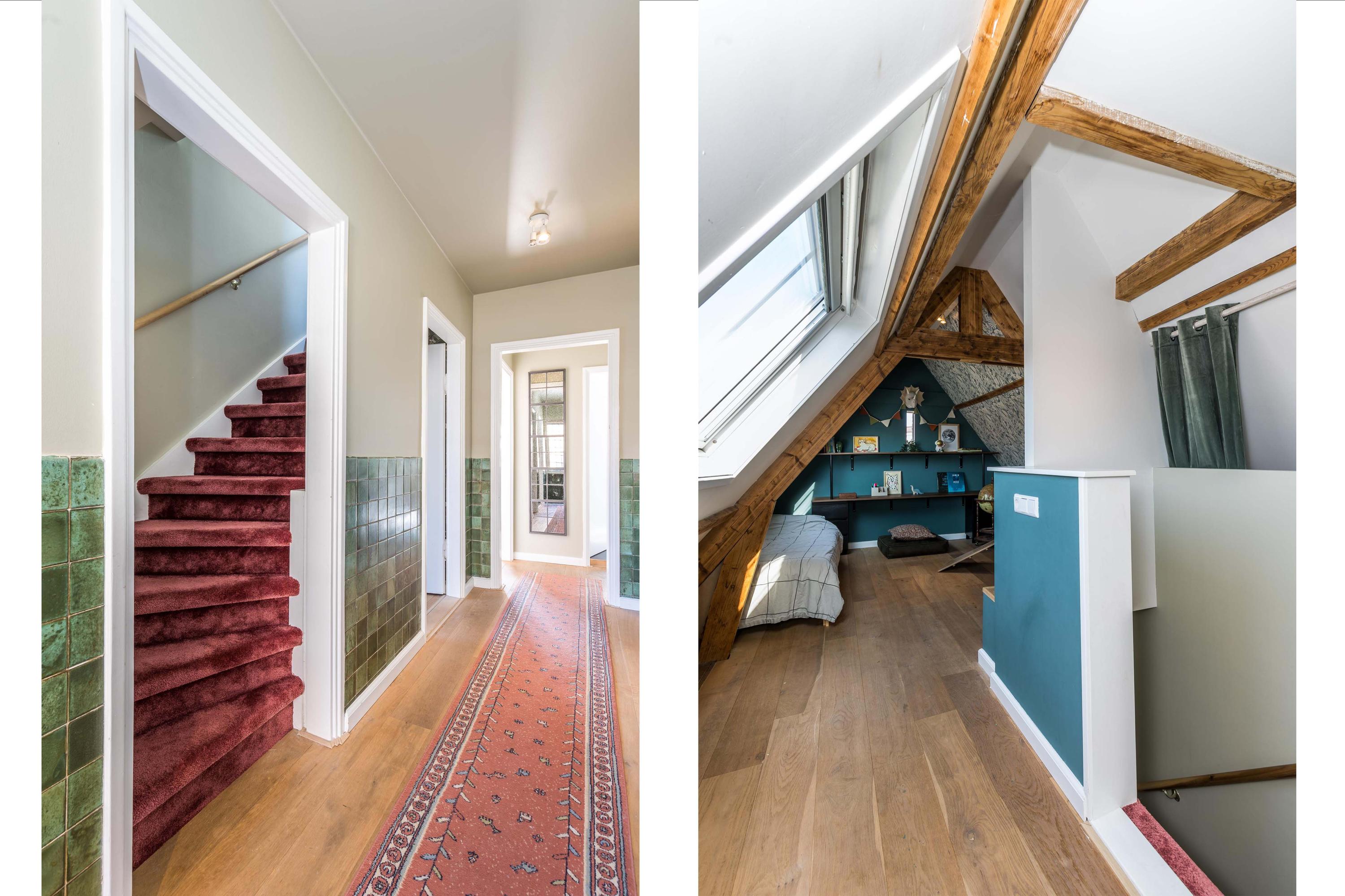 1st floor: beautiful and light landing with also original wall tiles. There are no fewer than 4 bedrooms on this floor, as well as a laundry room, a separate toilet and a surprisingly spacious and very tastefully decorated bathroom with a bath, walk-in shower and washbasin. The master bedroom is a dream, you feel like a king in terms of space, but also because of the charming balcony that can be reached through French doors. You imagine yourself in the annual royal balcony scene while you contemplate the sublime view over the Julianapark.