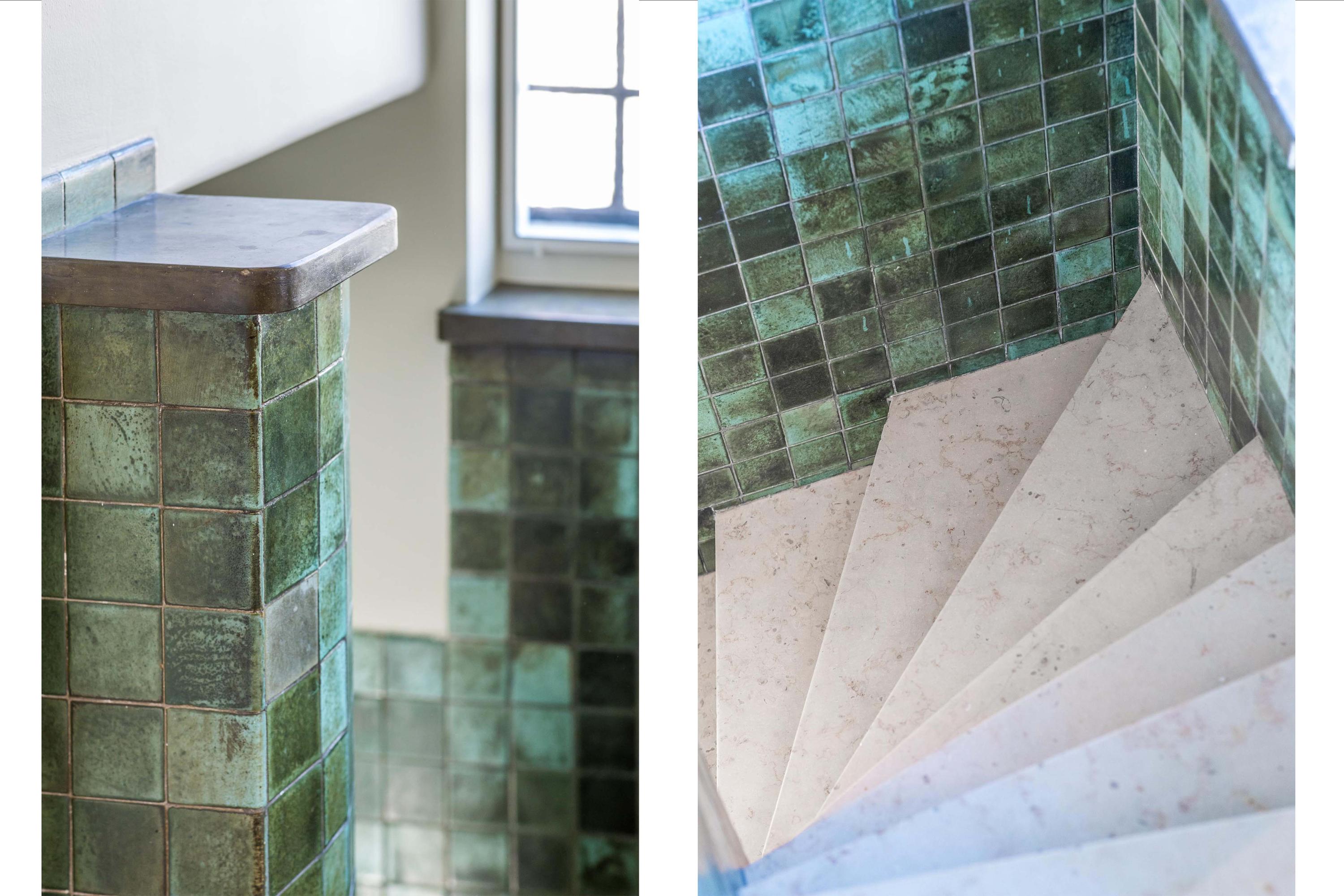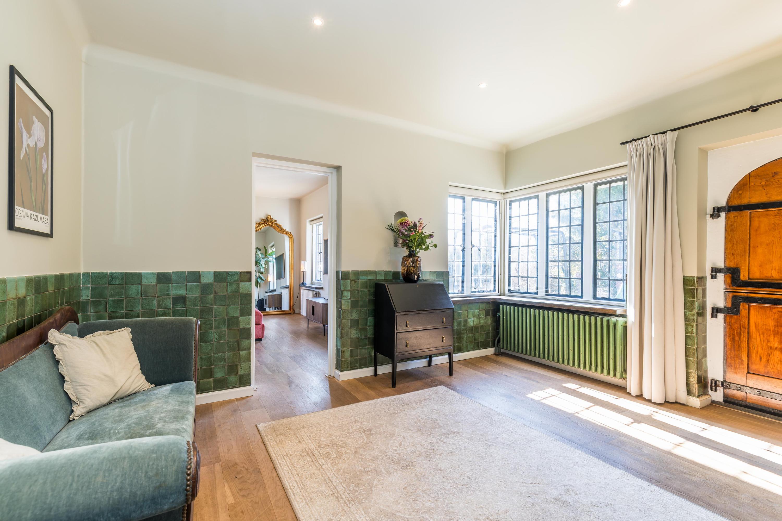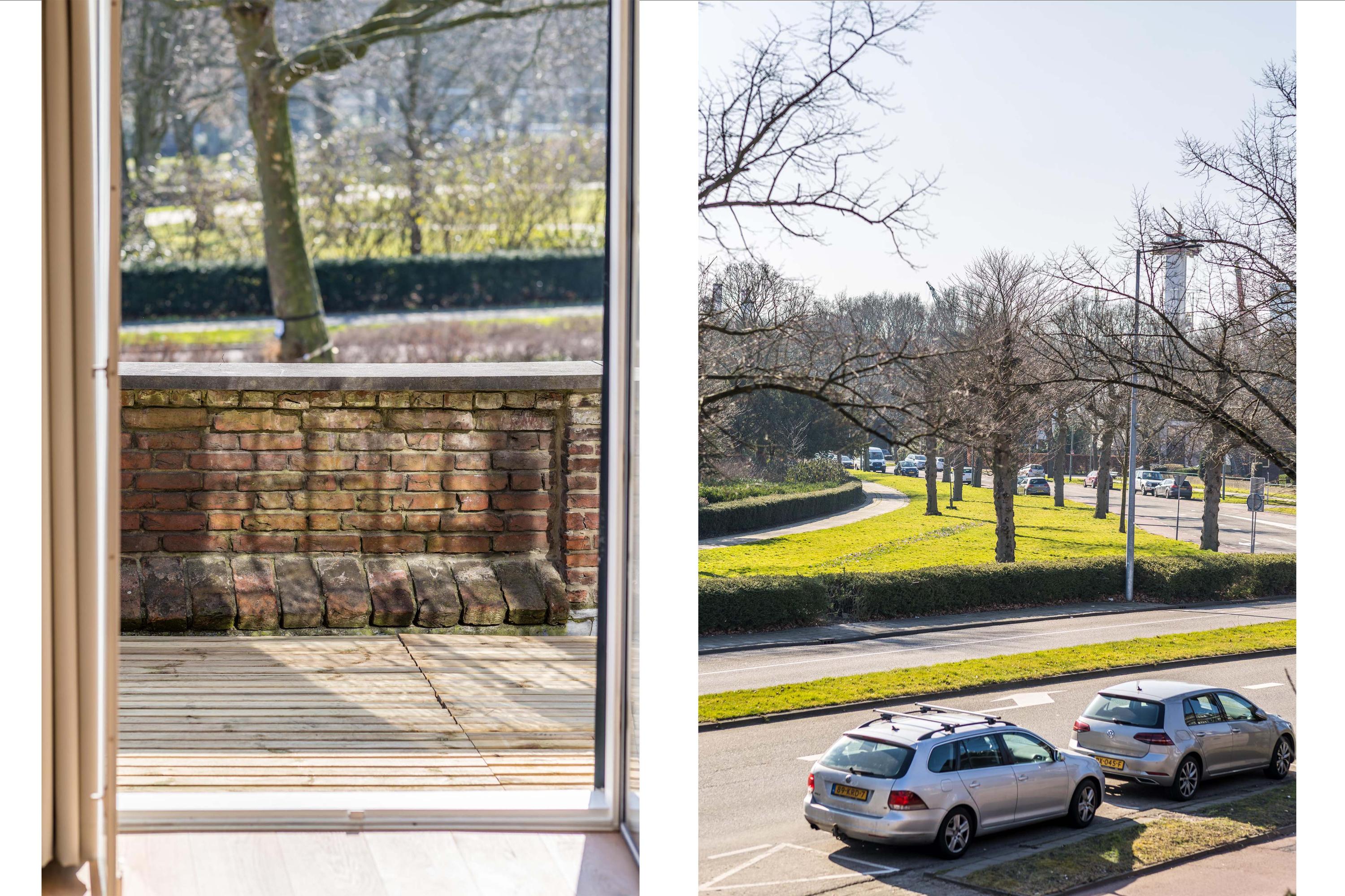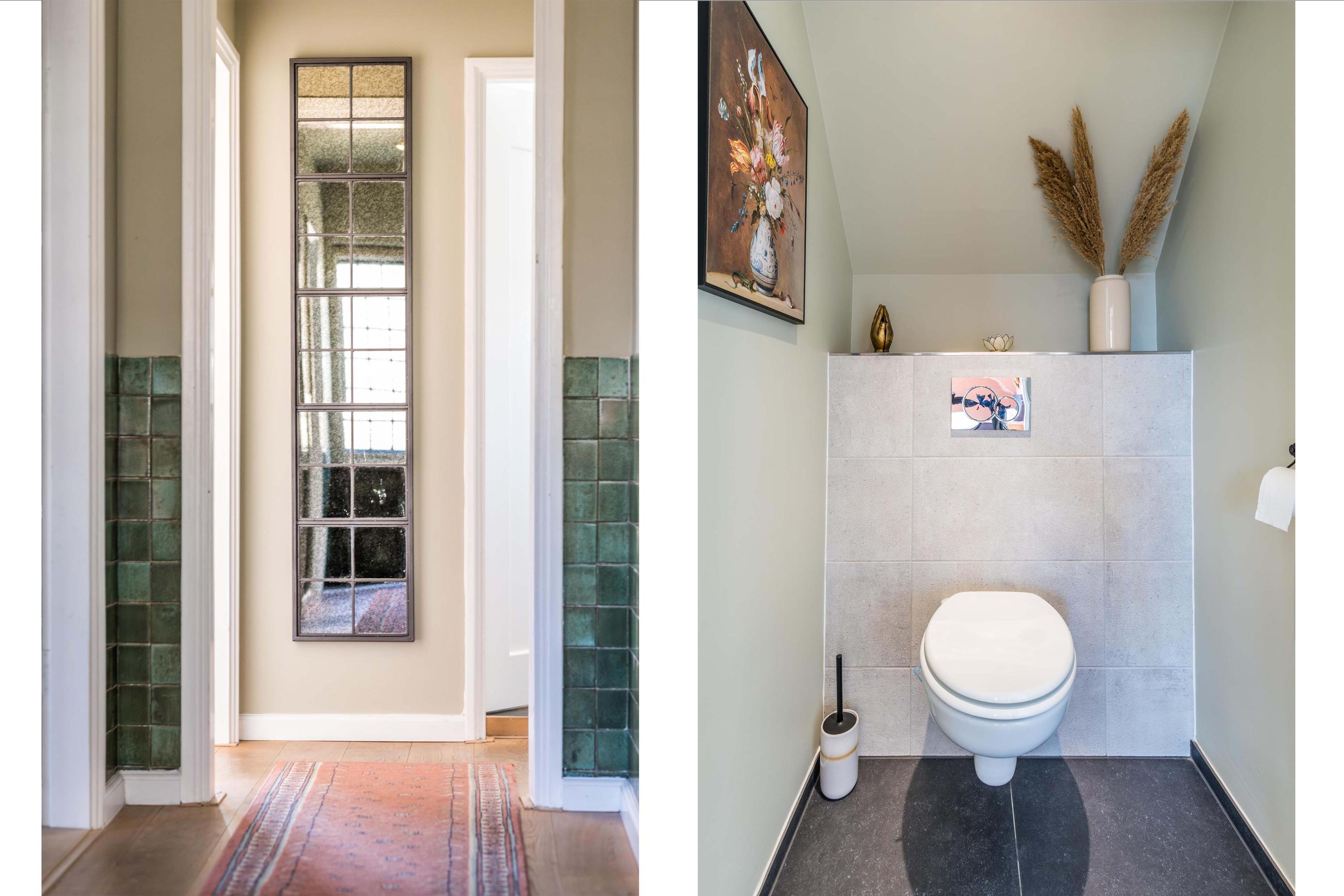 1st floor: beautiful and light landing with also original wall tiles. There are no fewer than 4 bedrooms on this floor, as well as a laundry room, a separate toilet and a surprisingly spacious and very tastefully decorated bathroom with a bath, walk-in shower and washbasin. The master bedroom is a dream, you feel like a king in terms of space, but also because of the charming balcony that can be reached through French doors. You imagine yourself in the annual royal balcony scene while you contemplate the sublime view over the Julianapark.