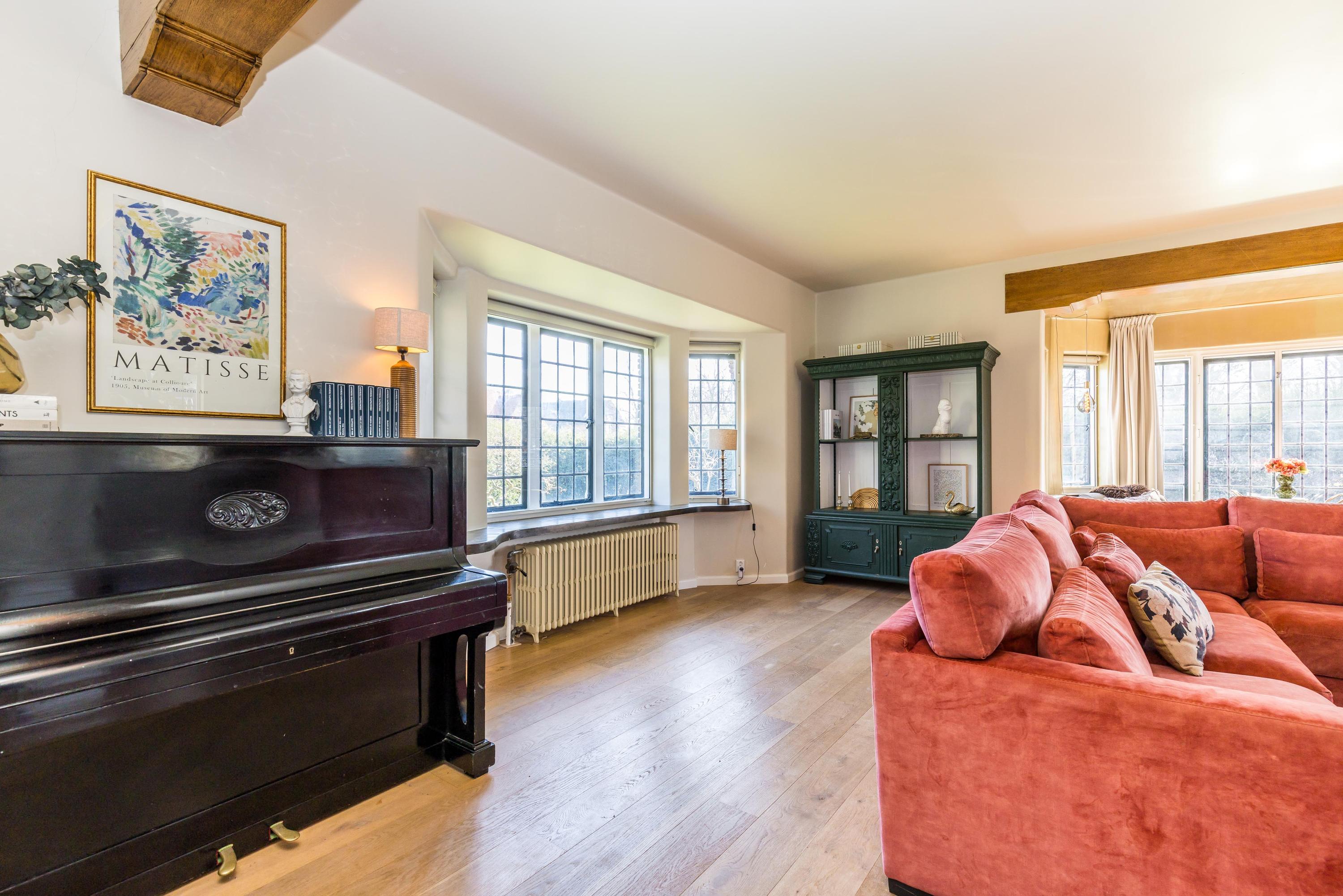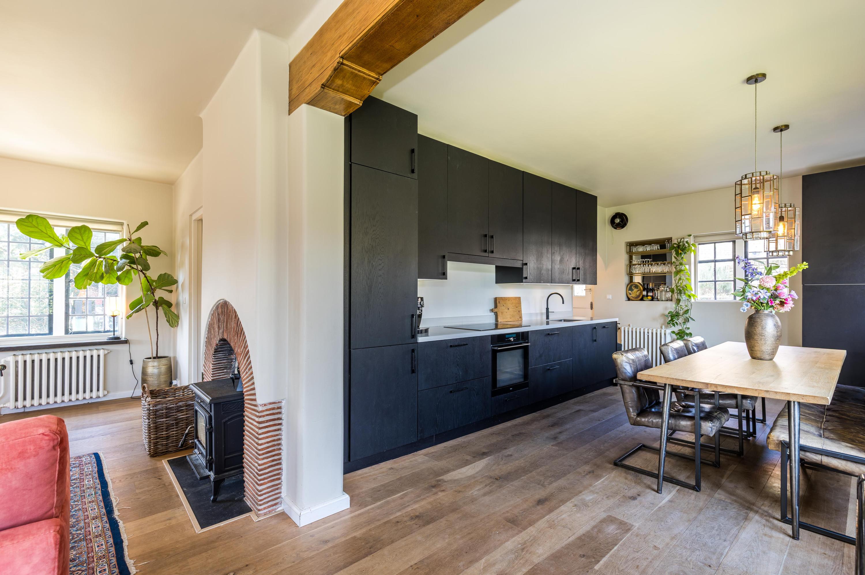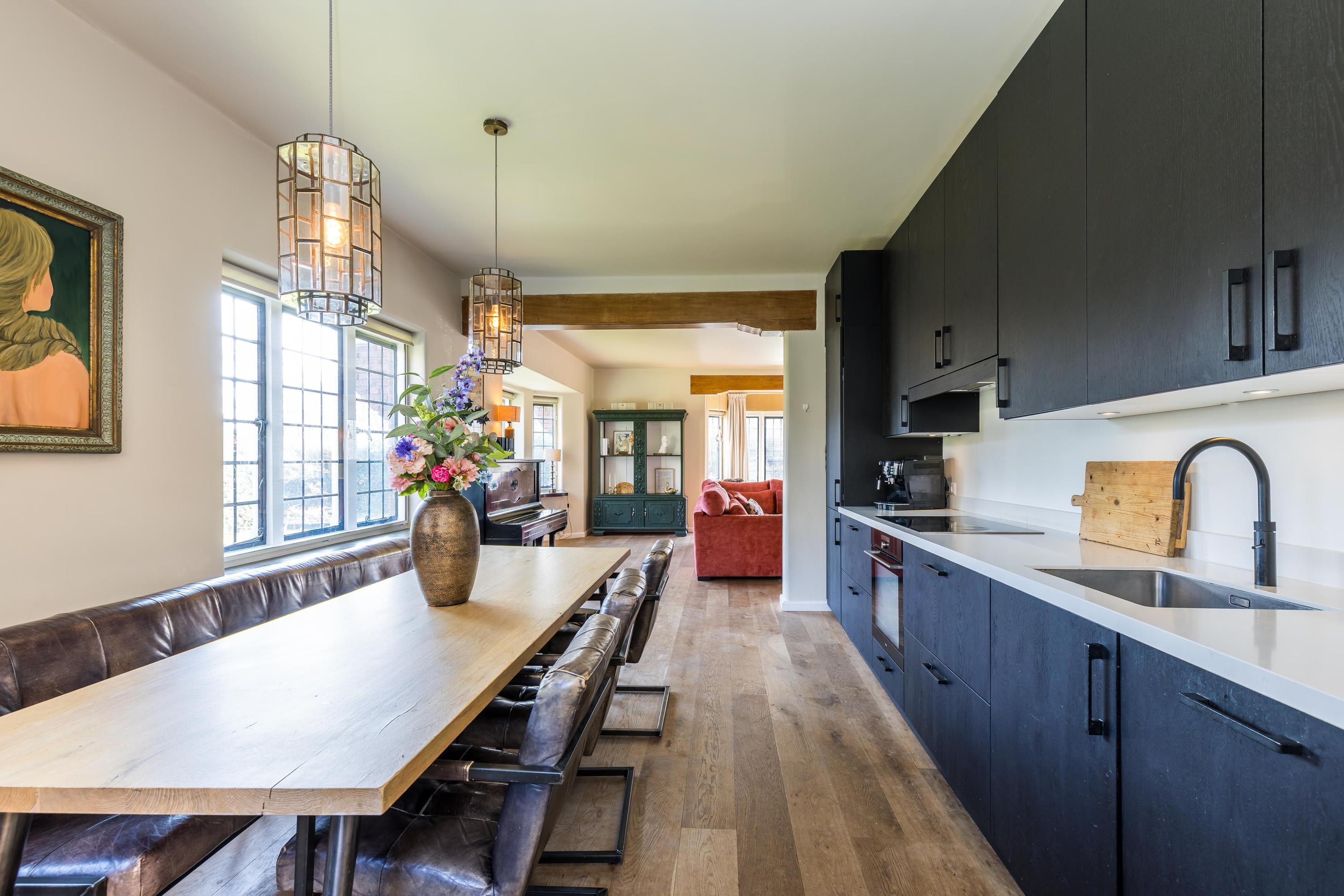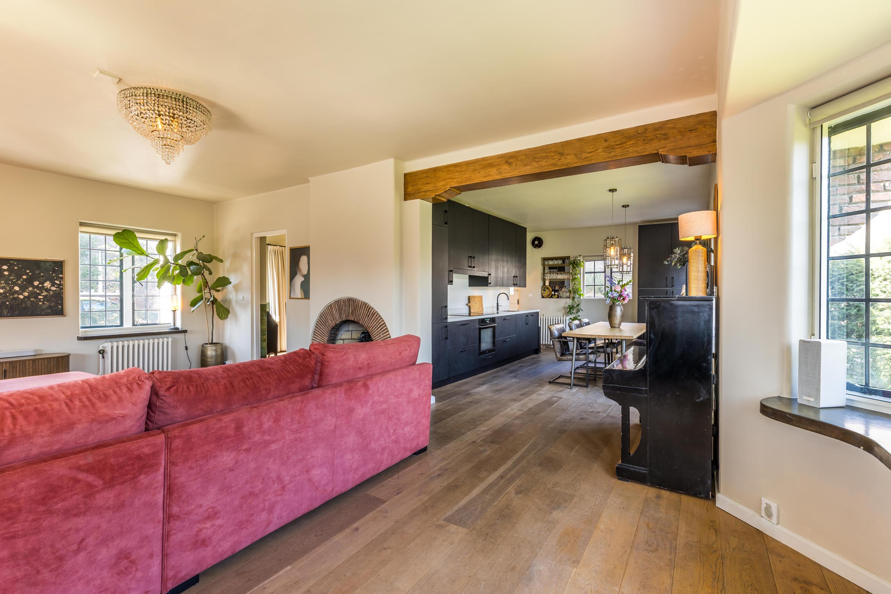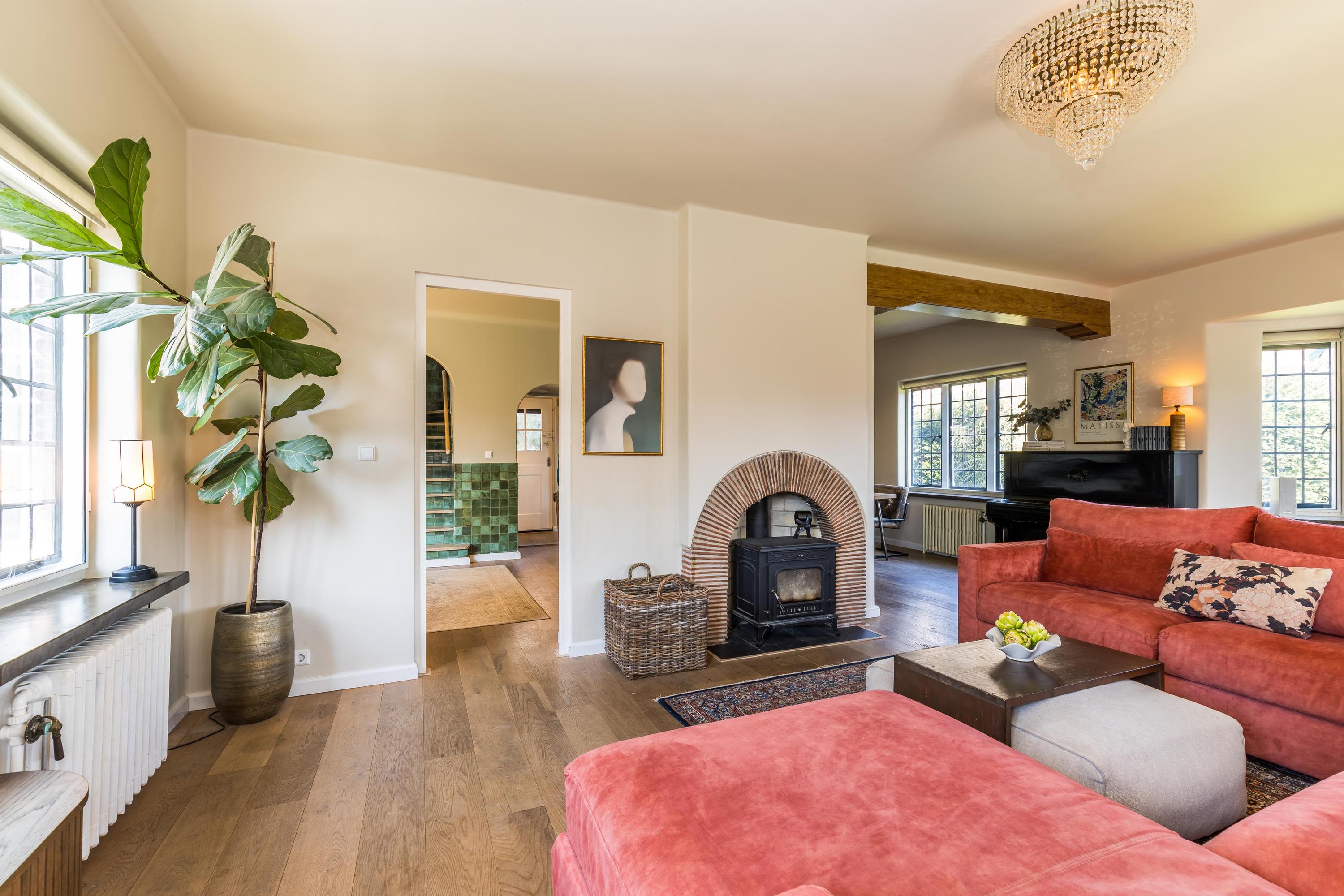 Ground floor: entrance through a semi-circular front door, very spacious hall where you could roller skate, so to speak, but will certainly do a little dance out of happiness. The charming living room with wood stove, characteristic bay window and daylight from 3 sides with beautiful stained glass windows, the open kitchen gives a modern twist. The nice thing about the layout on the ground floor is that you can walk around, through a door in the kitchen you enter the ballroom of a hall via a small hallway. The hall also borders the toilet and a fixed cupboard. The hall and staircase are equipped with authentic wall tiles in astonishingly good condition.