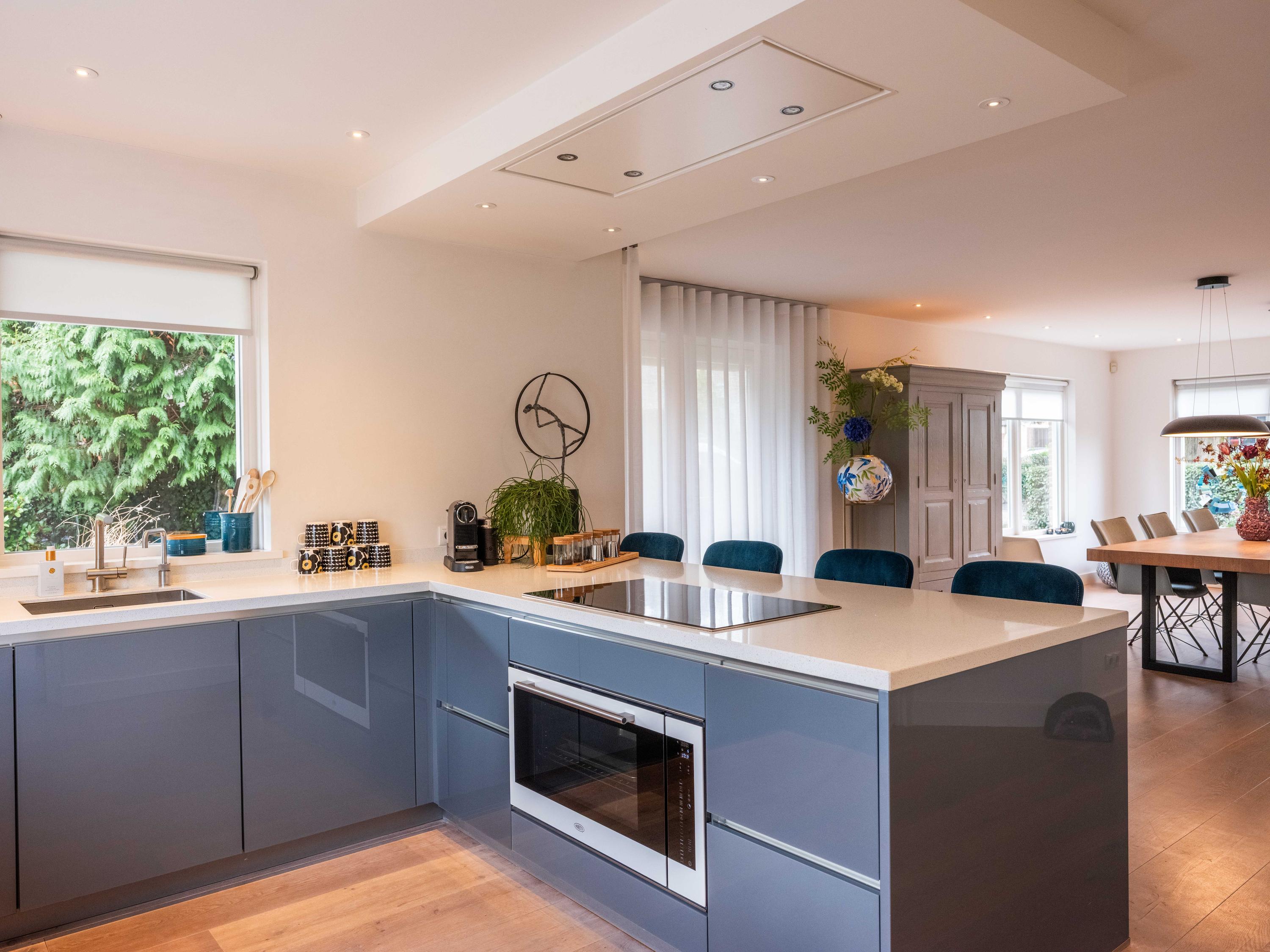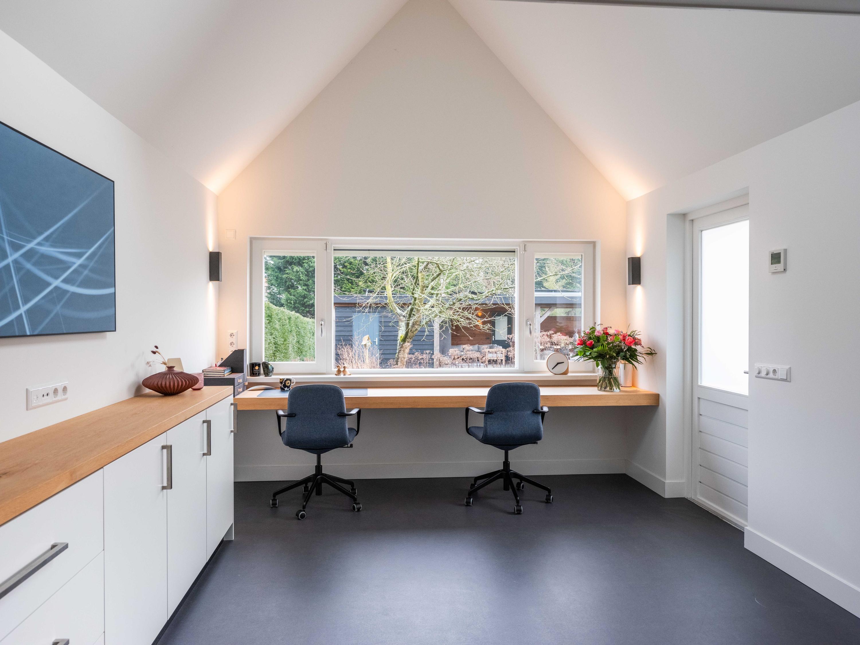 Double doors give access to the spacious L-shaped living room, where you are immediately welcomed by lots of light thanks to the large windows. In the corner is a cosy sitting area with an attractive gas fireplace. The oak laminate flooring in combination with underfloor heating throughout the ground floor creates a warm and comfortable atmosphere.