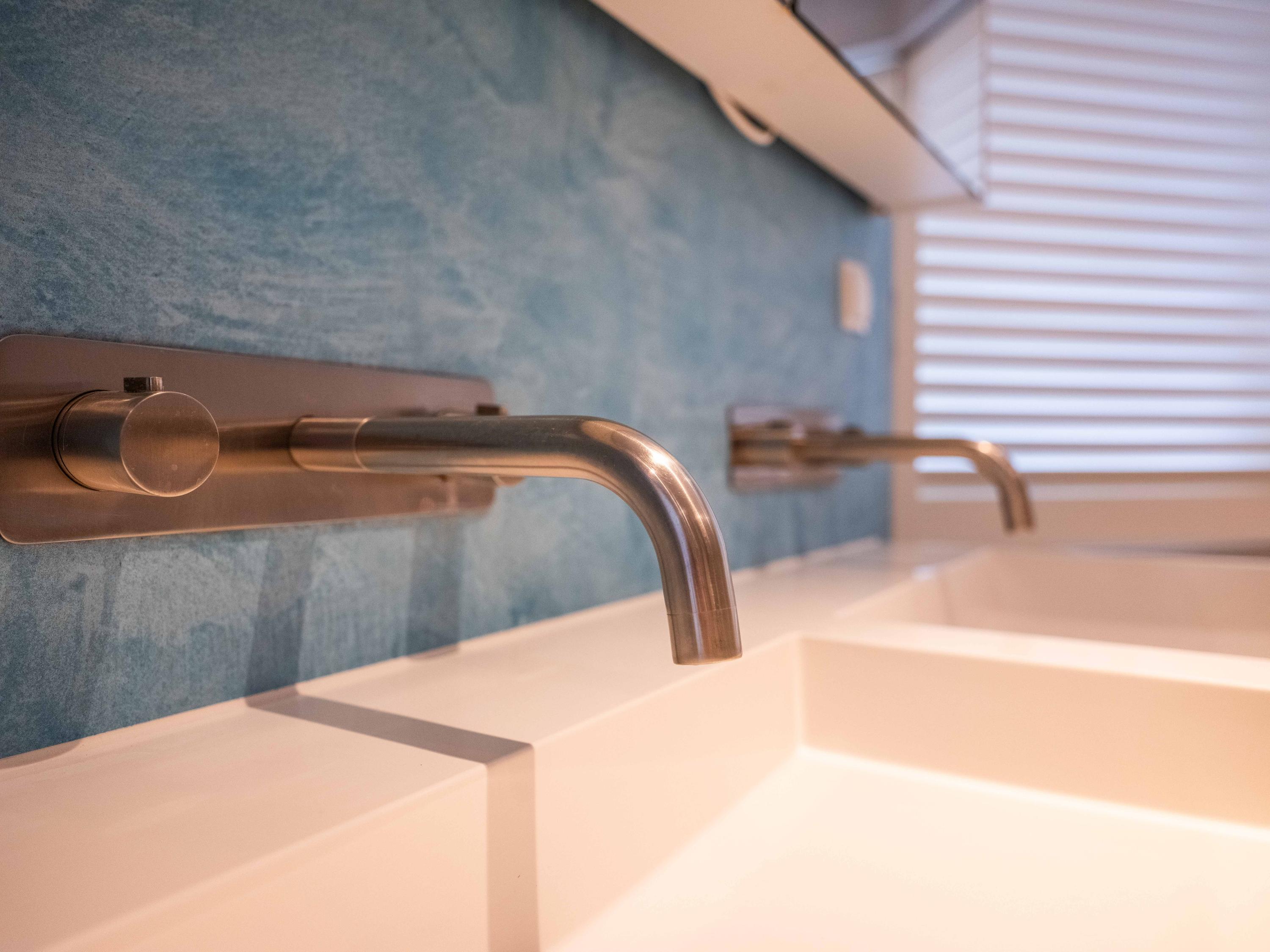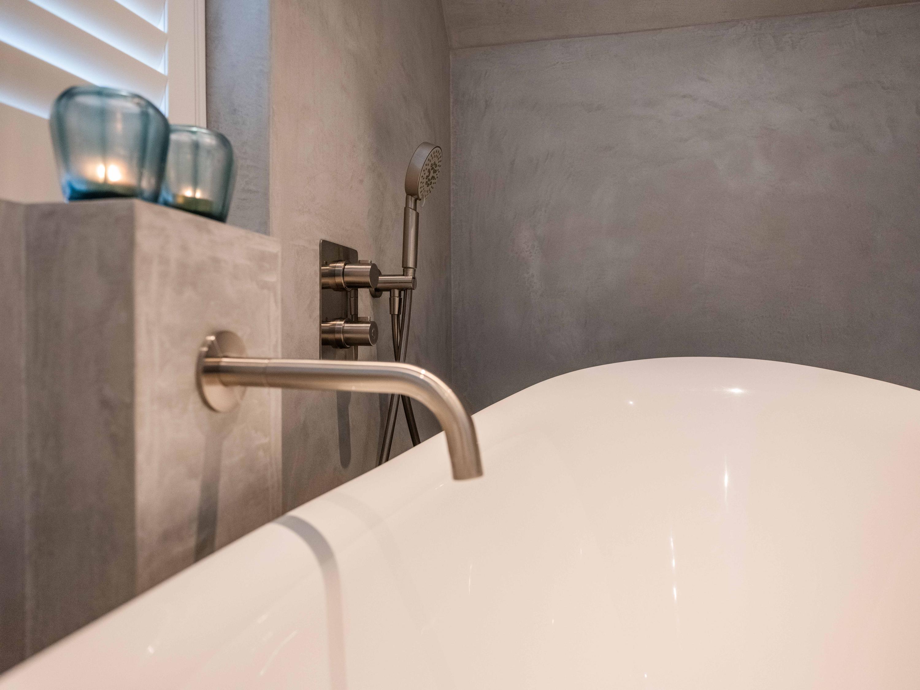 The open kitchen is attractively decorated and equipped with a cosy bar with seating. From the kitchen, you can enjoy a beautiful view of the garden and there is a direct connection to the living room. Thanks to the open layout and abundant light, everything feels spacious, fresh and inviting.