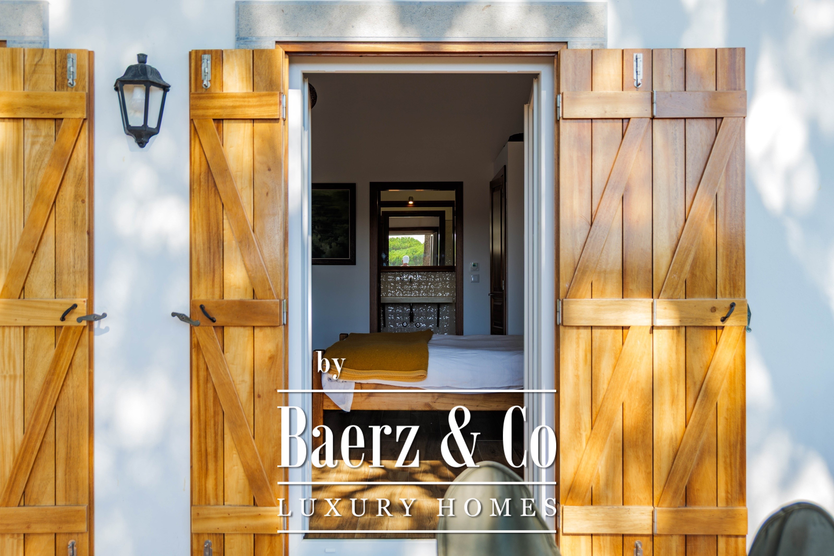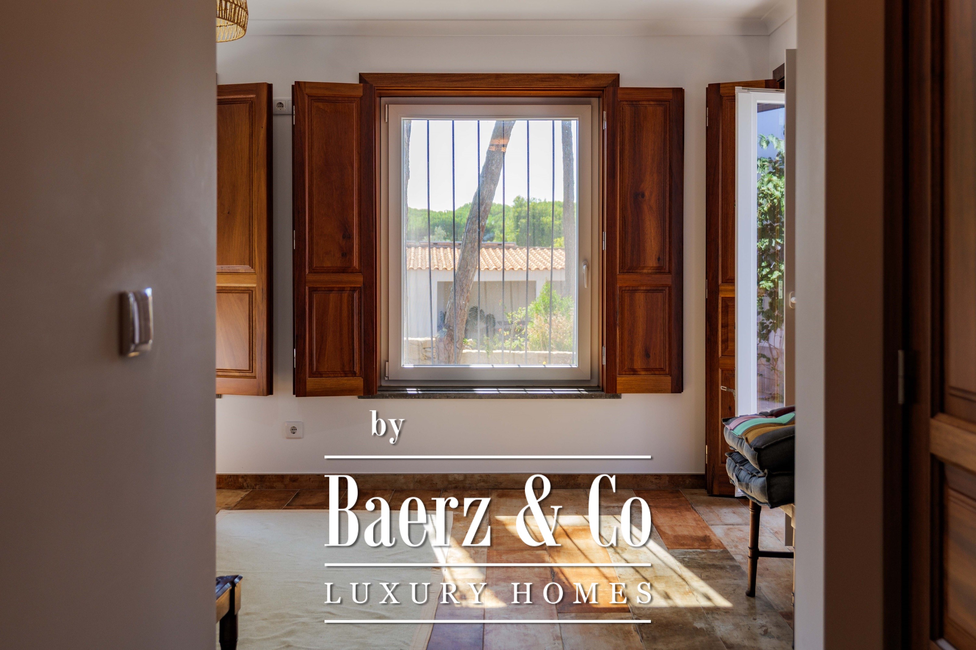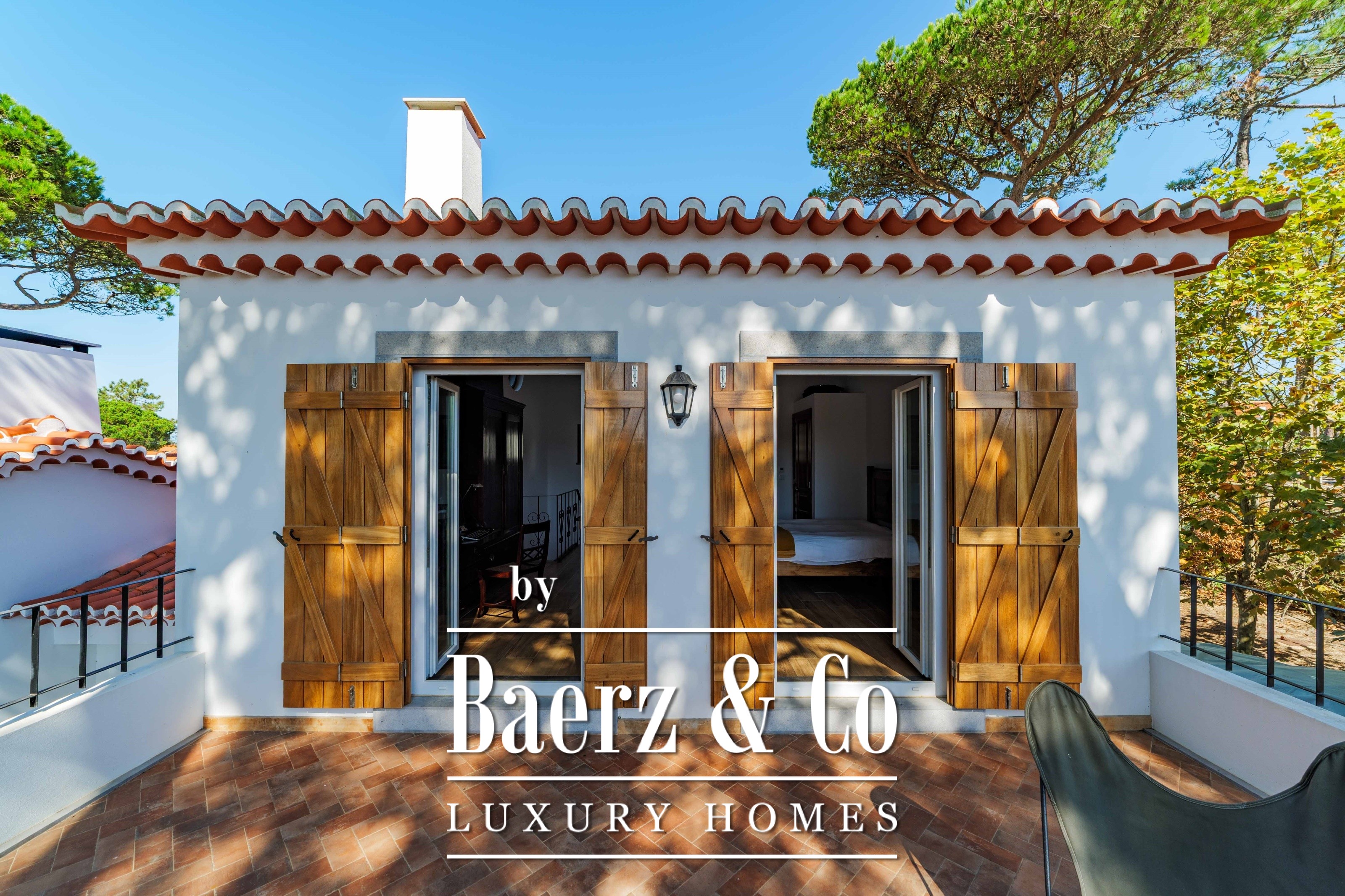 The main residence spans two stories and 302 m², completed in 2023 with a focus on authentic materials: exotic woods, fine stone, traditional clay tile roofing, and handmade wrought iron details. Sunlight from east to west fills harmoniously proportioned rooms—spacious living areas with a fireplace, a fully equipped kitchen opening onto the gardens, private suites, and terraces oriented toward serene views of the Sintra hills and the Atlantic.