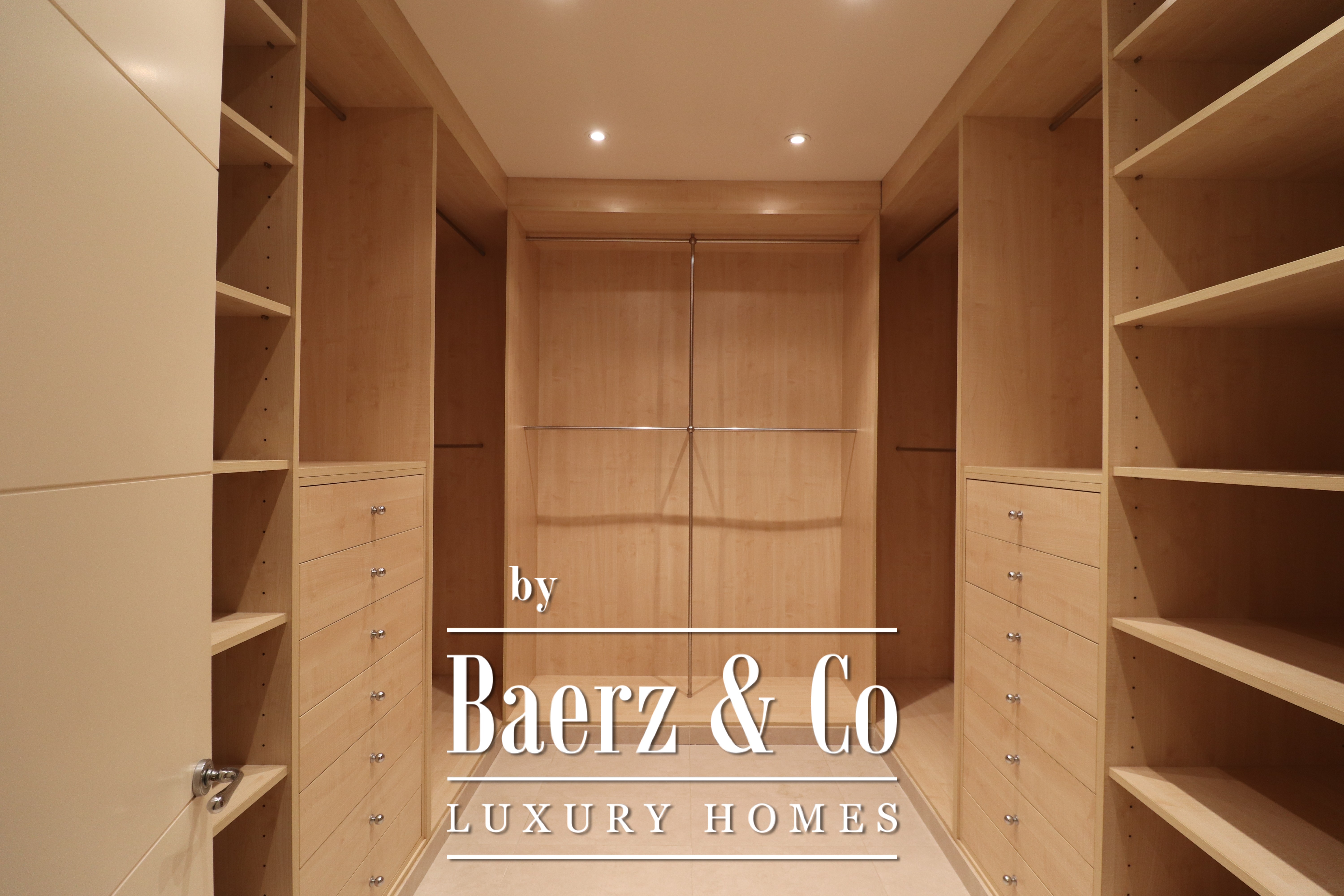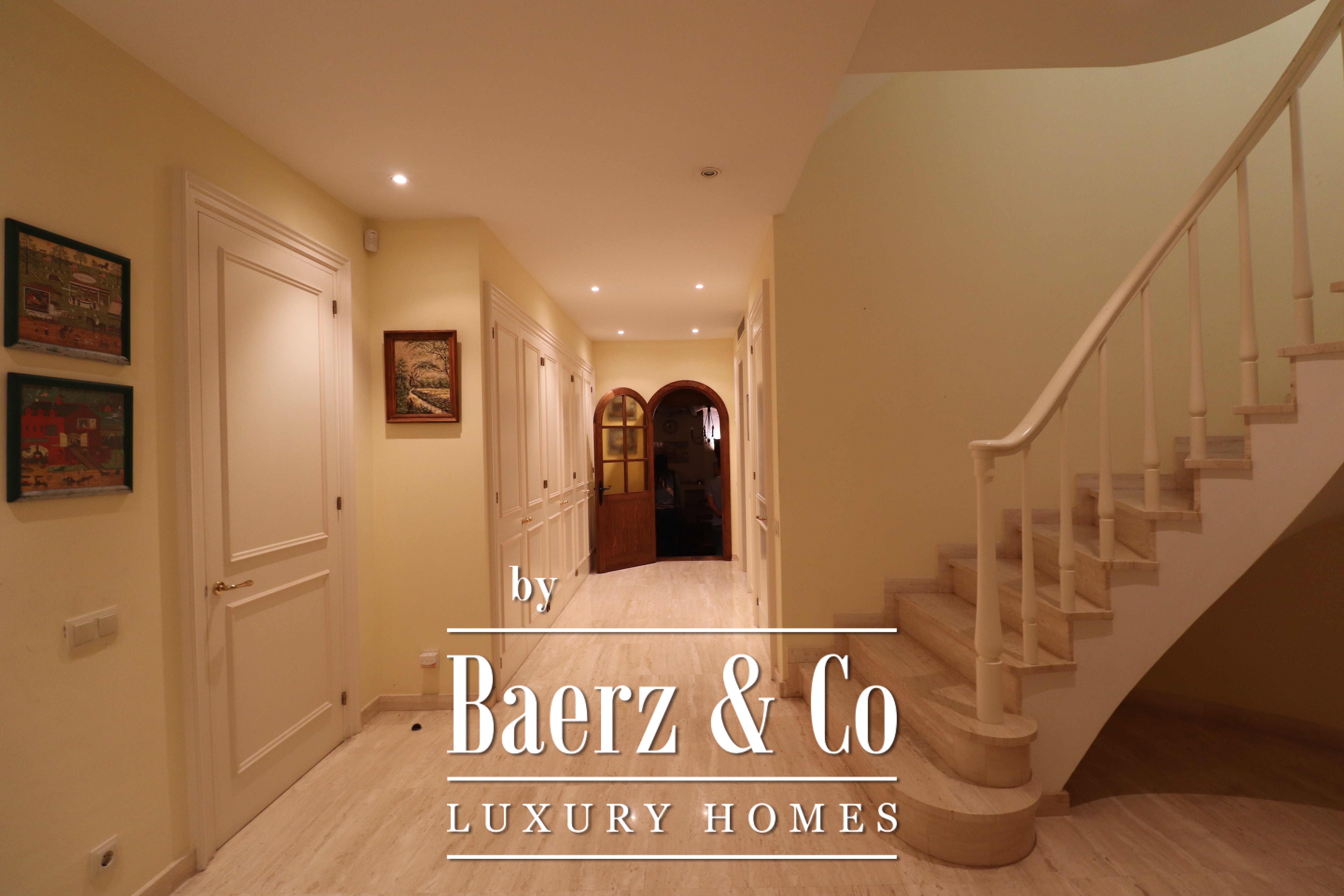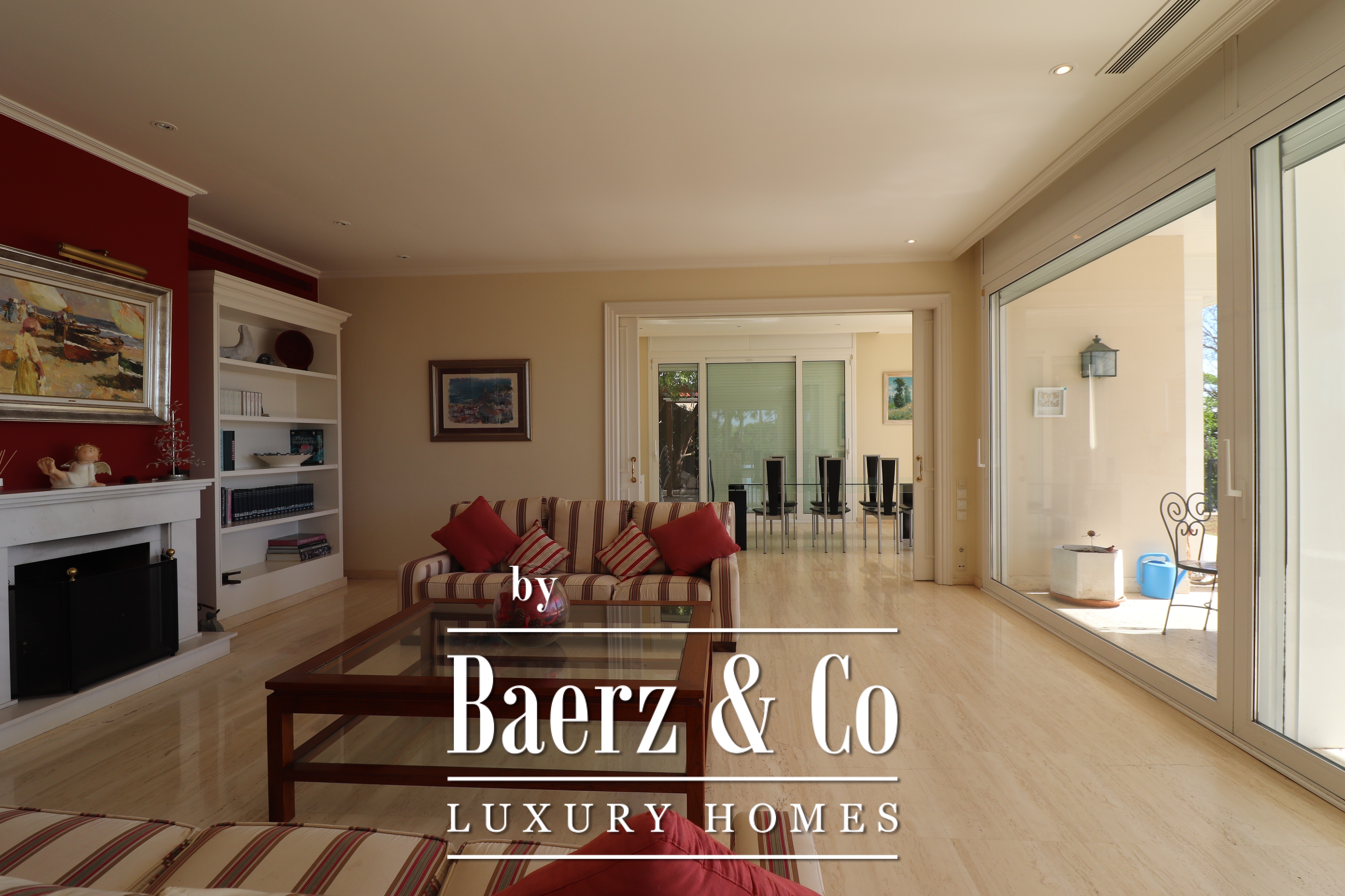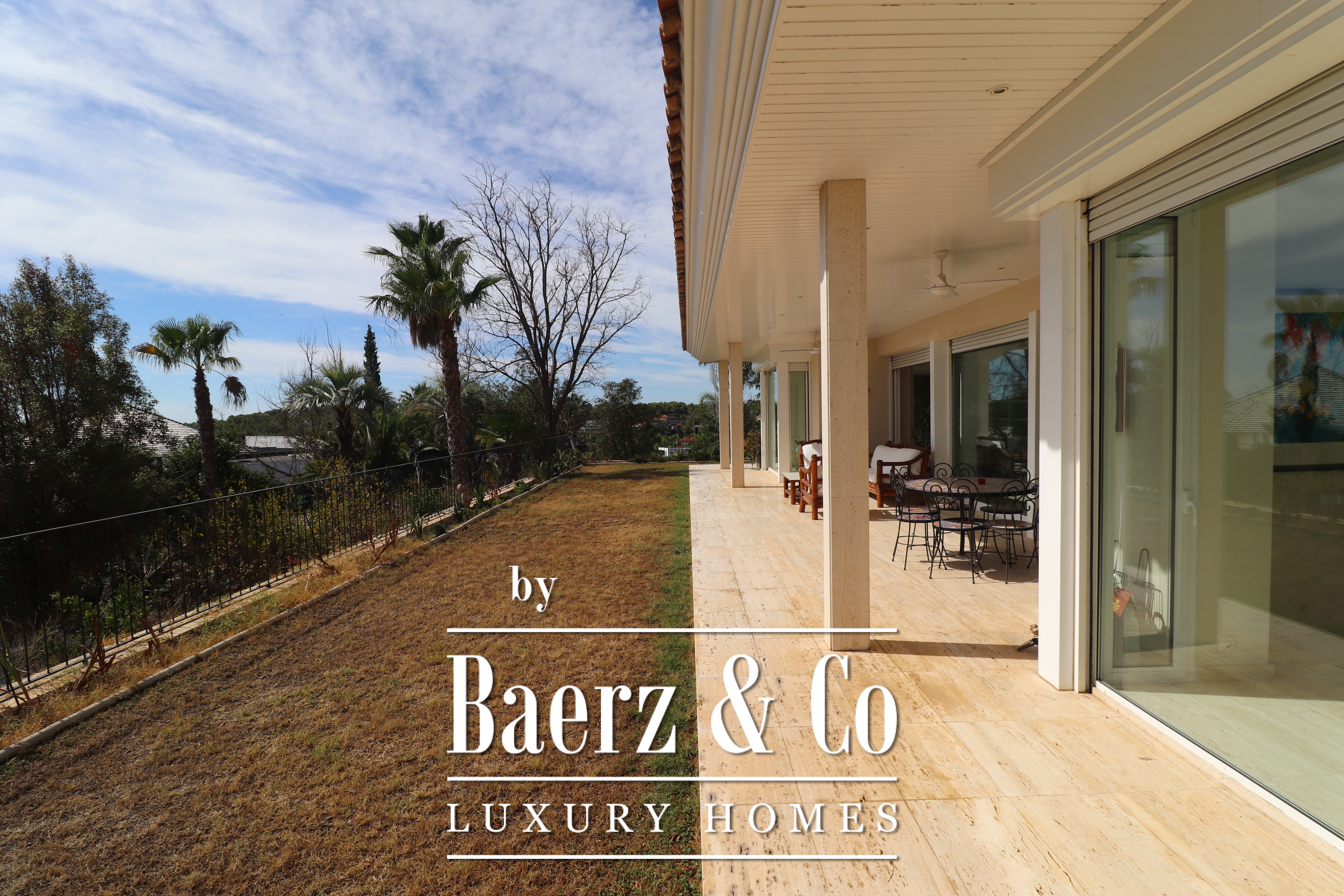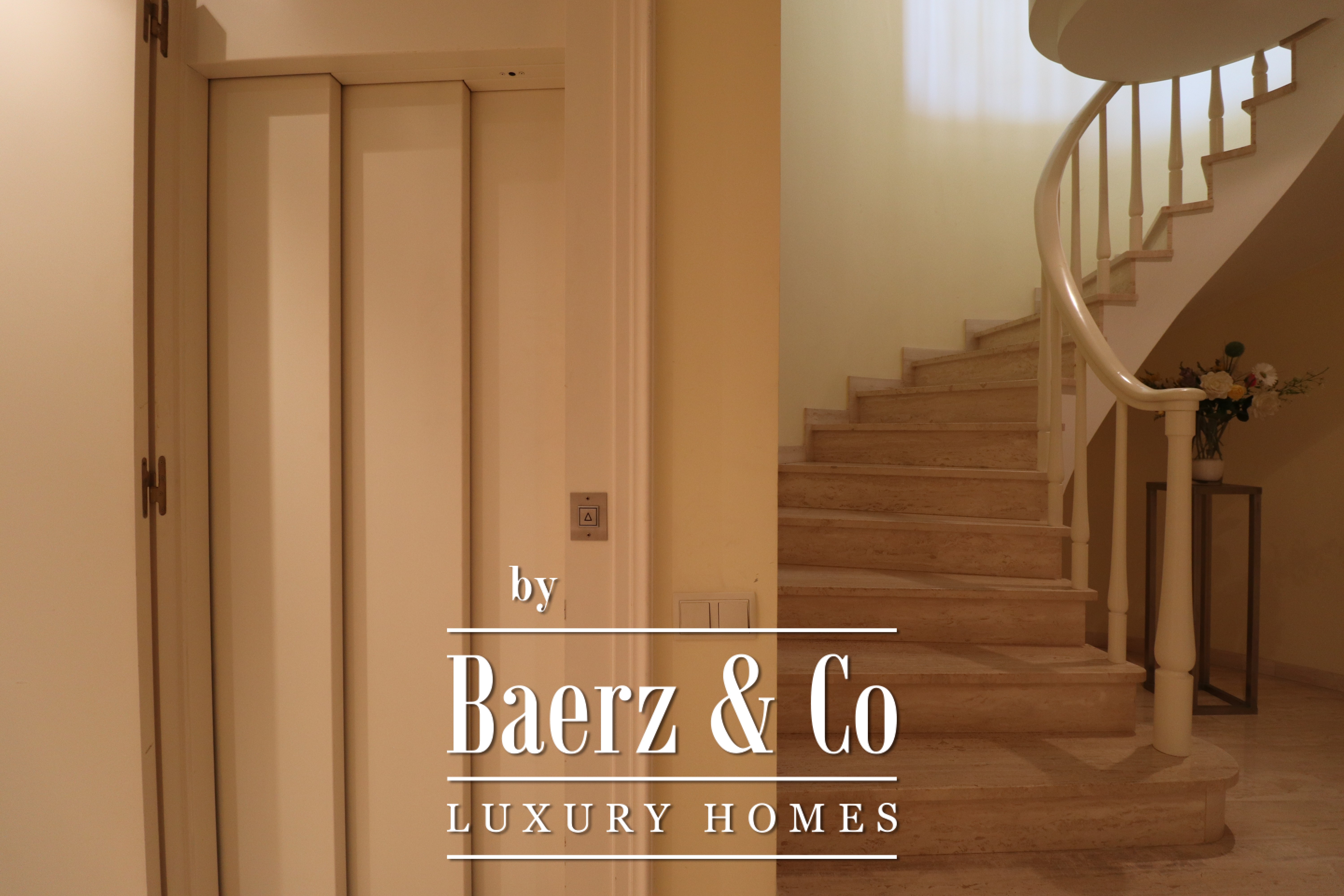 Designed for discretion and comfort, the villa unfolds across three levels, connected by a private lift. The main level opens with a refined entrance hall leading to a fluid living space, including living and dining rooms, a media zone, and a fully equipped kitchen with an adjoining service area and dedicated office. Five bedrooms and eight bathrooms allow for both family intimacy and entertaining on a generous scale.