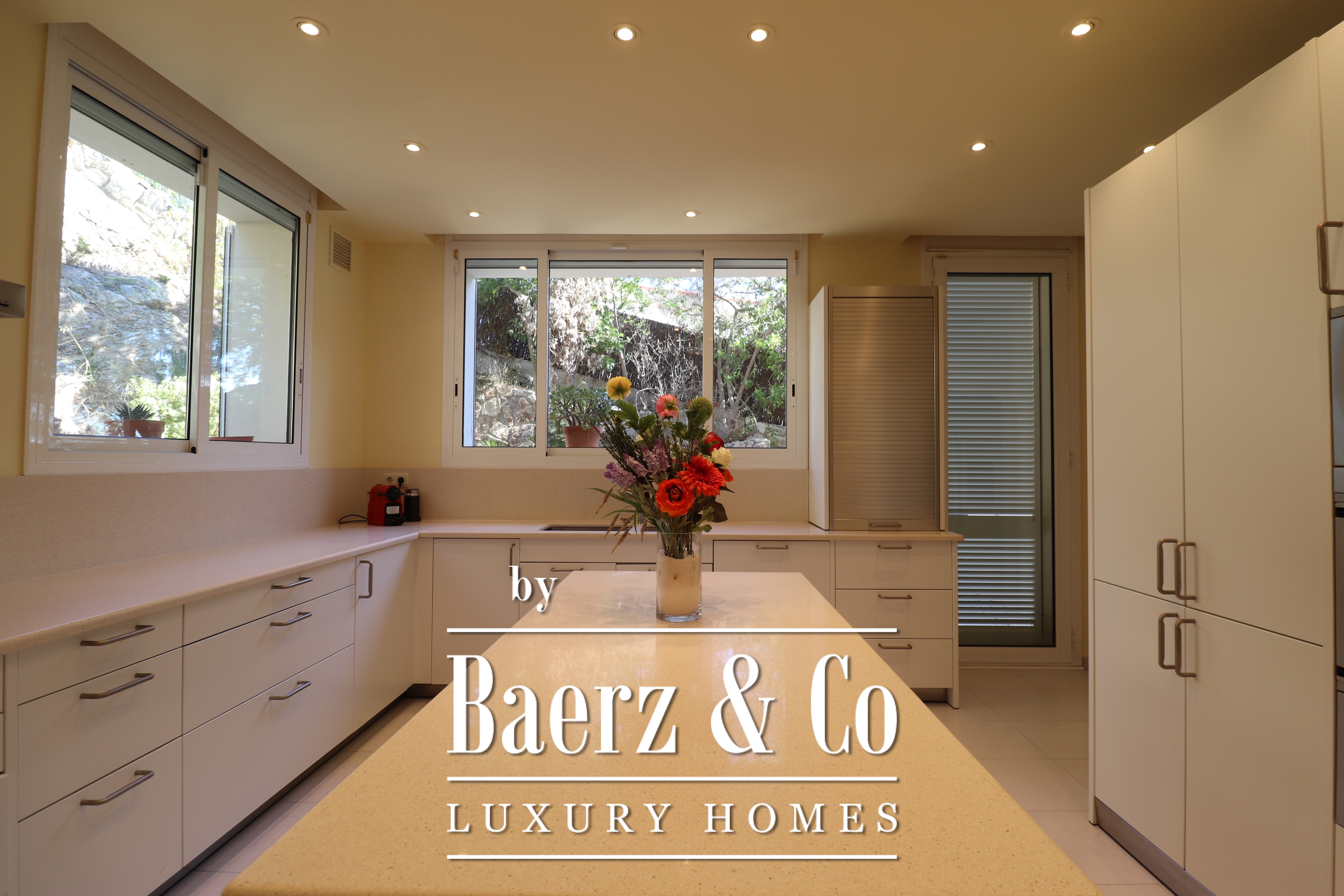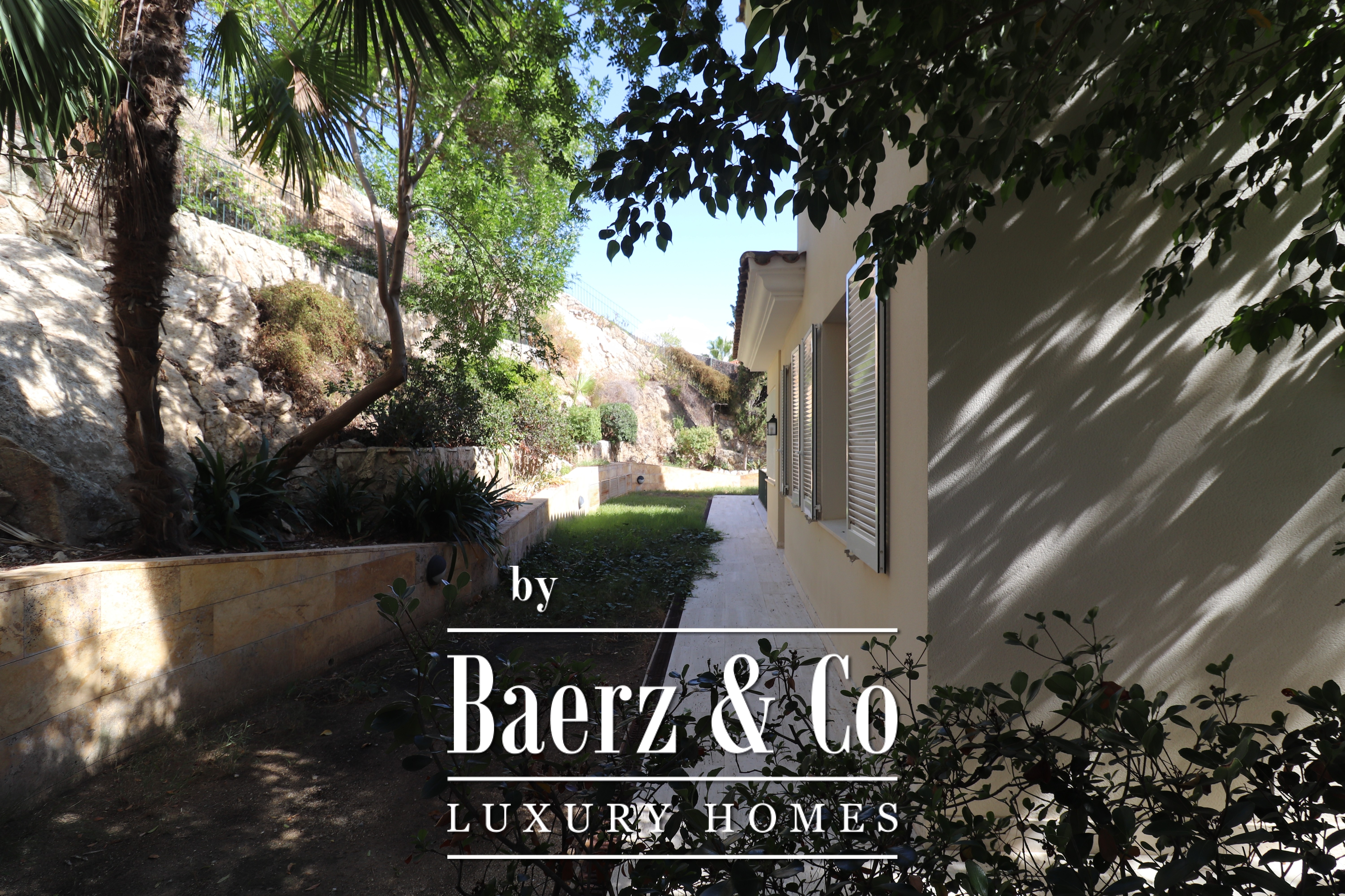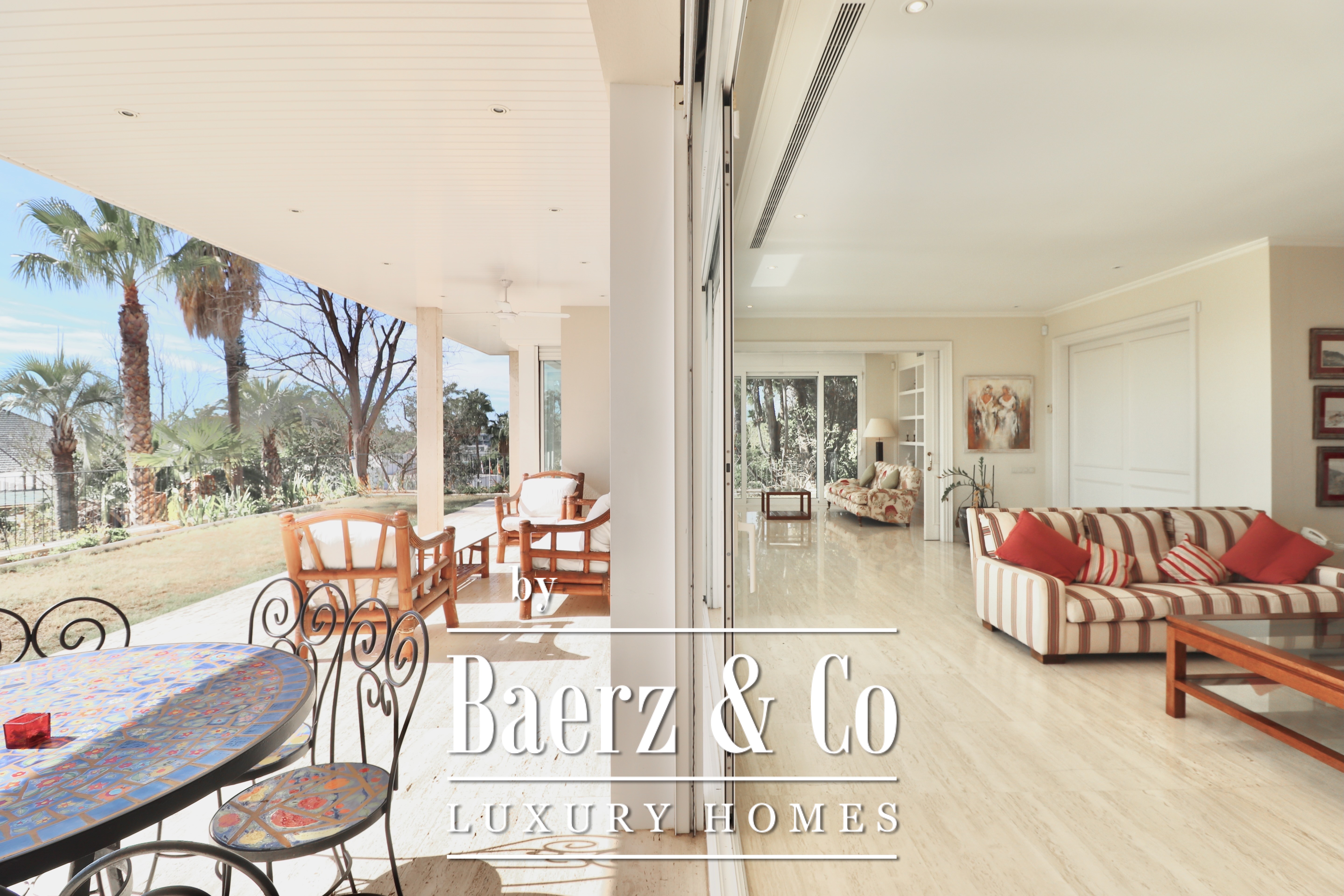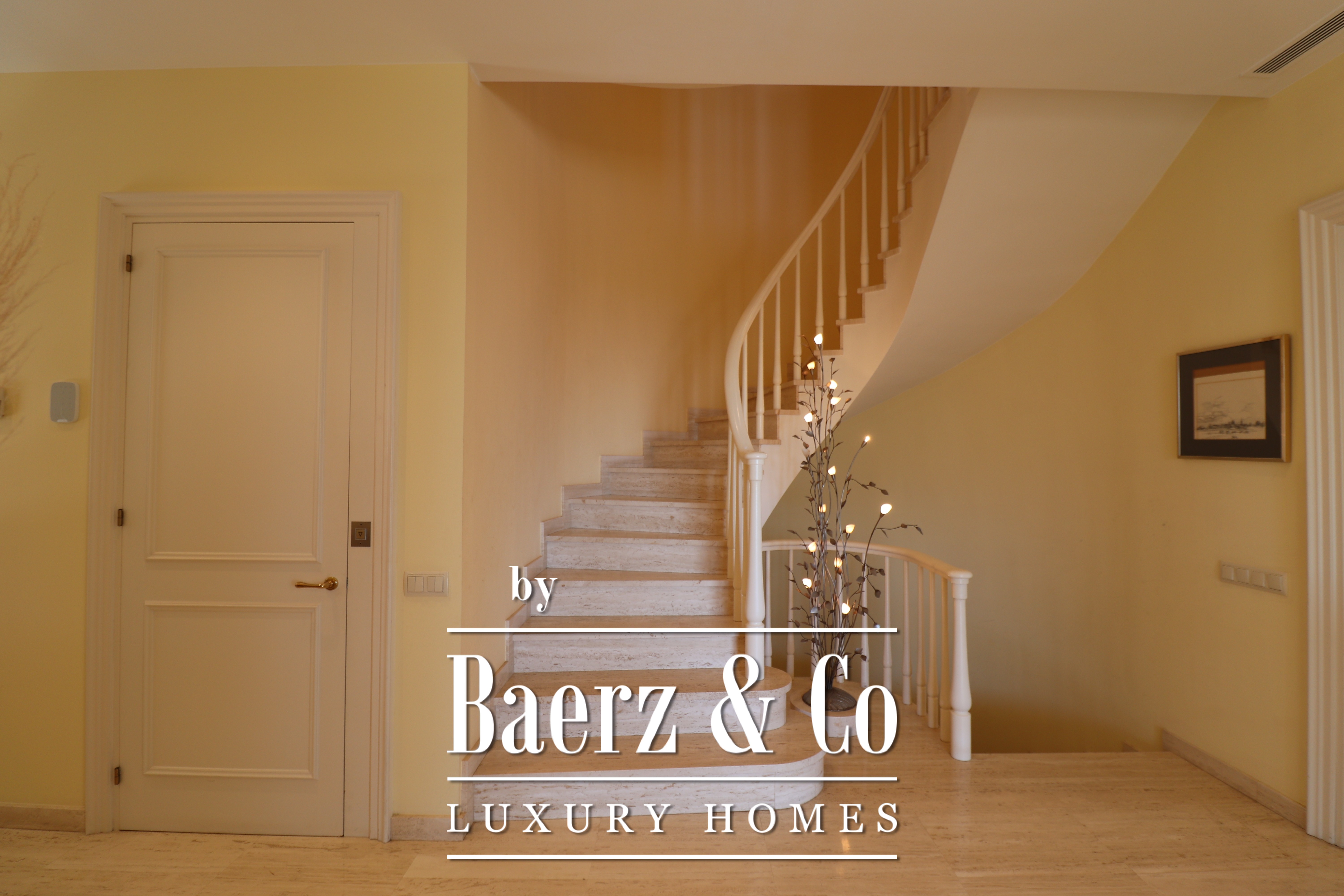 Designed for discretion and comfort, the villa unfolds across three levels, connected by a private lift. The main level opens with a refined entrance hall leading to a fluid living space, including living and dining rooms, a media zone, and a fully equipped kitchen with an adjoining service area and dedicated office. Five bedrooms and eight bathrooms allow for both family intimacy and entertaining on a generous scale.