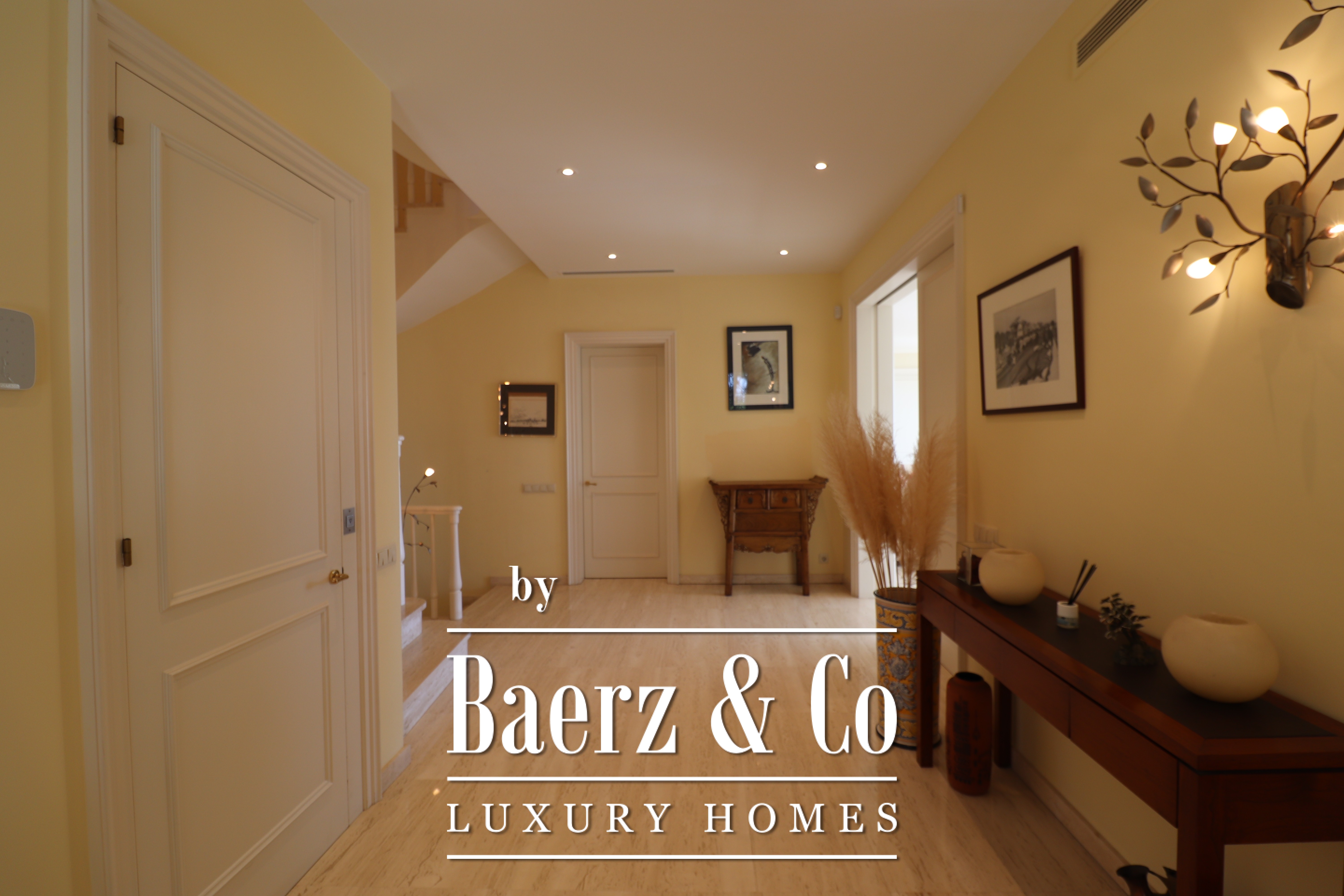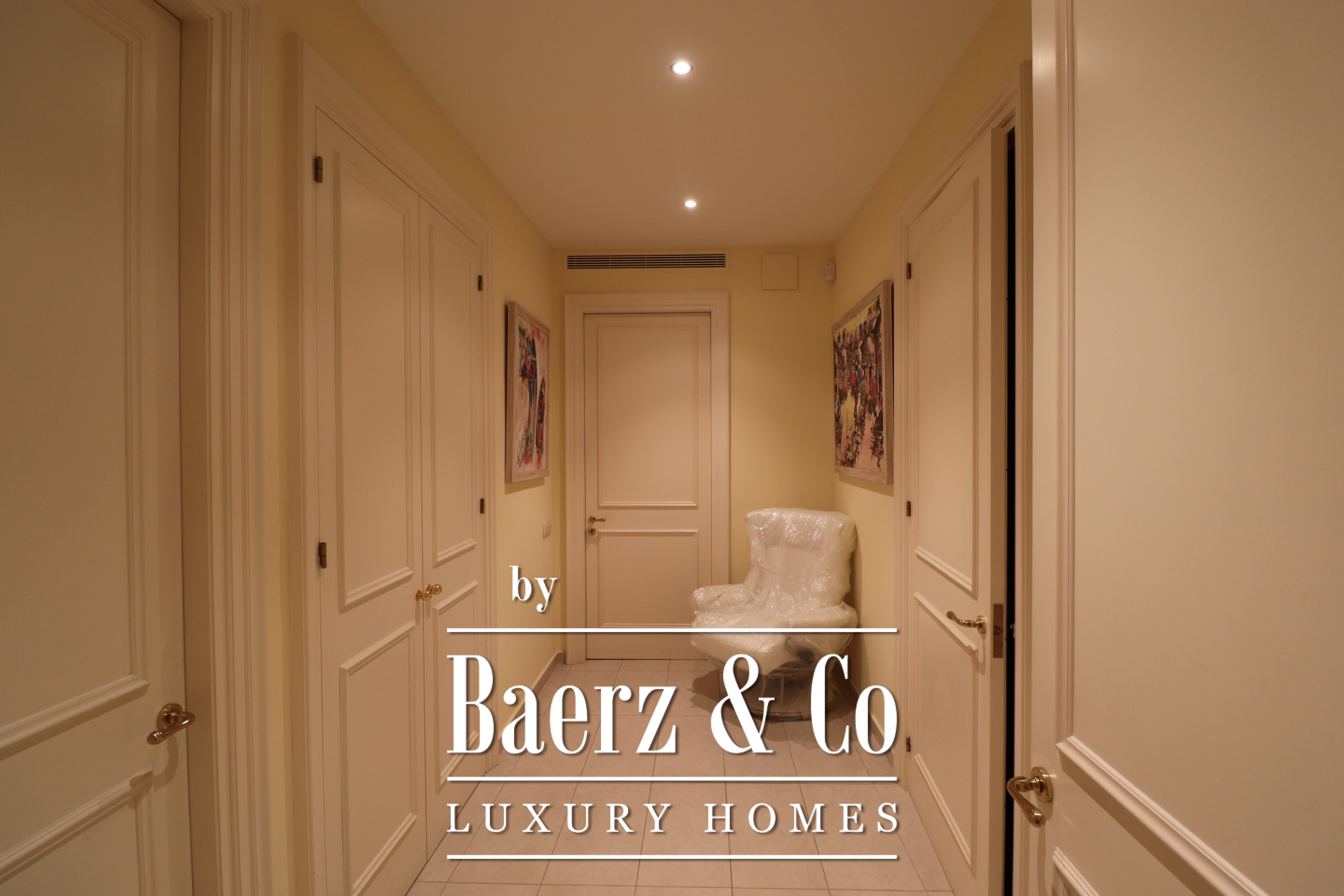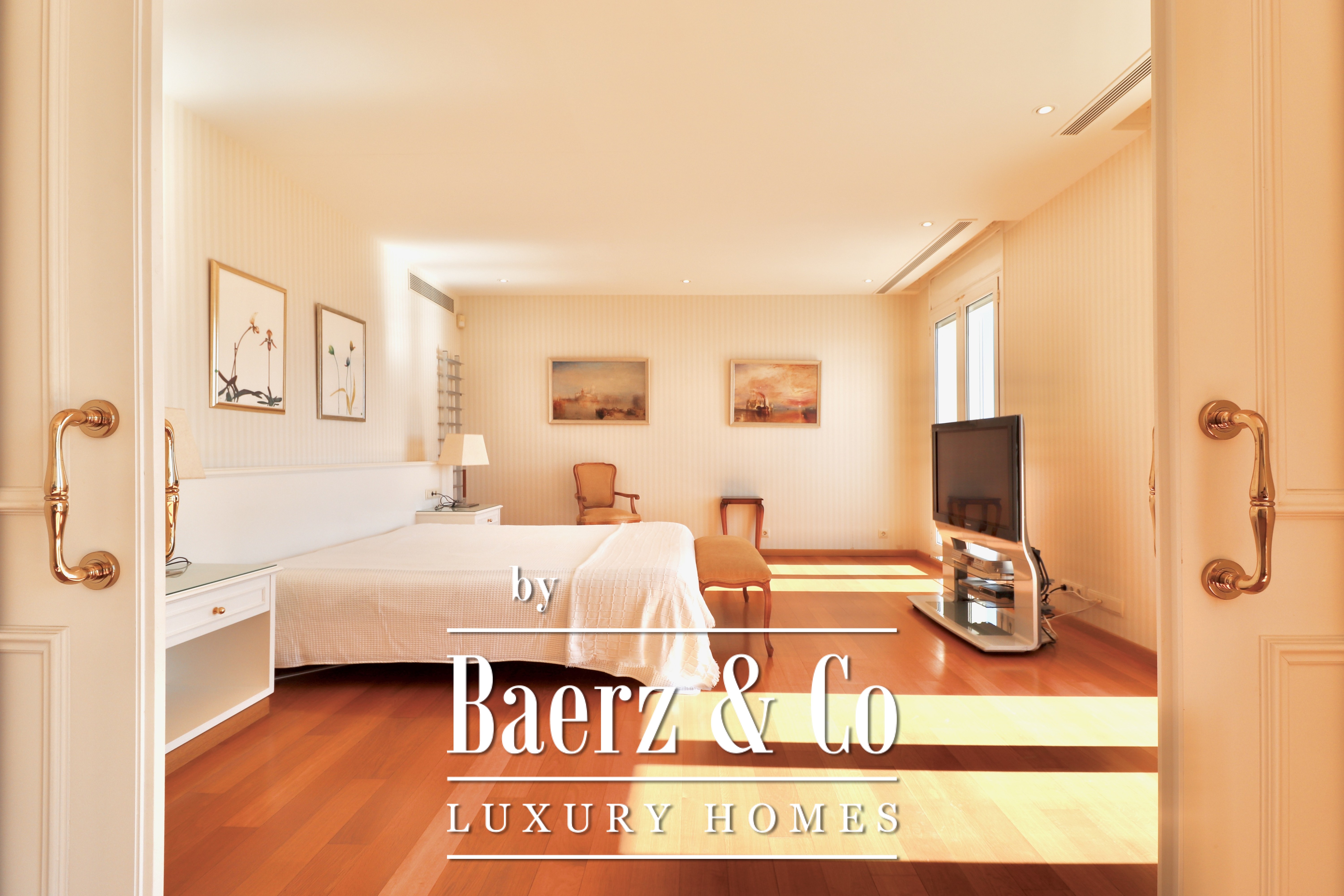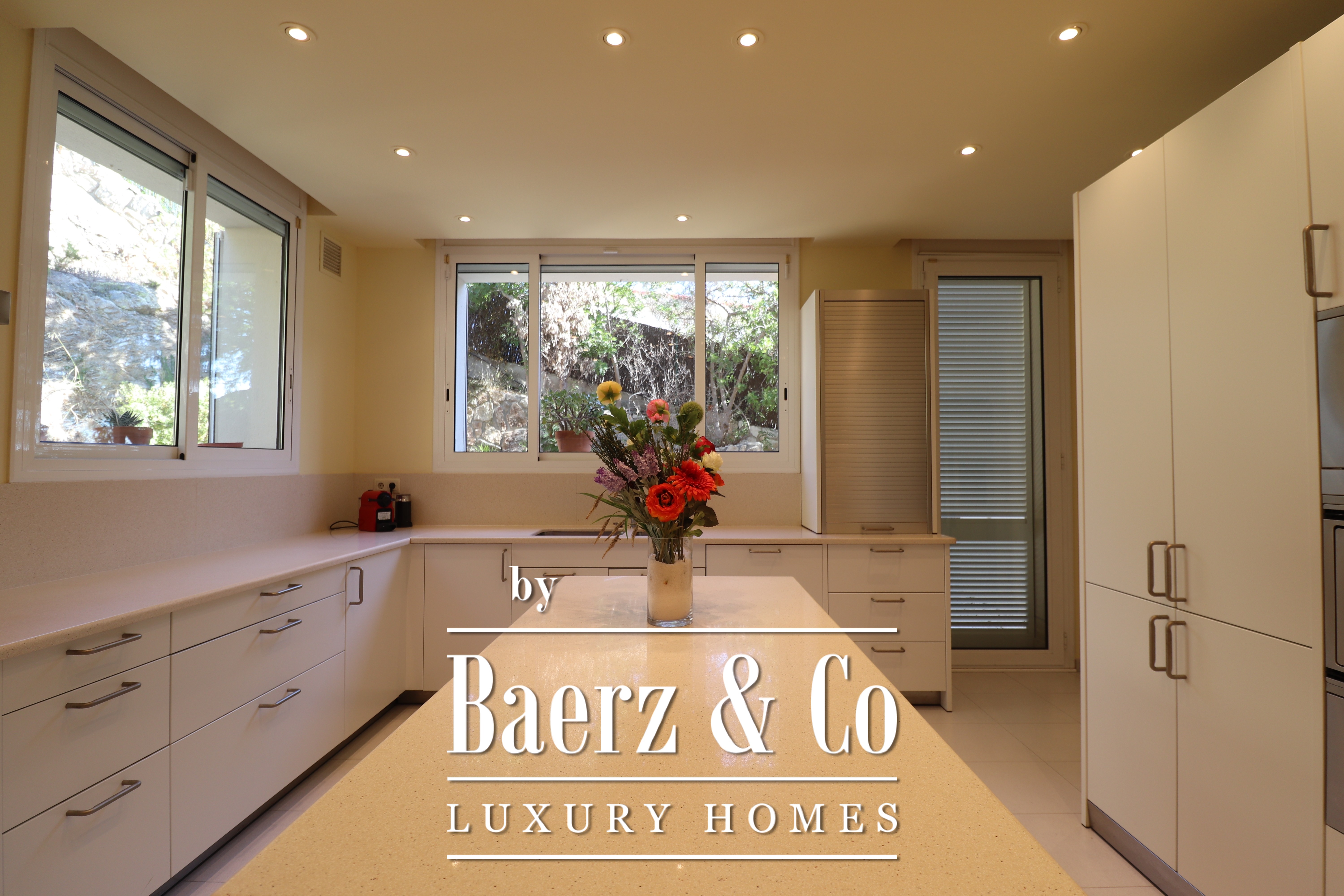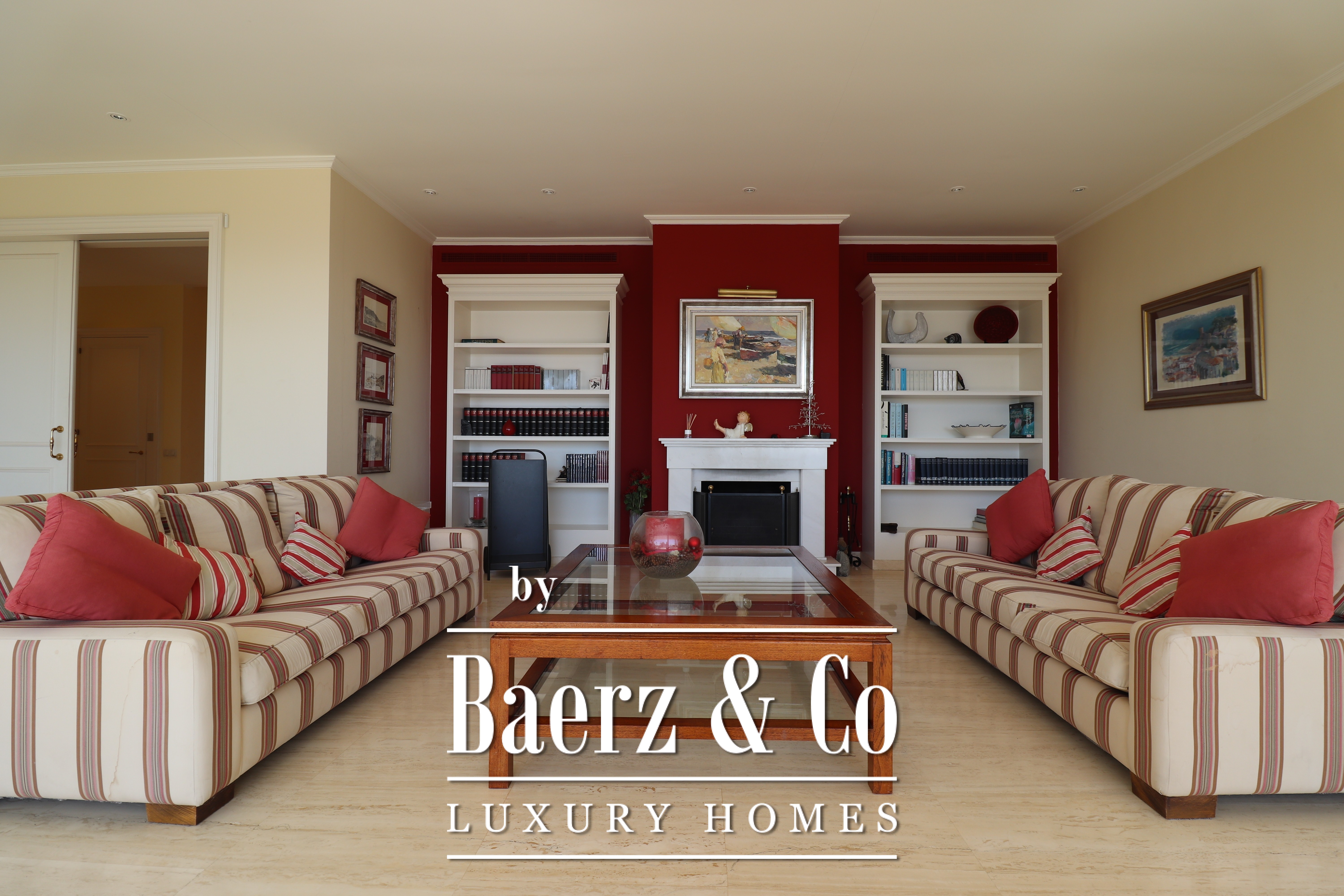 Designed for discretion and comfort, the villa unfolds across three levels, connected by a private lift. The main level opens with a refined entrance hall leading to a fluid living space, including living and dining rooms, a media zone, and a fully equipped kitchen with an adjoining service area and dedicated office. Five bedrooms and eight bathrooms allow for both family intimacy and entertaining on a generous scale.