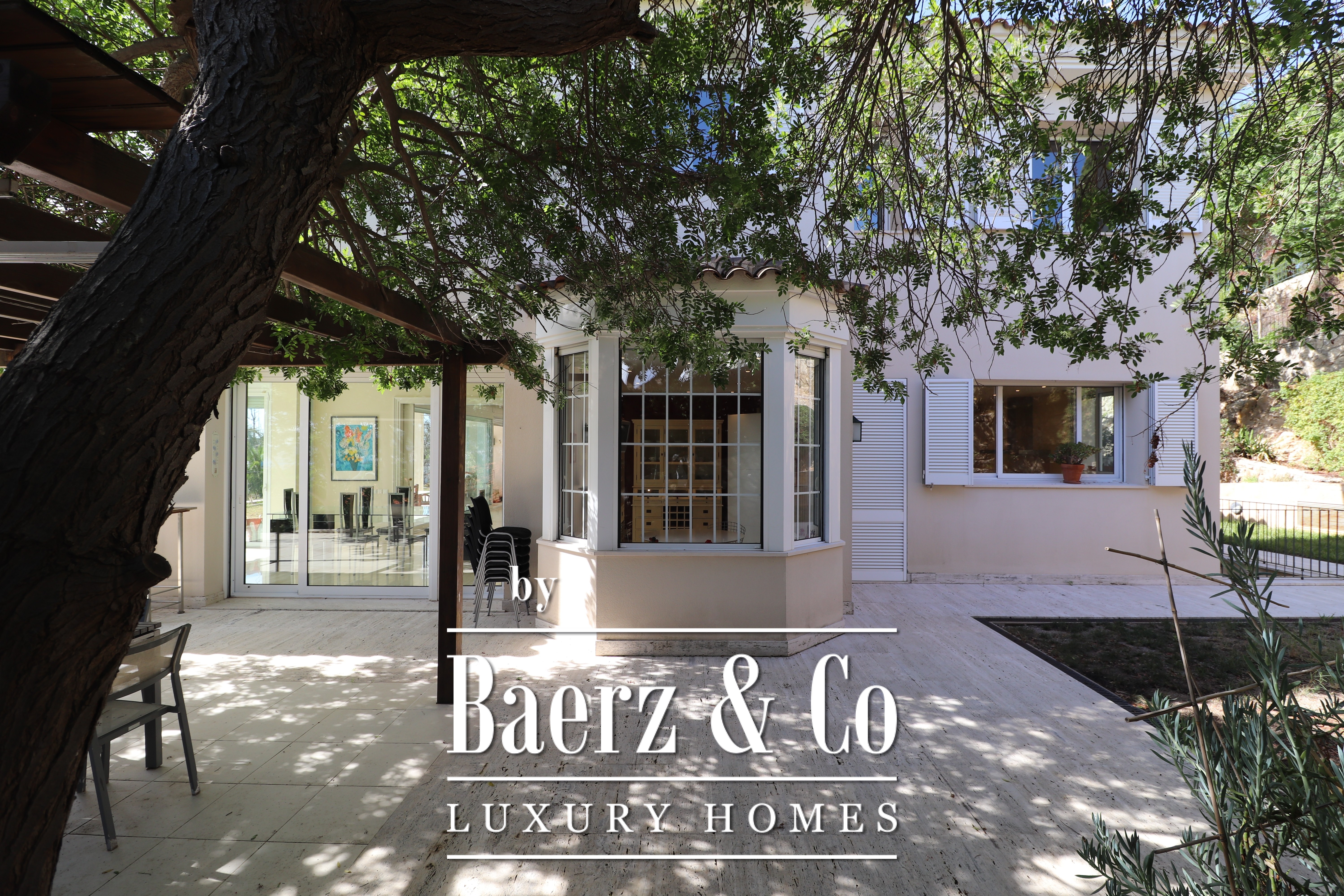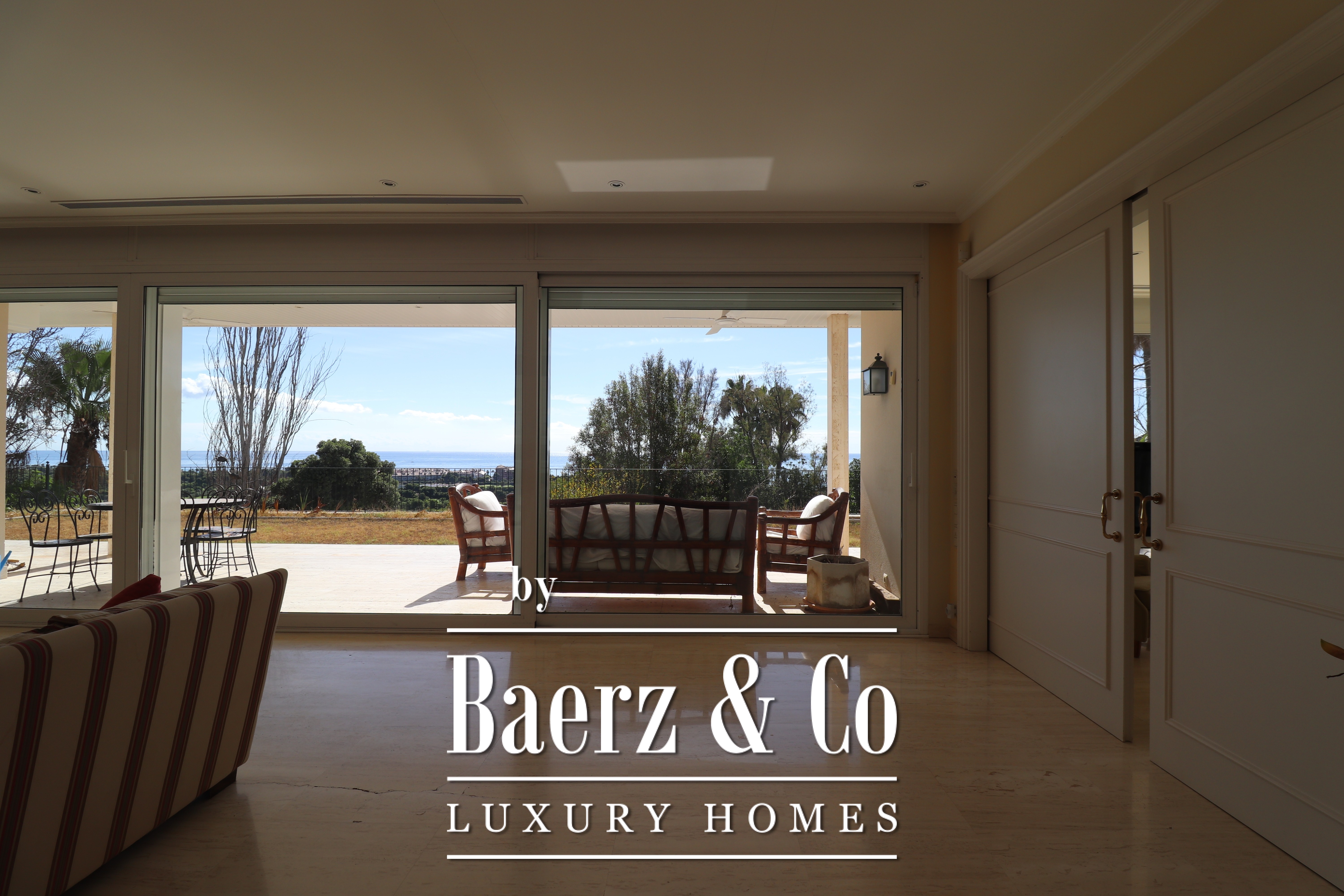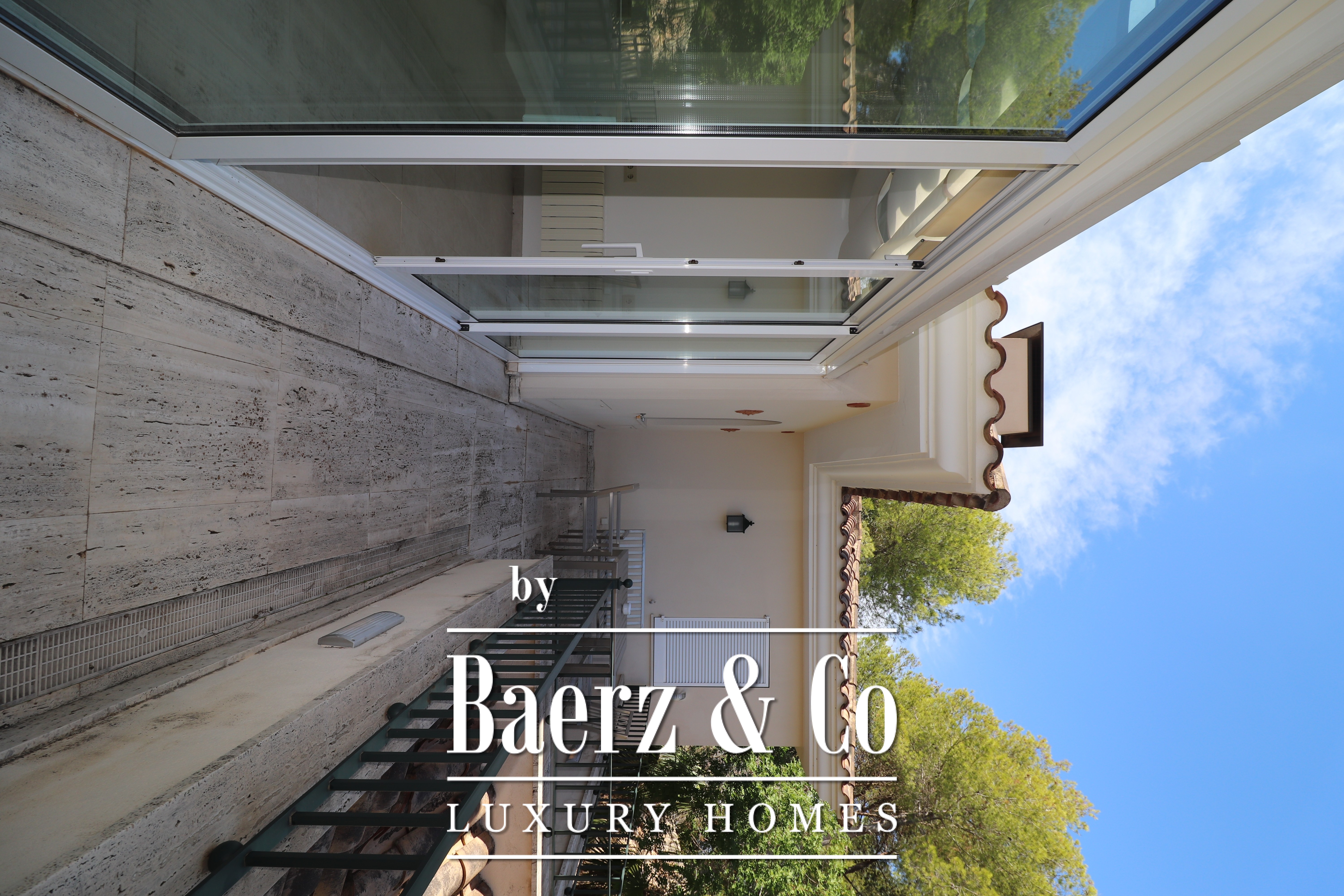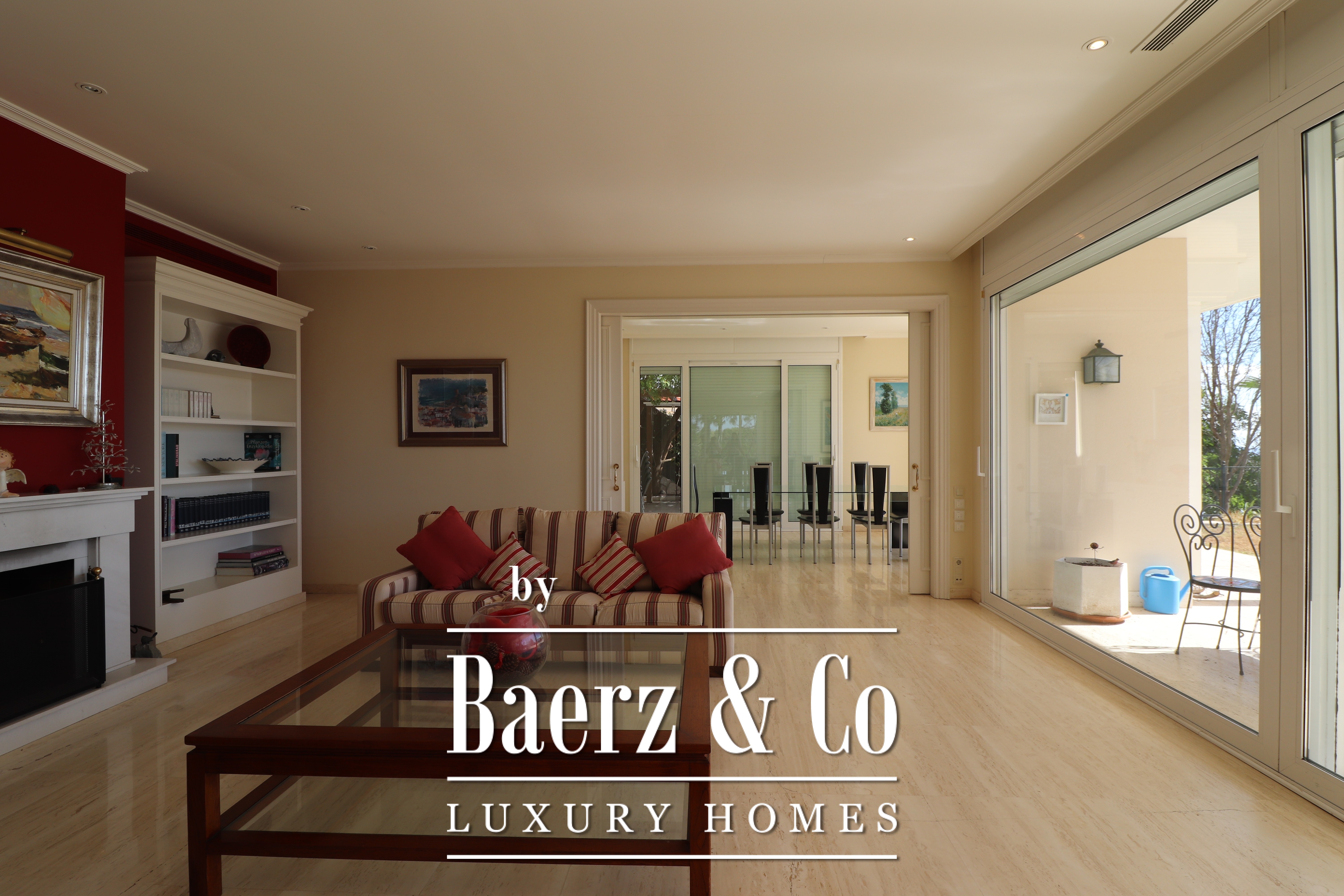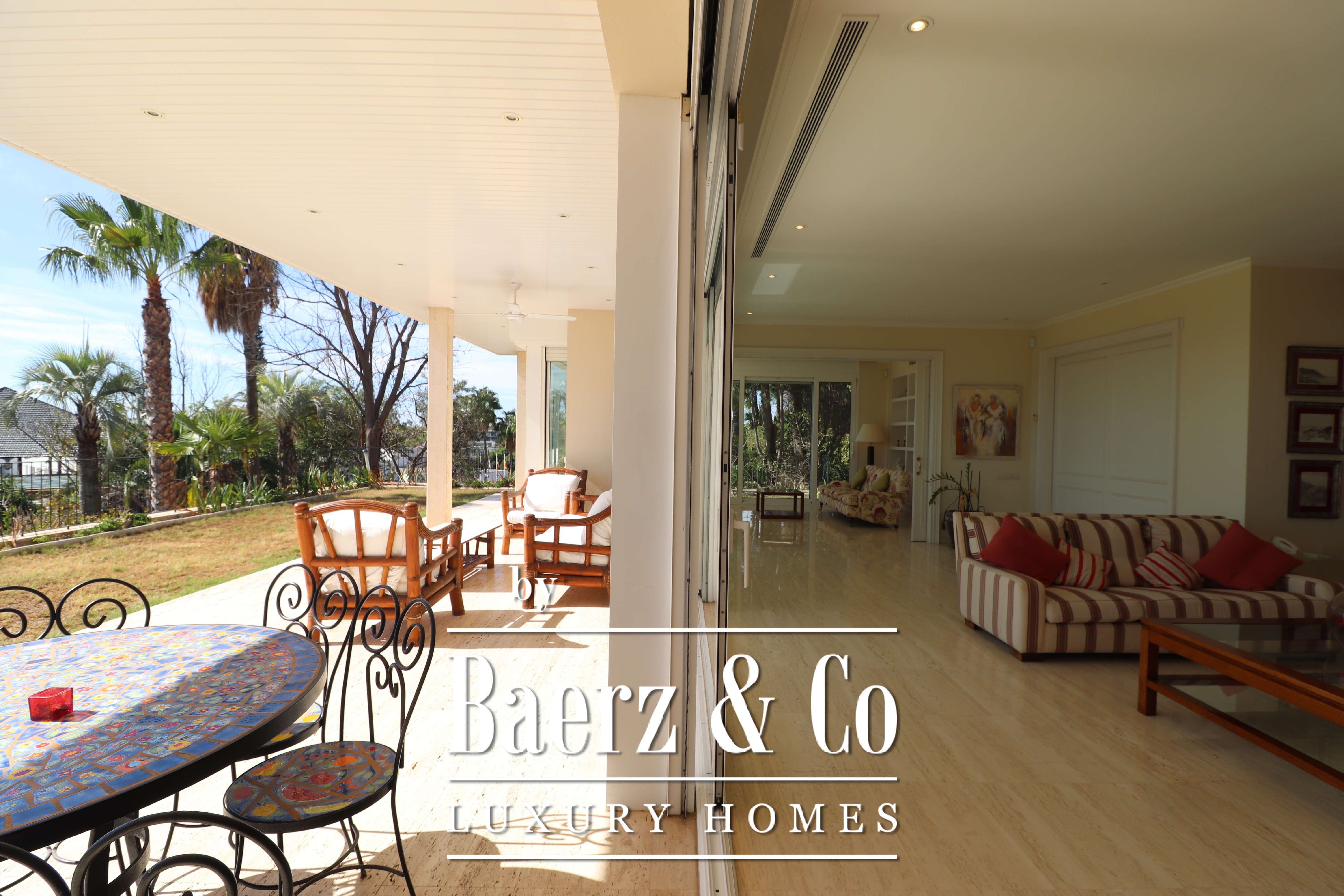 Designed for discretion and comfort, the villa unfolds across three levels, connected by a private lift. The main level opens with a refined entrance hall leading to a fluid living space, including living and dining rooms, a media zone, and a fully equipped kitchen with an adjoining service area and dedicated office. Five bedrooms and eight bathrooms allow for both family intimacy and entertaining on a generous scale.